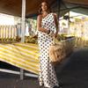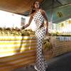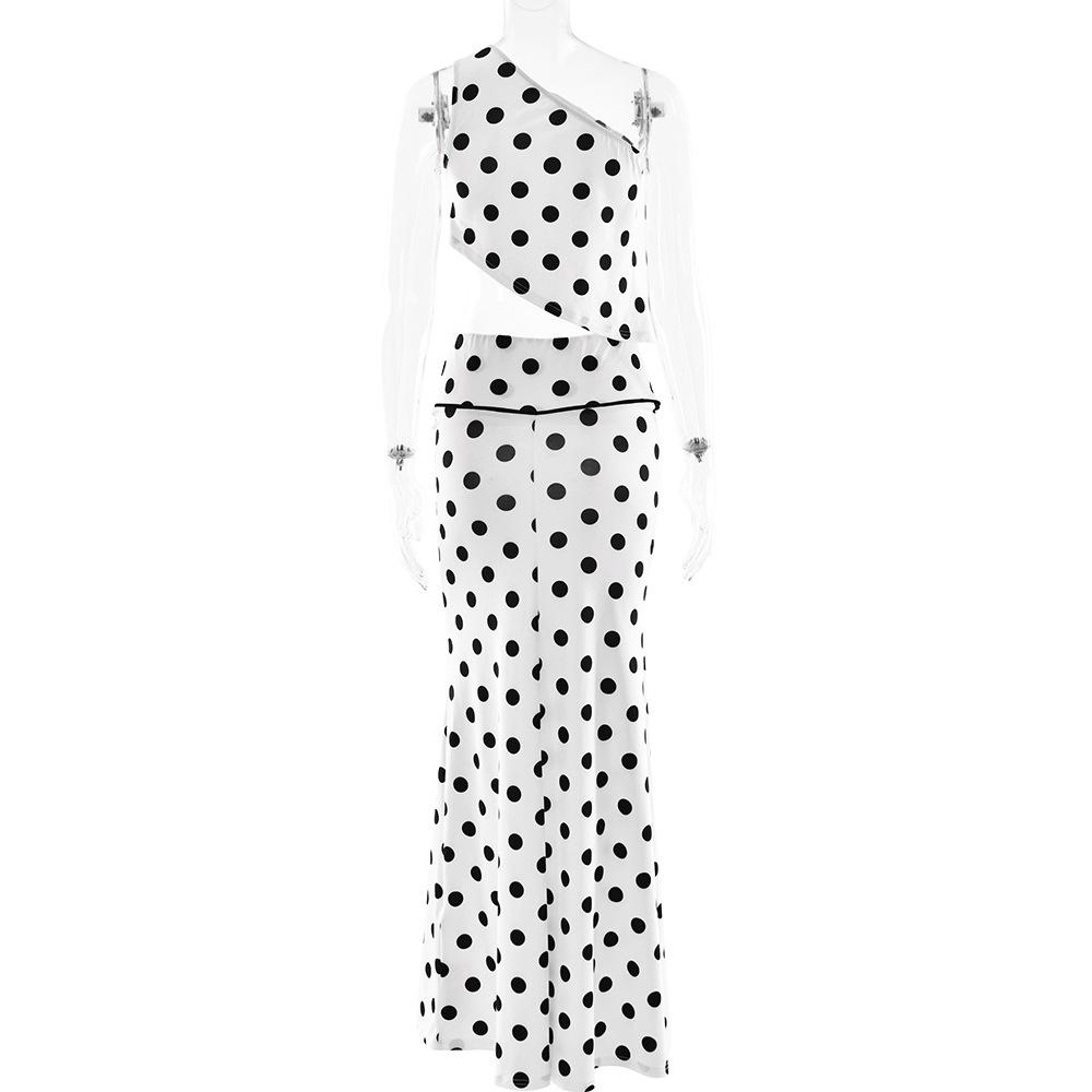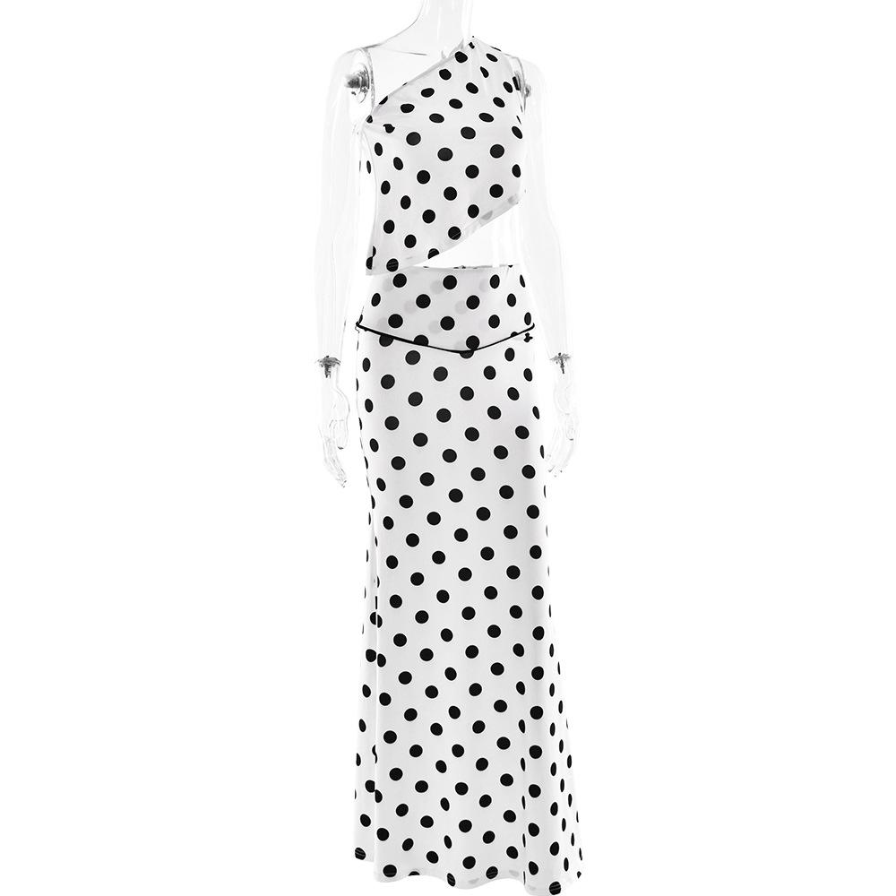 Estilo europeo y americano moda de comercio exterior superventas lunares un hombro temperamento adelgazante top sexy chica caliente ceñido a la cadera falda larga conjunto de dos piezas