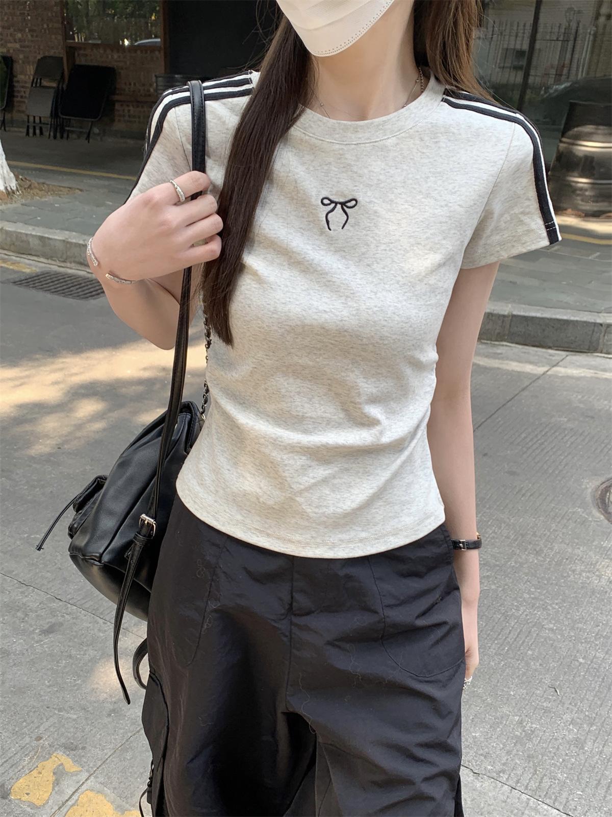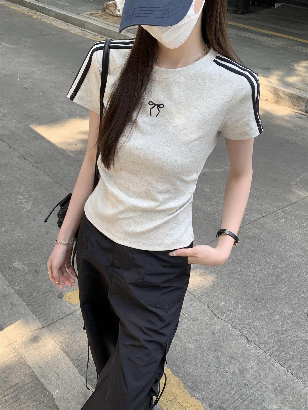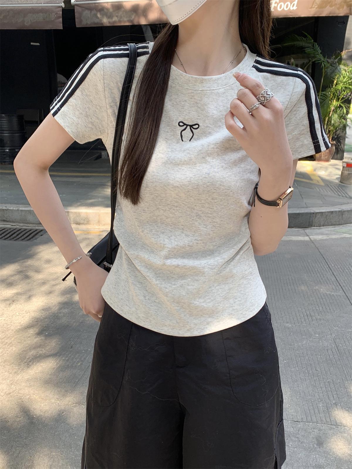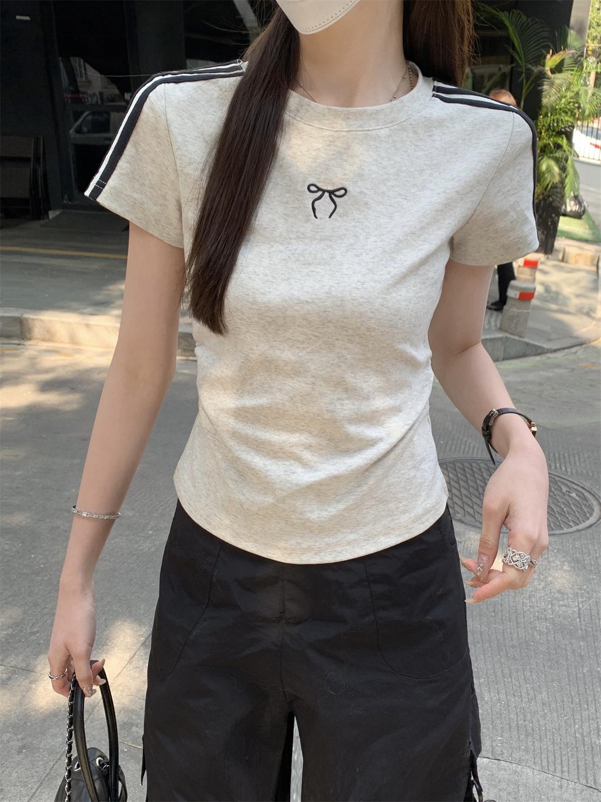 Foto Real de Verano Estilo Coreano Cuello Redondo Color Contrastante Diseño de Lazo de Barra en Hombro Derecho Camiseta de Manga Corta Top Ropa de Mujer 85327