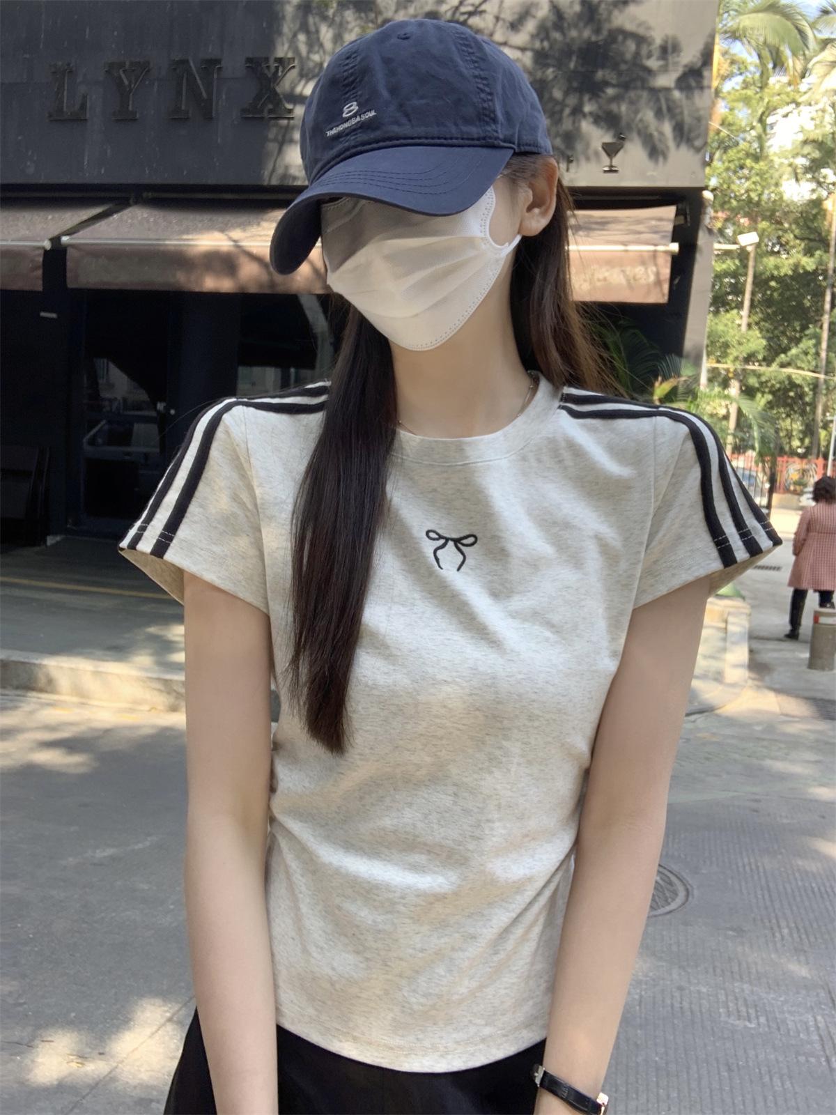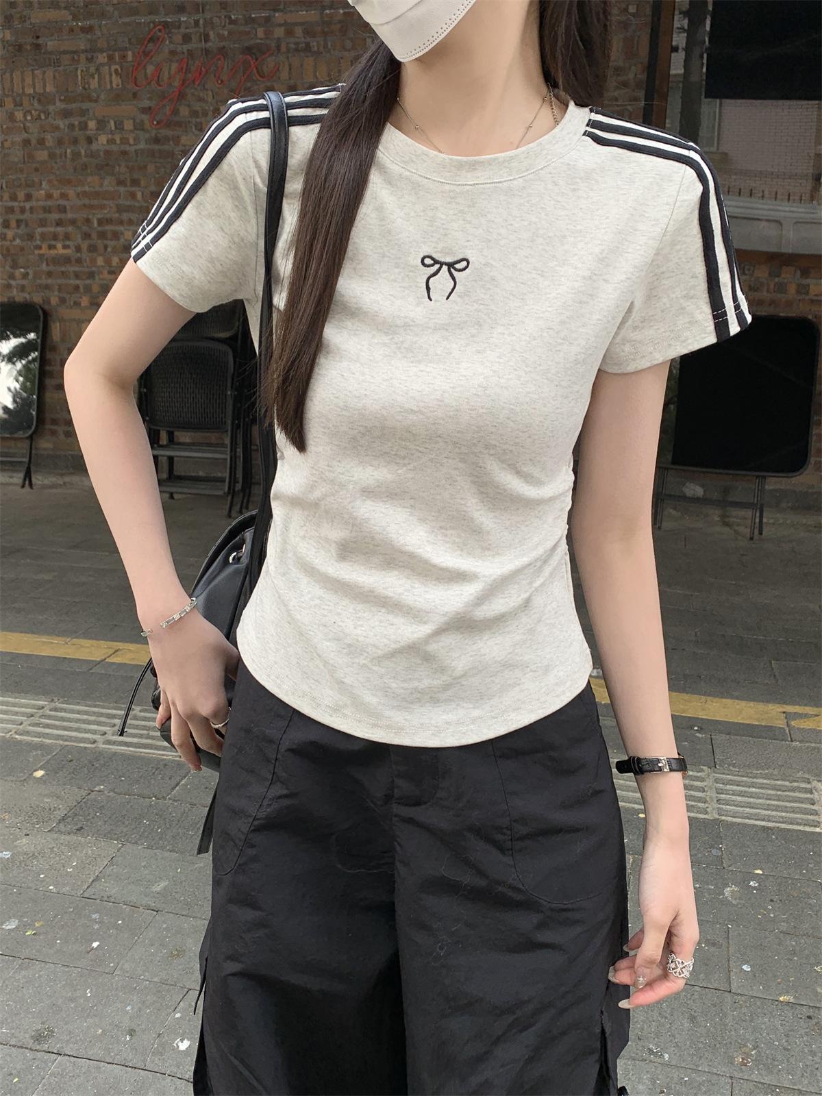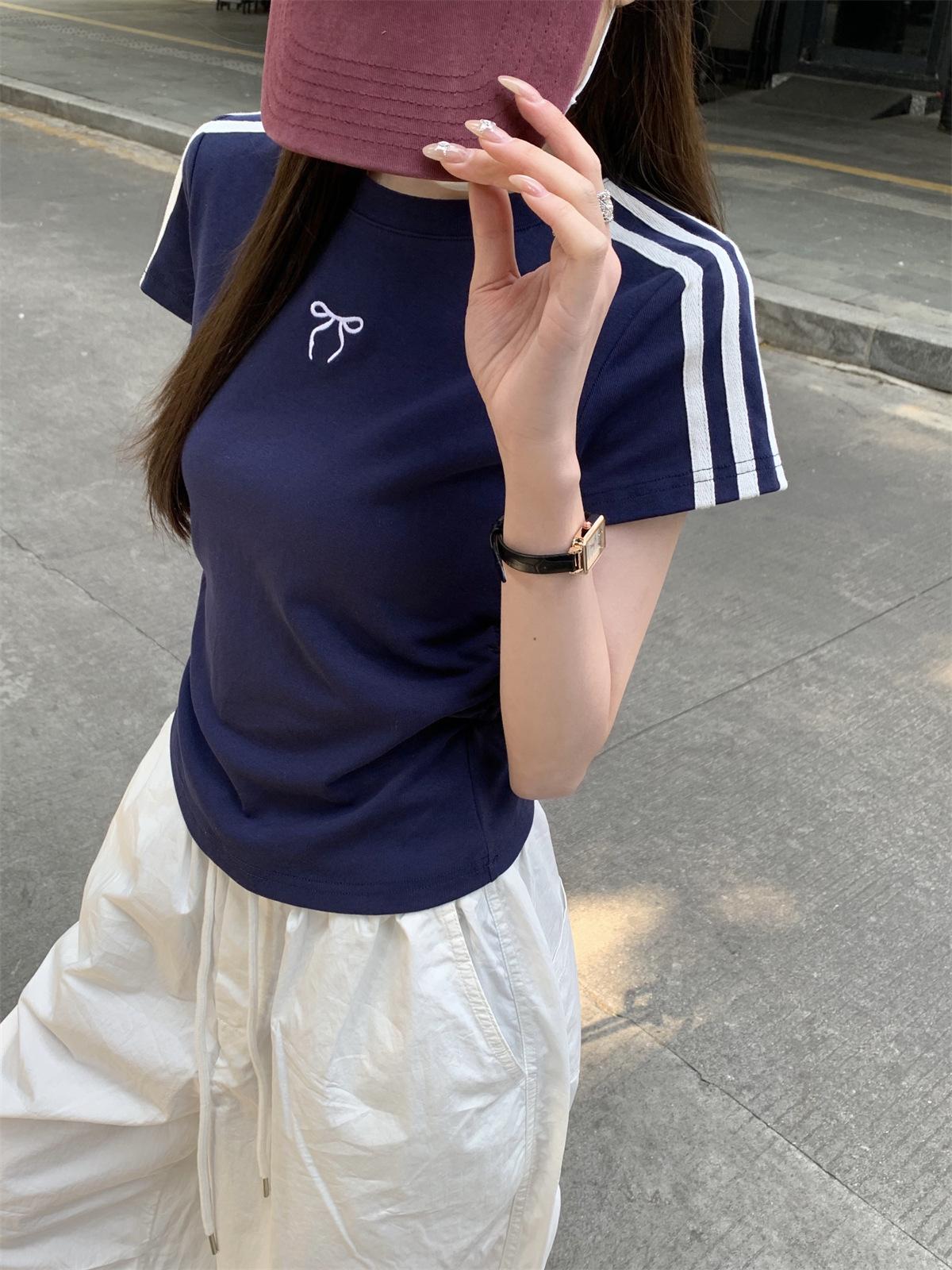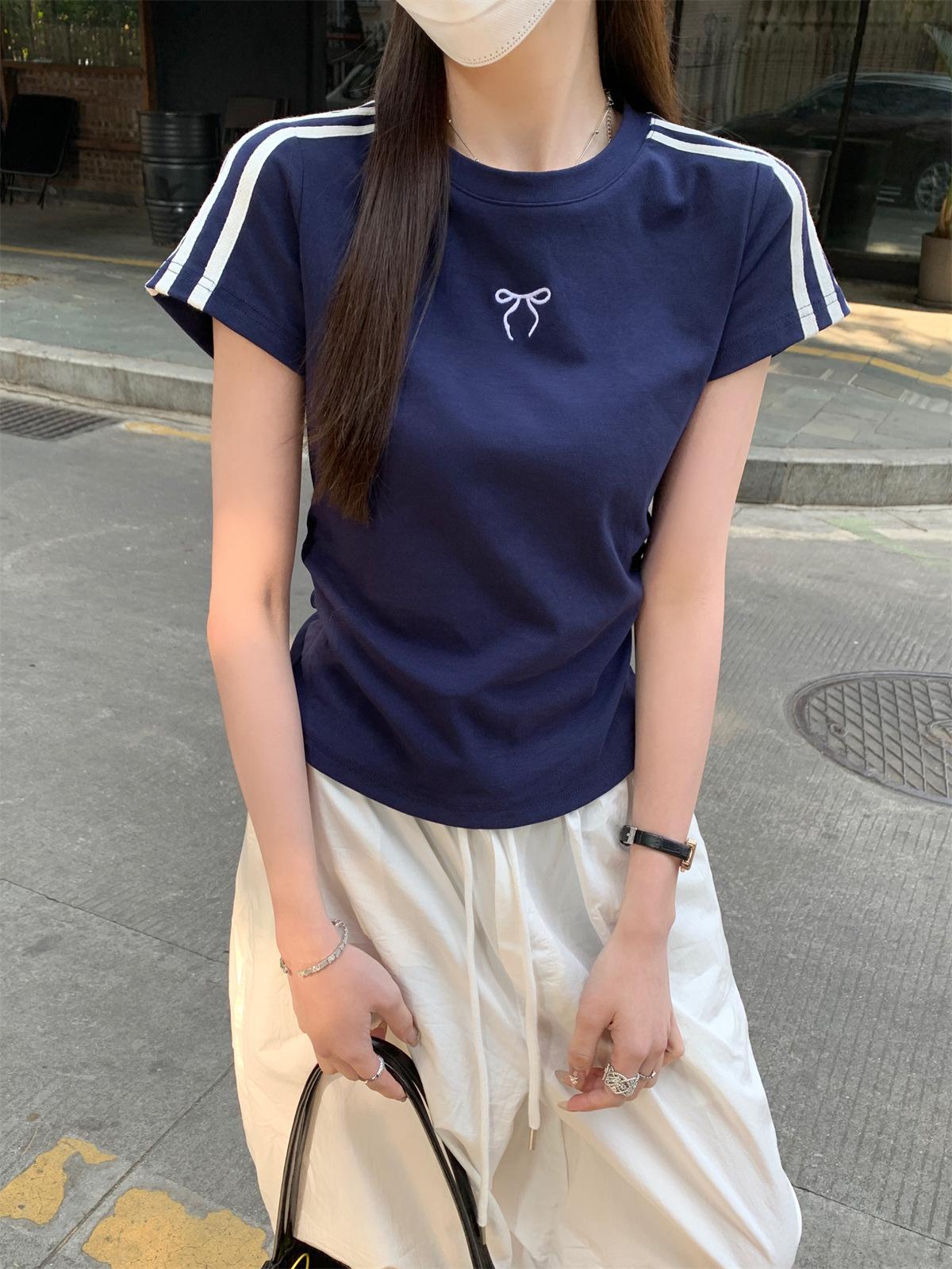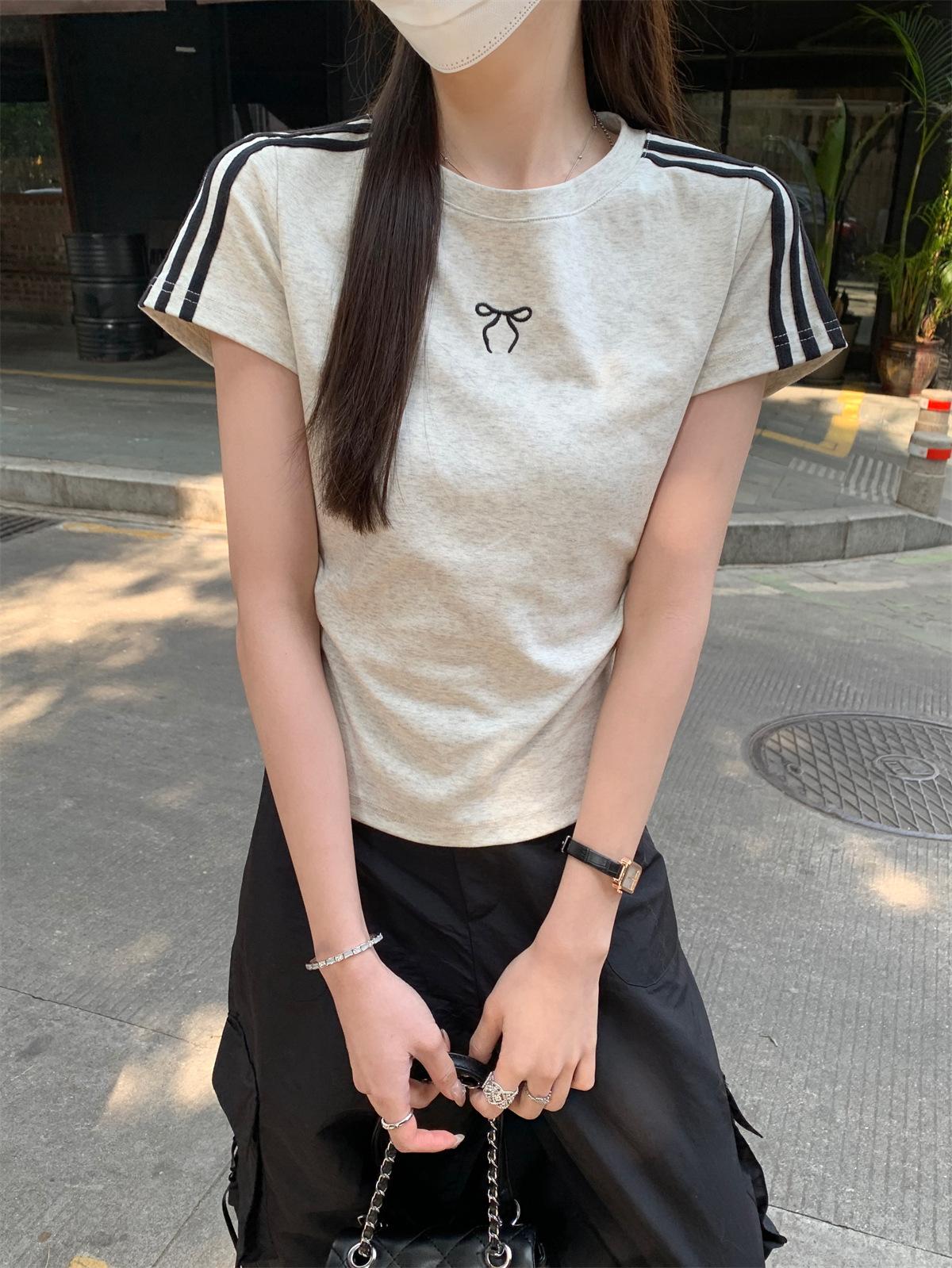 Foto Real de Verano Estilo Coreano Cuello Redondo Color Contrastante Diseño de Lazo de Barra en Hombro Derecho Camiseta de Manga Corta Top Ropa de Mujer 85327