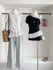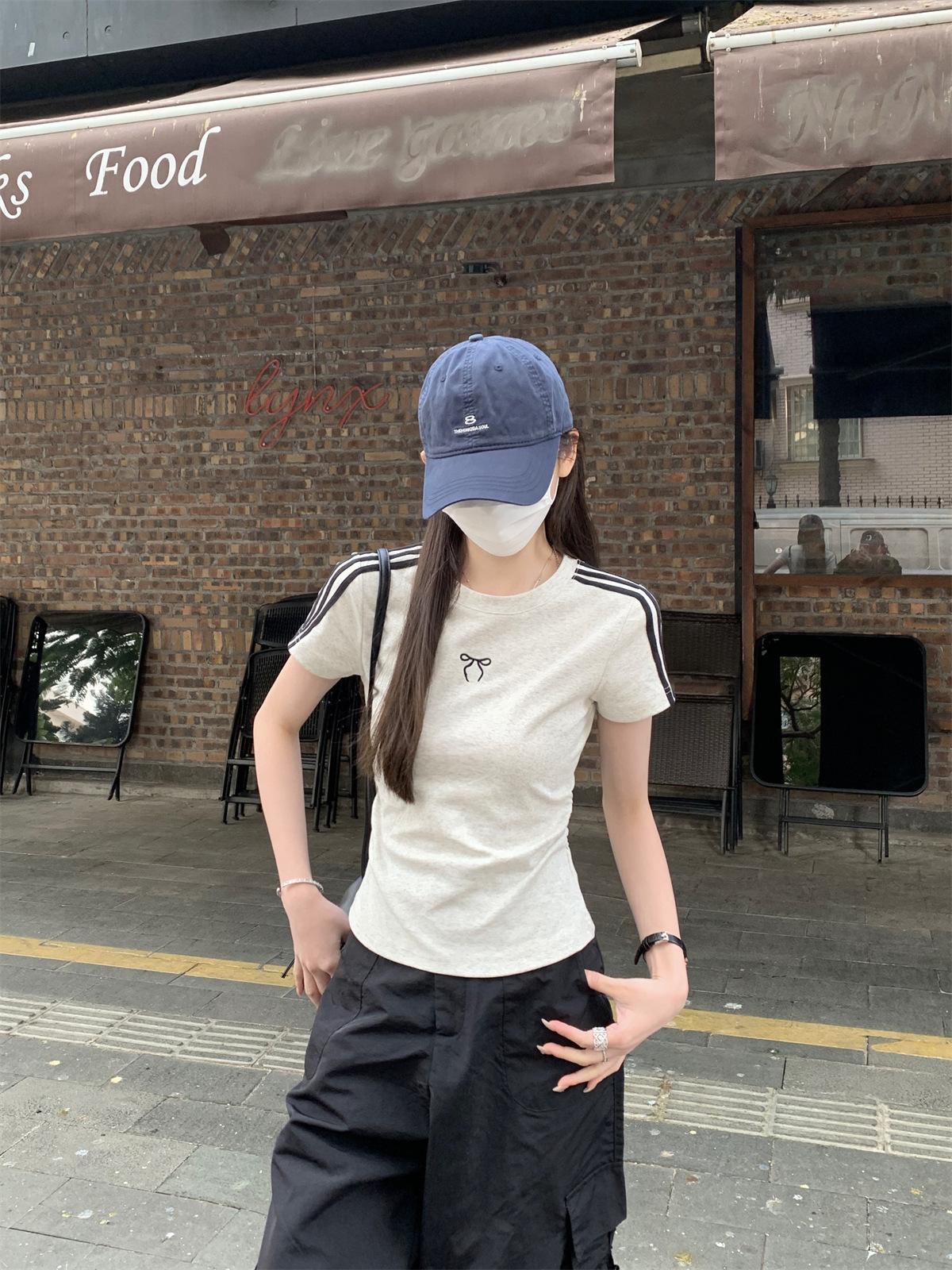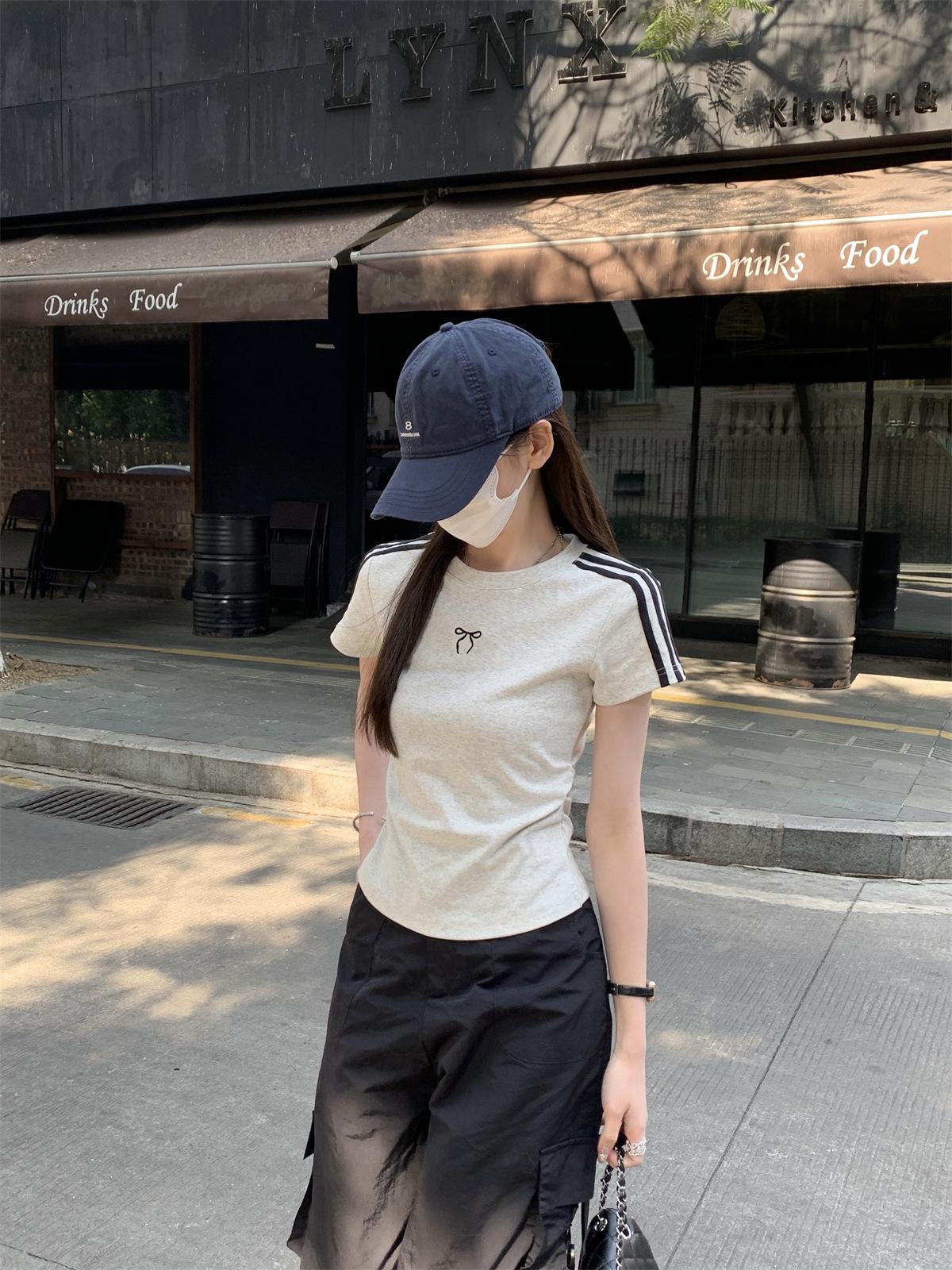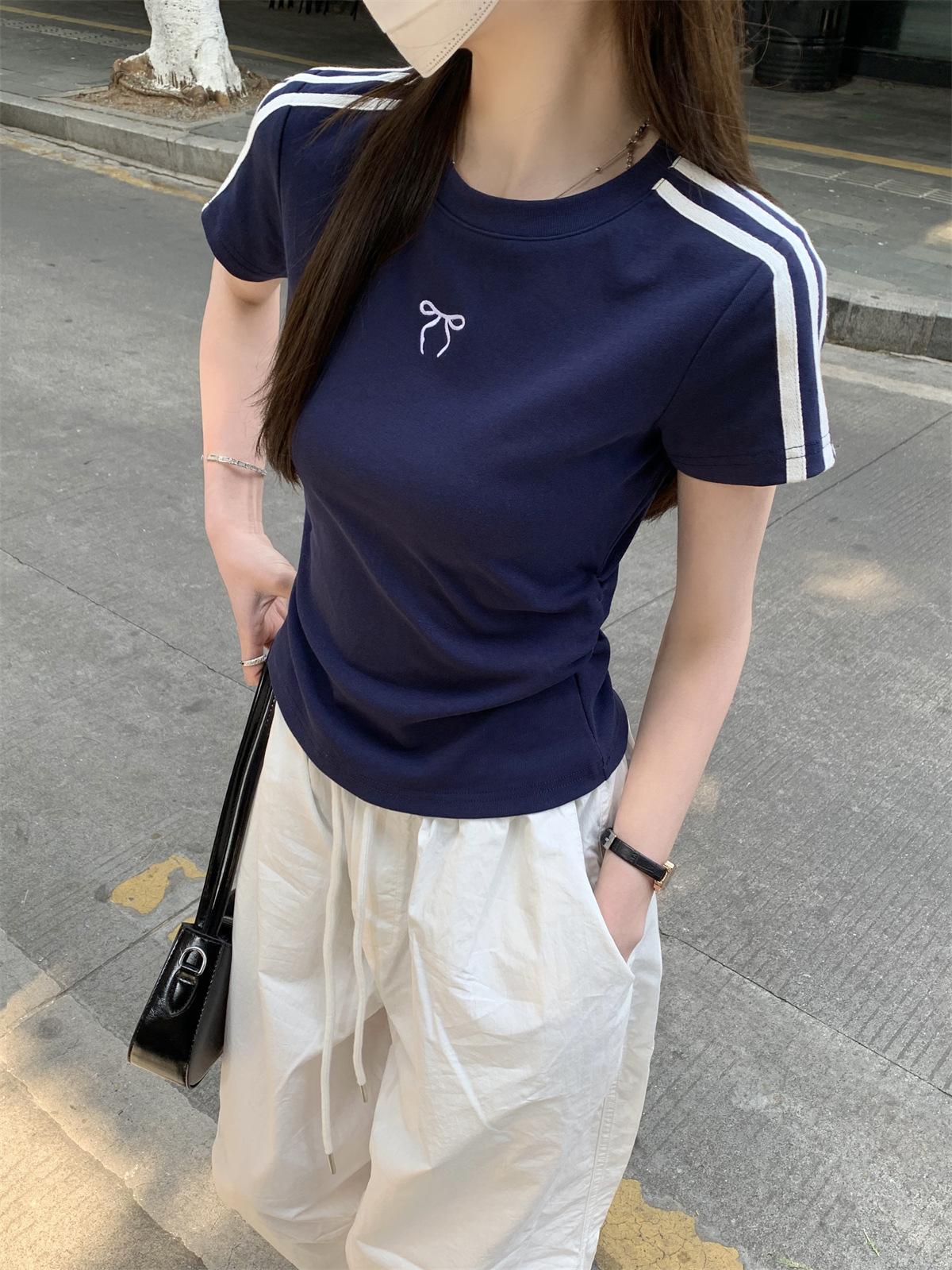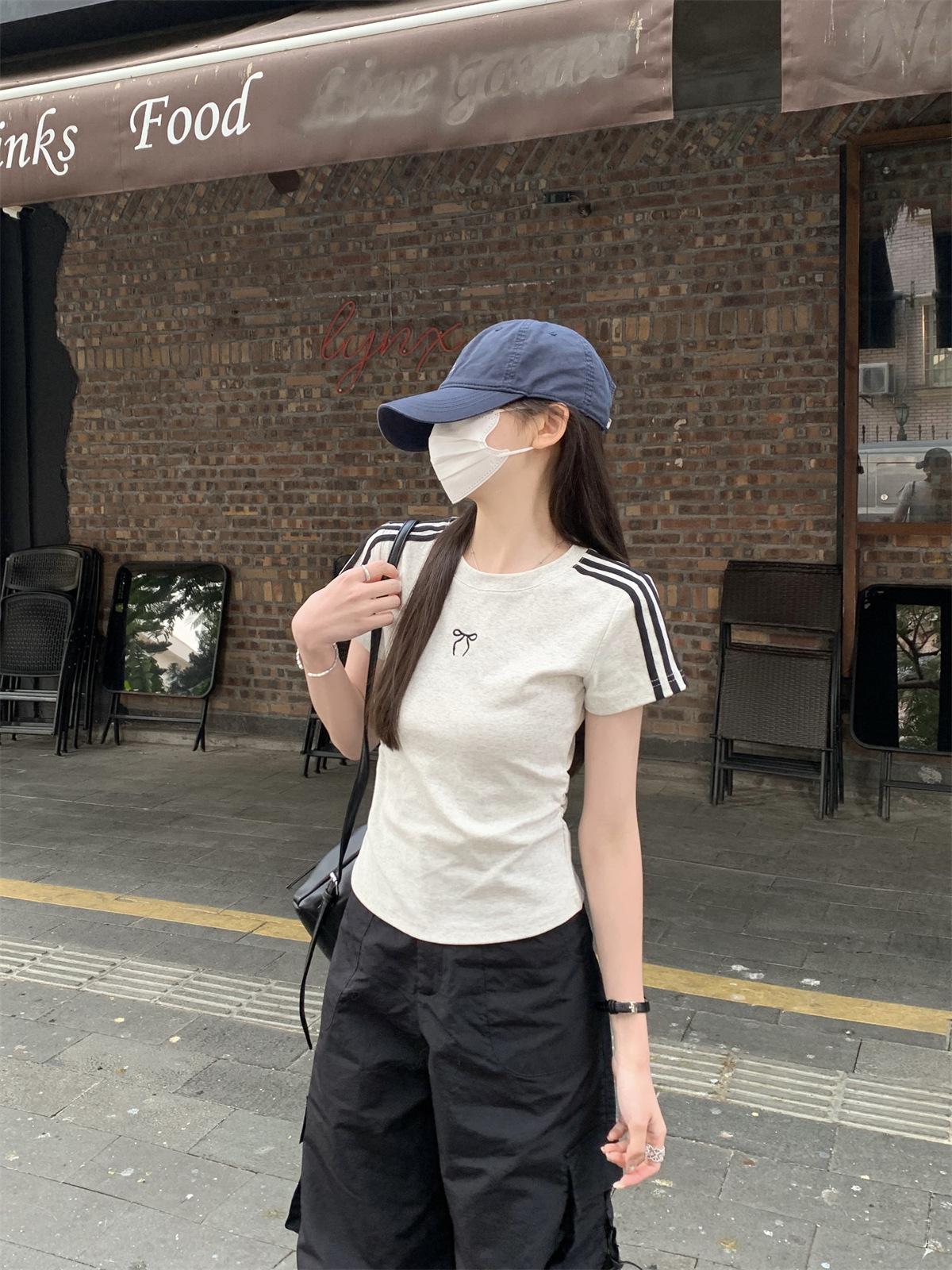 Foto Real de Verano Estilo Coreano Cuello Redondo Color Contrastante Diseño de Lazo de Barra en Hombro Derecho Camiseta de Manga Corta Top Ropa de Mujer 85327