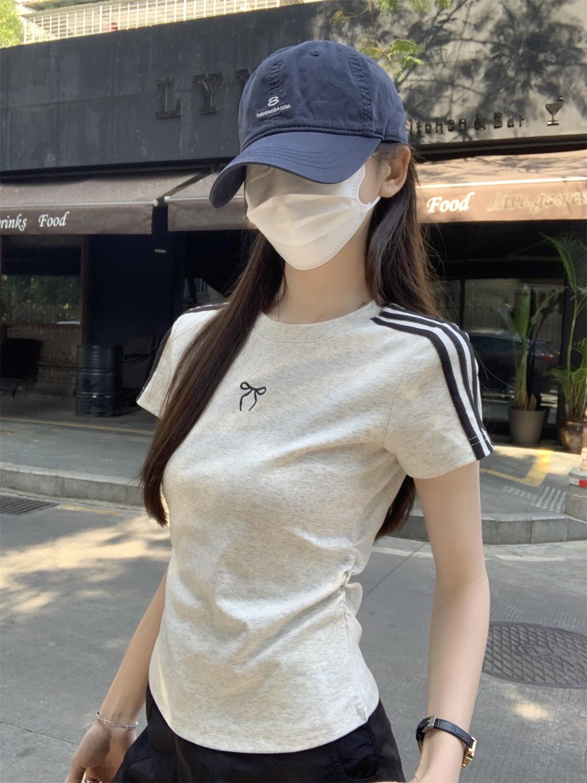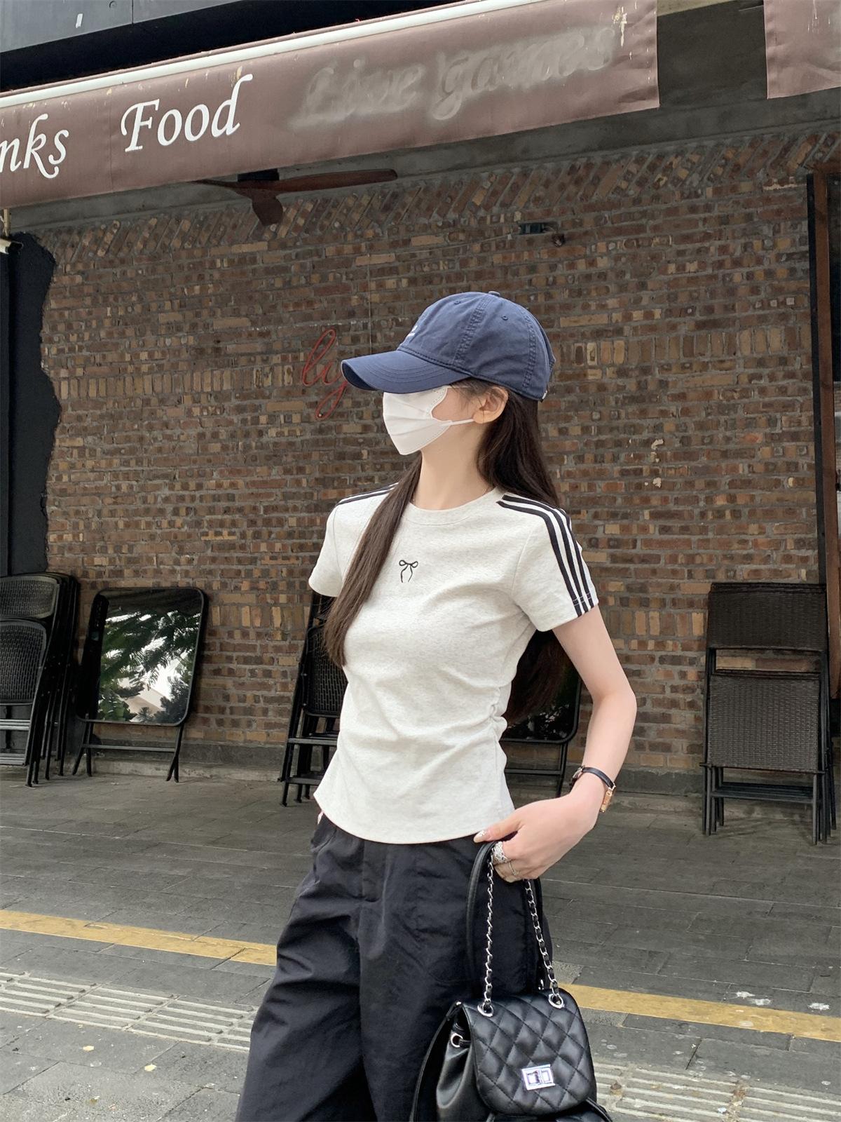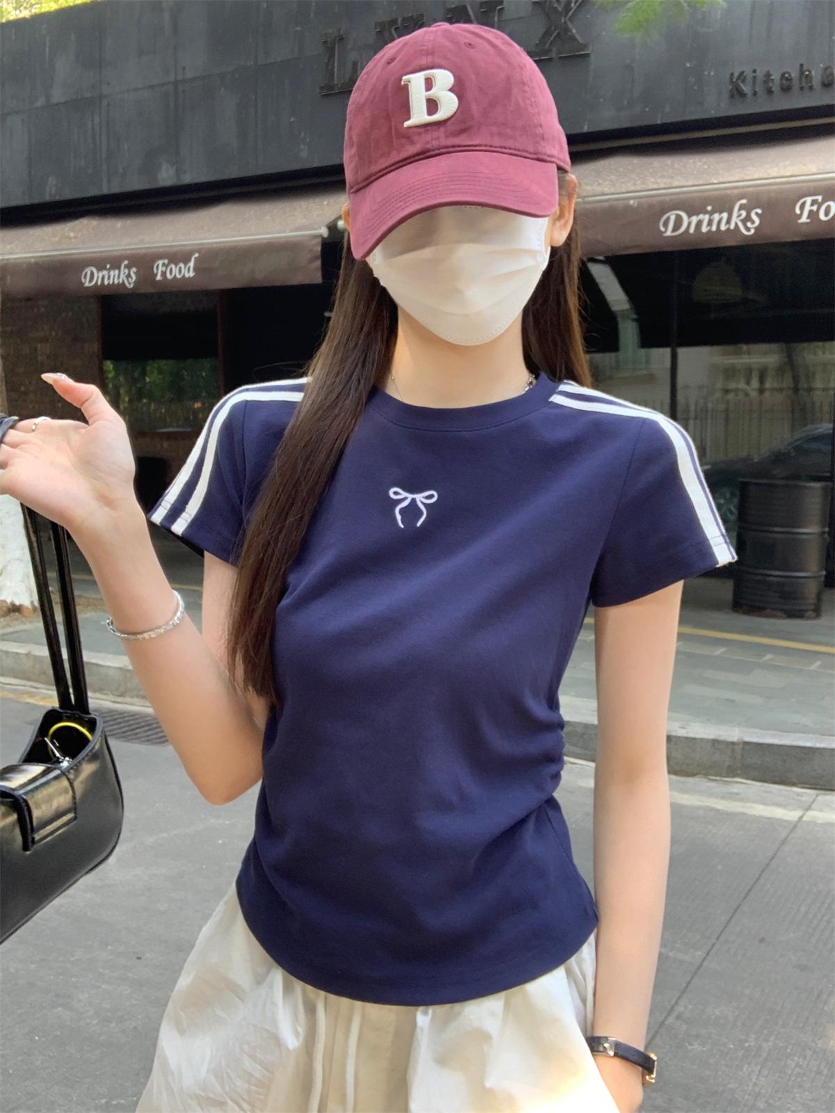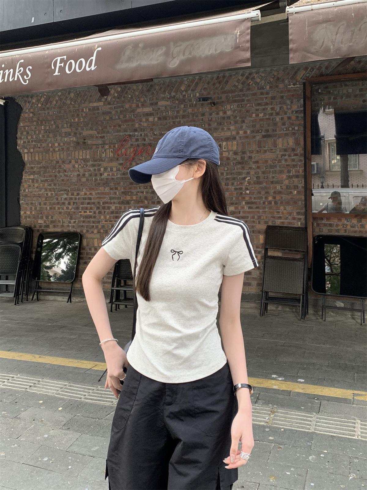 Foto Real de Verano Estilo Coreano Cuello Redondo Color Contrastante Diseño de Lazo de Barra en Hombro Derecho Camiseta de Manga Corta Top Ropa de Mujer 85327