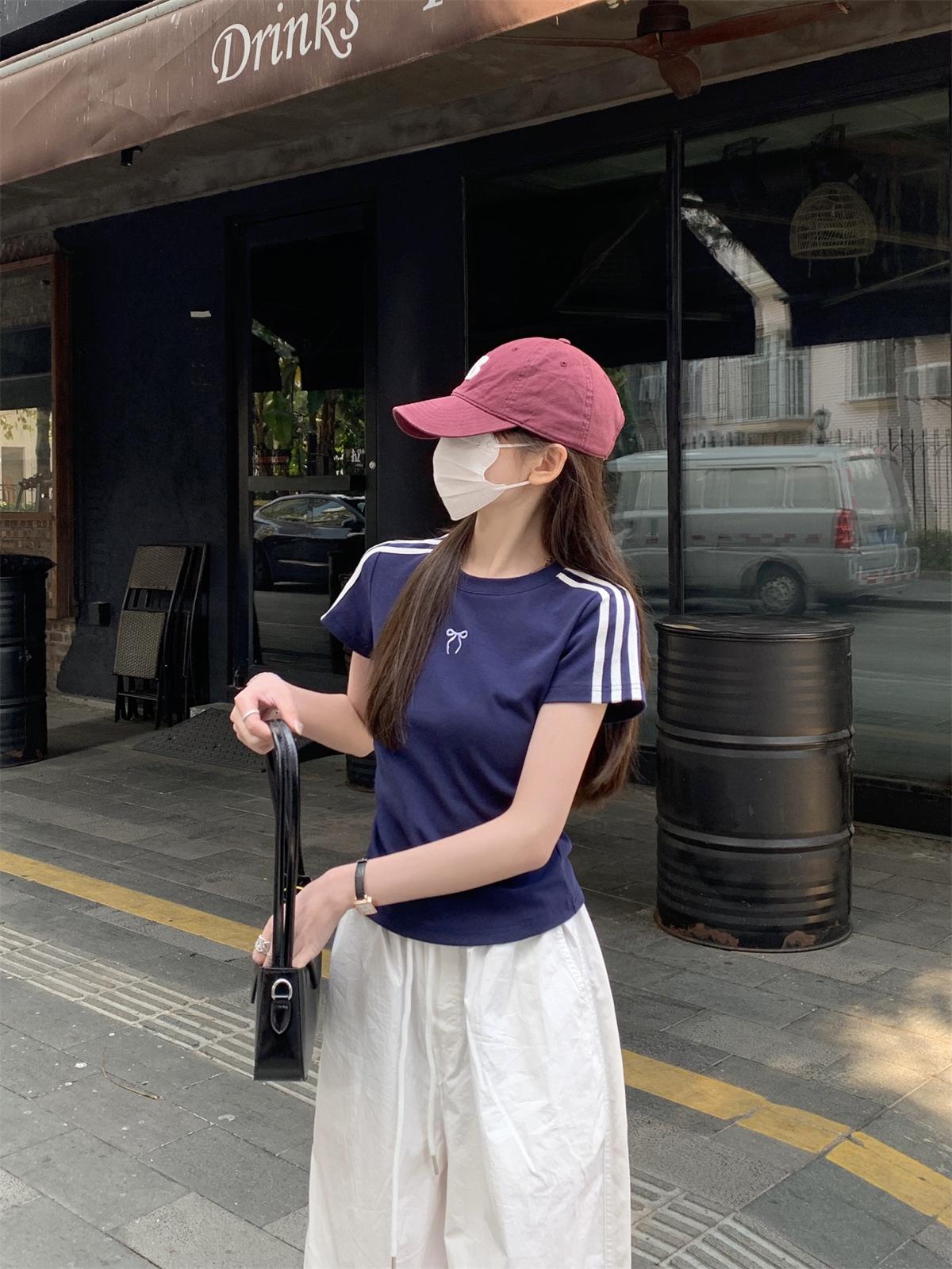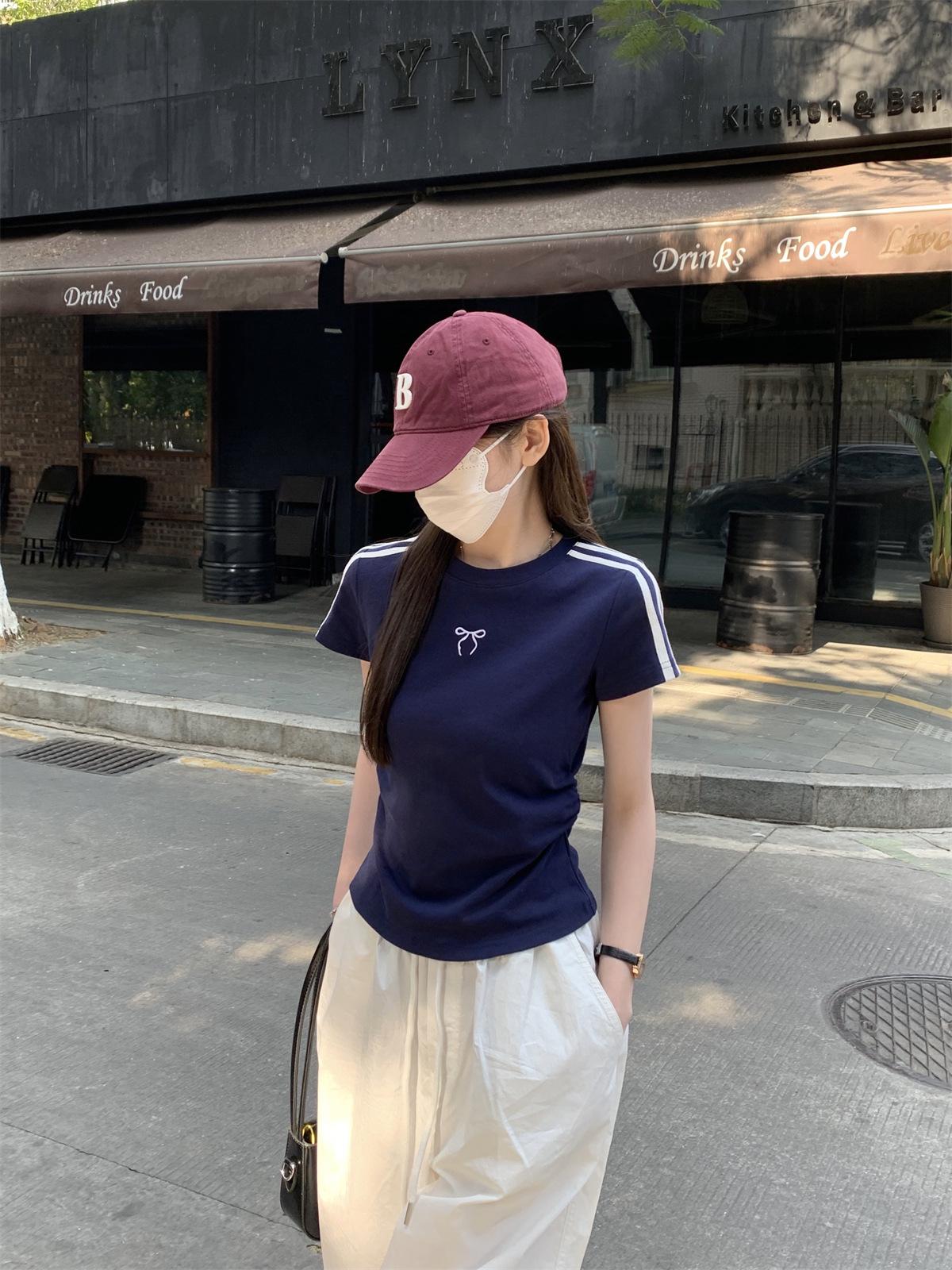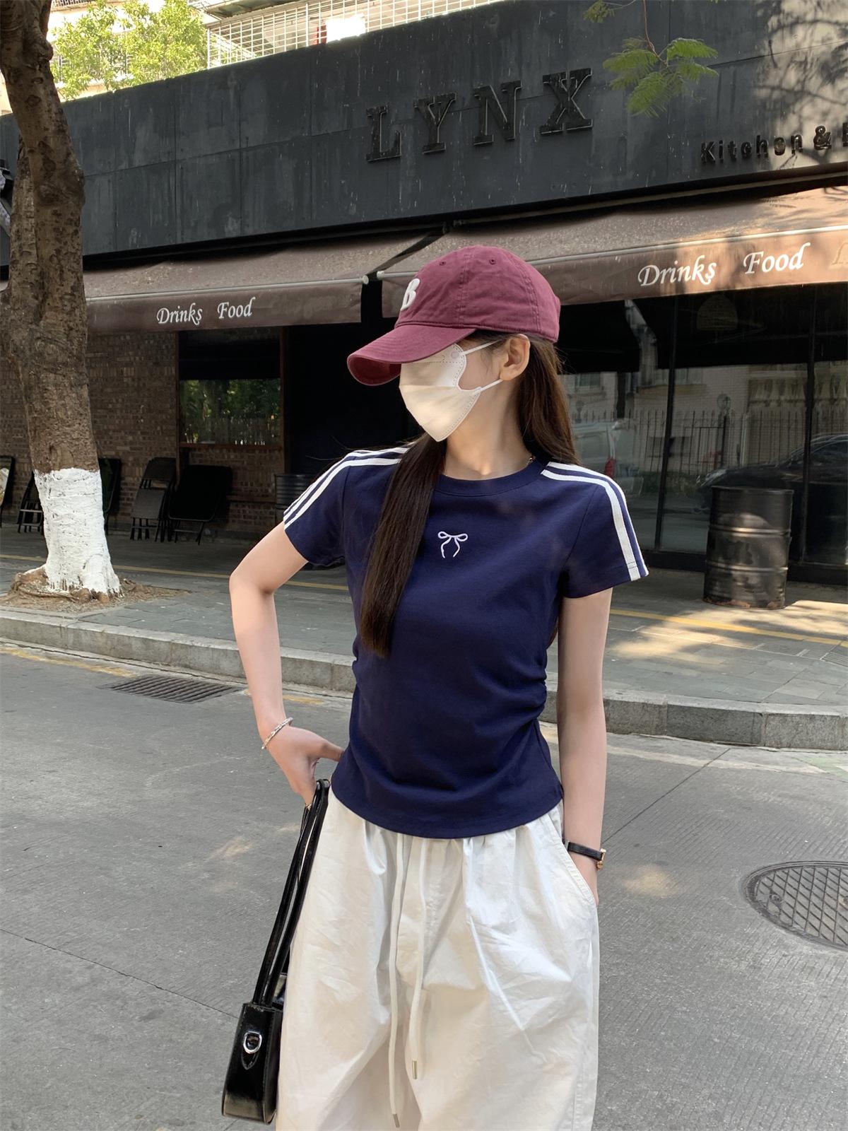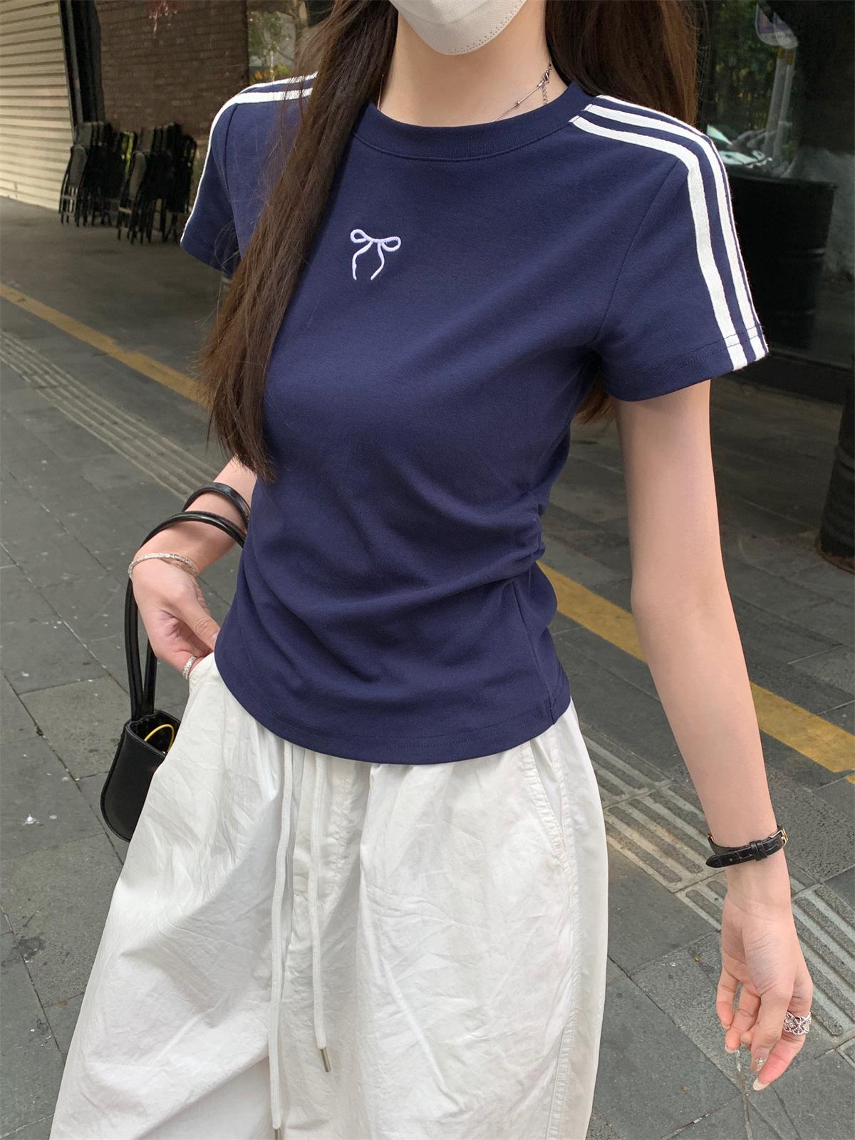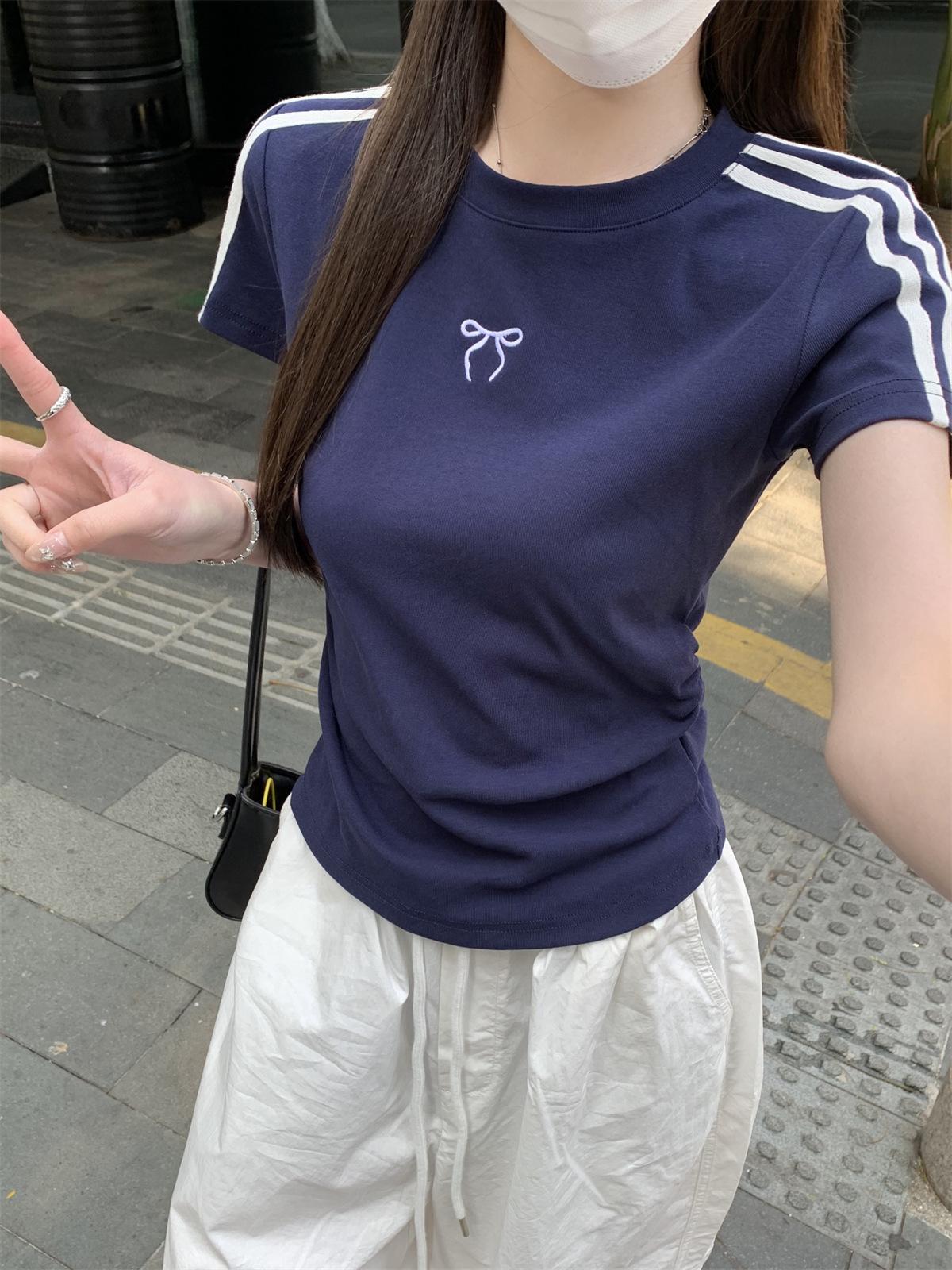 Foto Real de Verano Estilo Coreano Cuello Redondo Color Contrastante Diseño de Lazo de Barra en Hombro Derecho Camiseta de Manga Corta Top Ropa de Mujer 85327