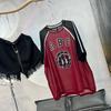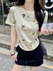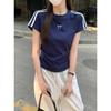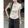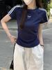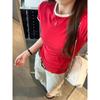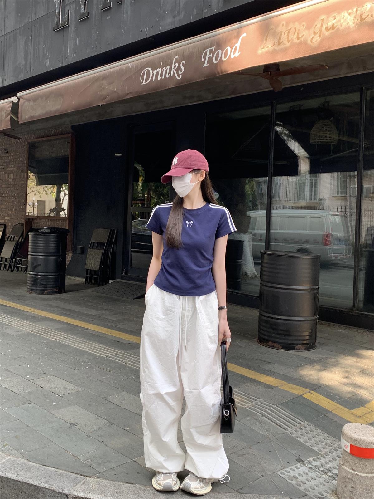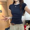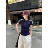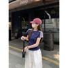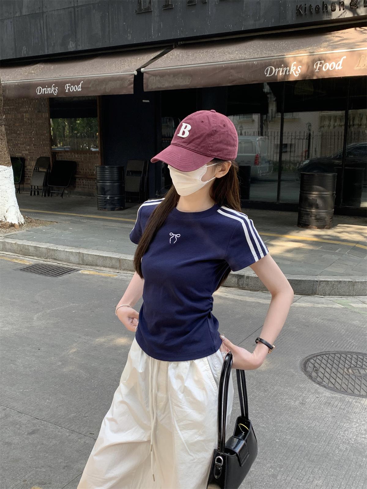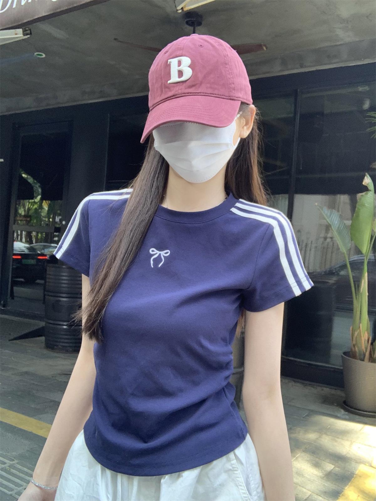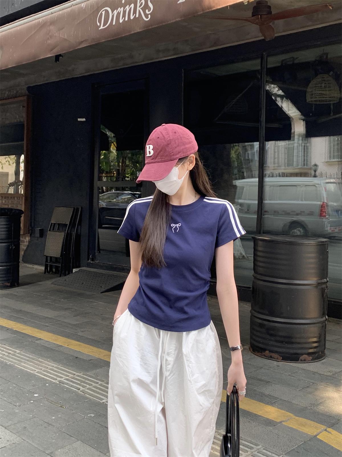 Foto Real de Verano Estilo Coreano Cuello Redondo Color Contrastante Diseño de Lazo de Barra en Hombro Derecho Camiseta de Manga Corta Top Ropa de Mujer 85327