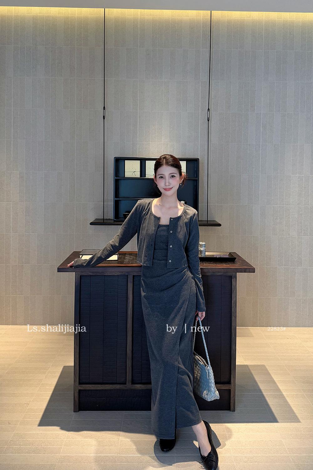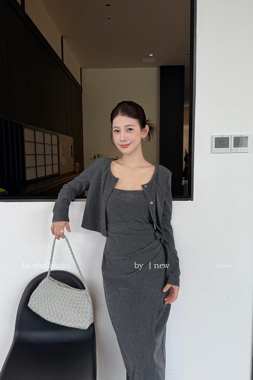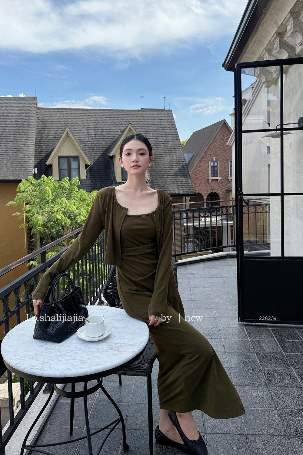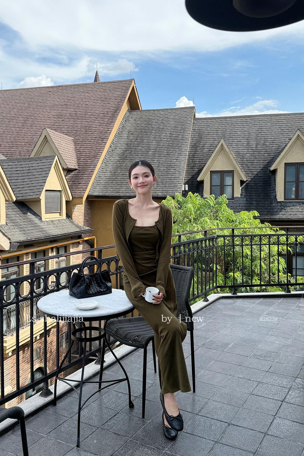 Set Cárdigan Elegante LS + Vestido Slip Guangzhou Thirteen Rows 2025 Principios de Otoño Nueva Ropa de Mujer 22823#