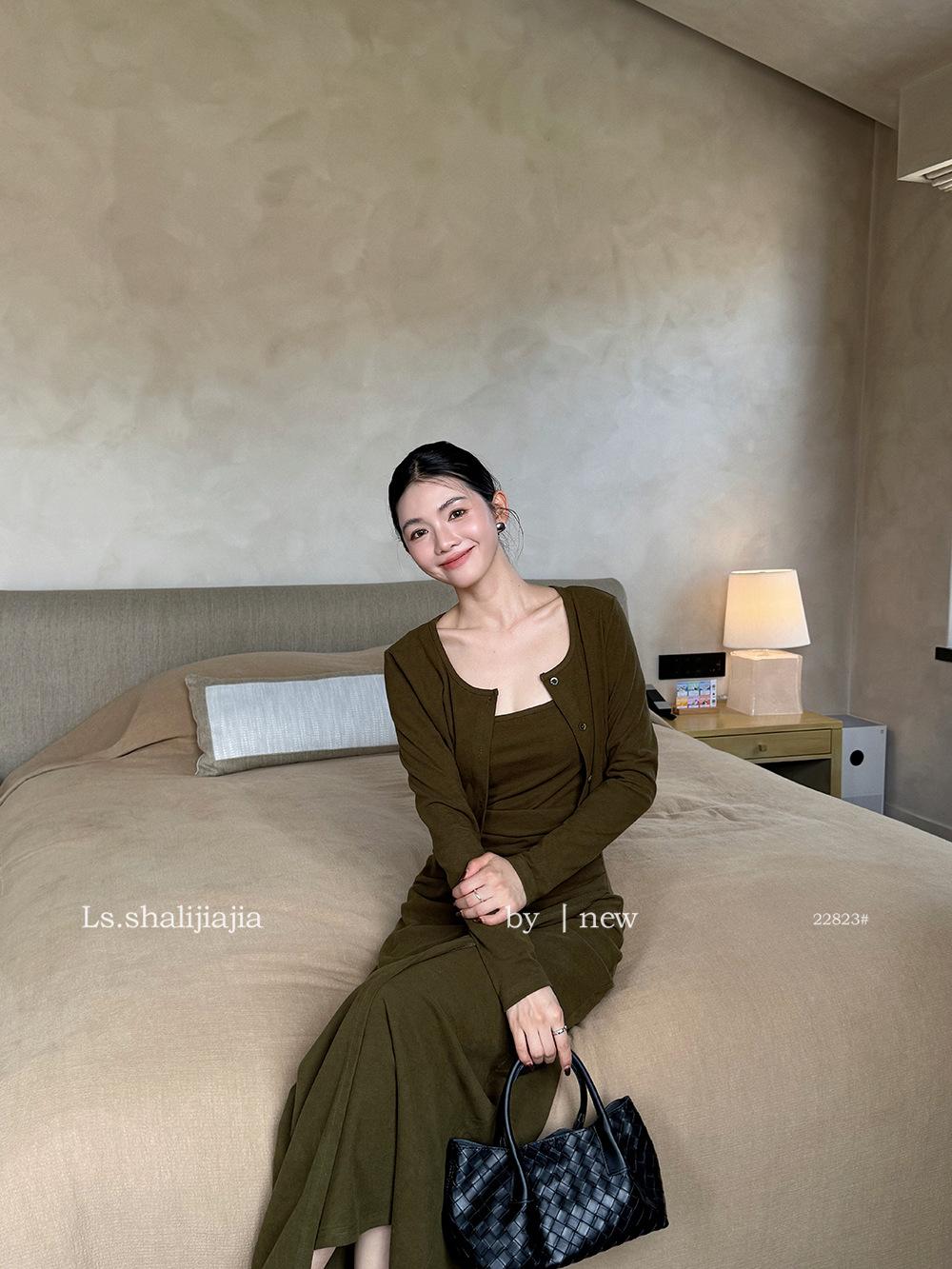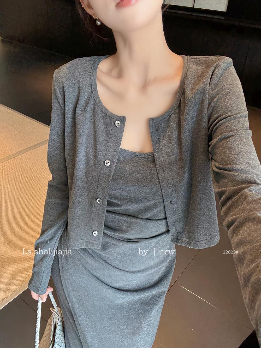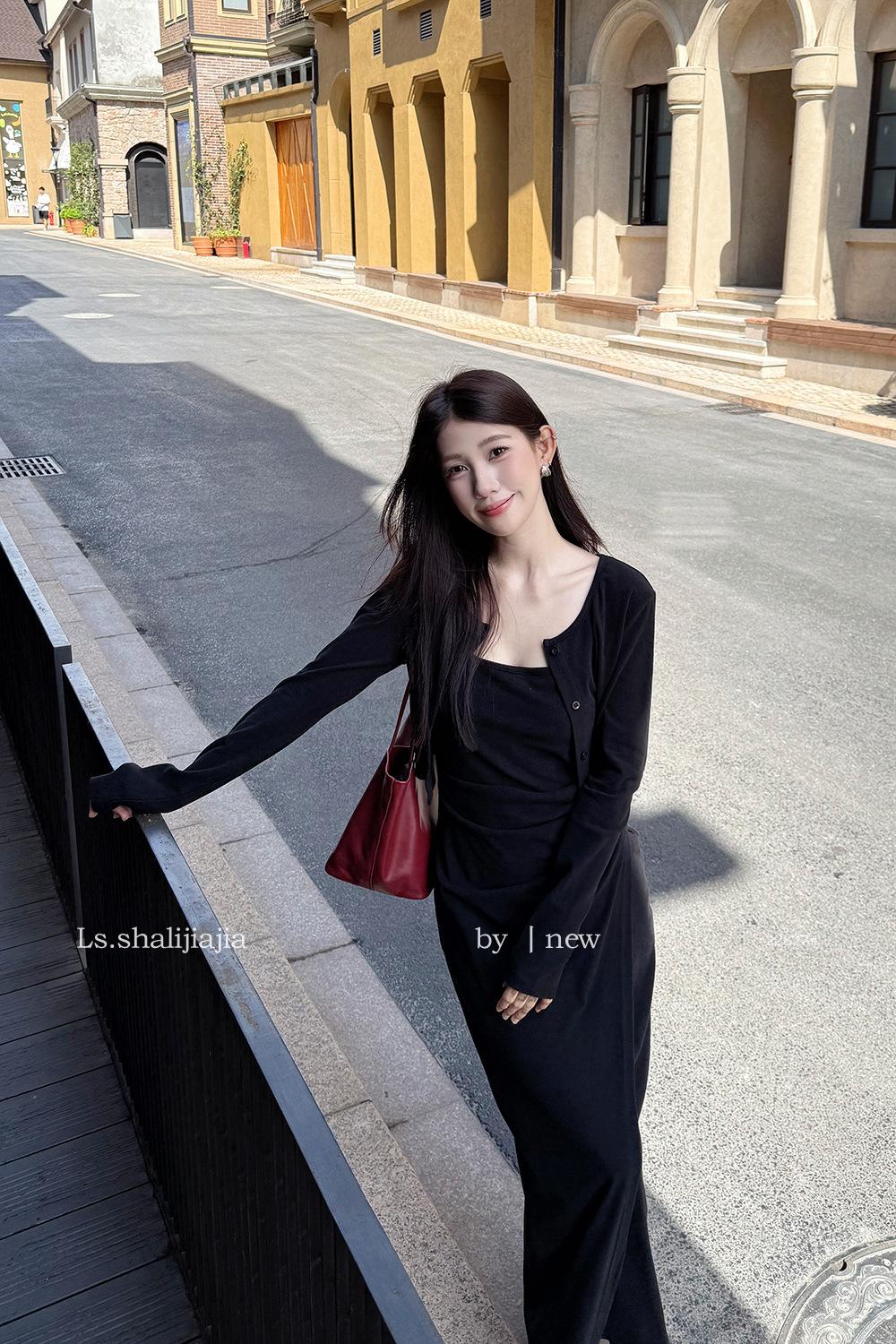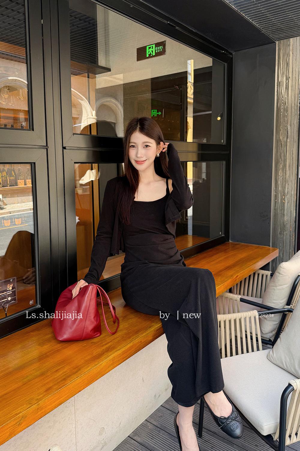 Set Cárdigan Elegante LS + Vestido Slip Guangzhou Thirteen Rows 2025 Principios de Otoño Nueva Ropa de Mujer 22823#