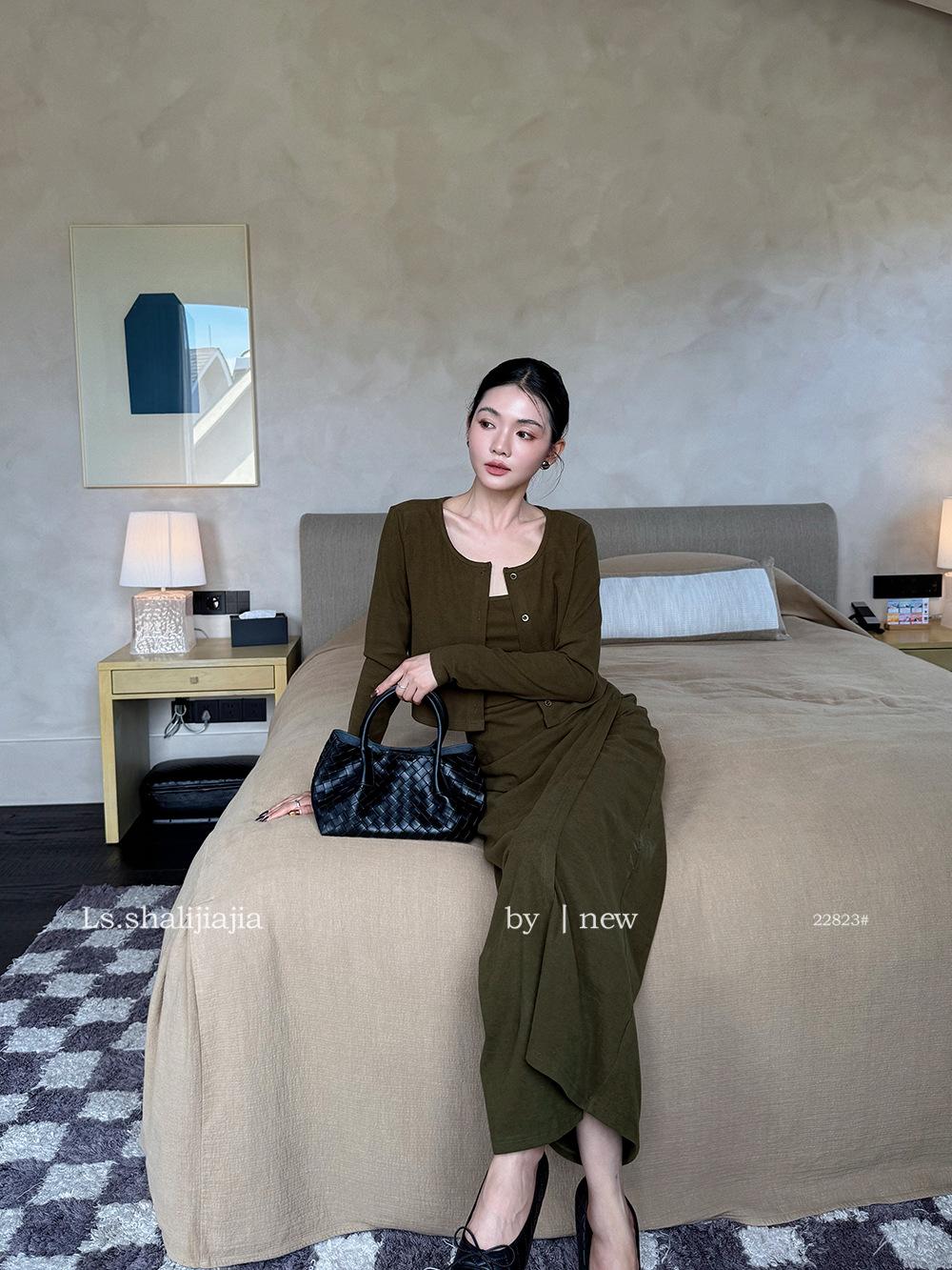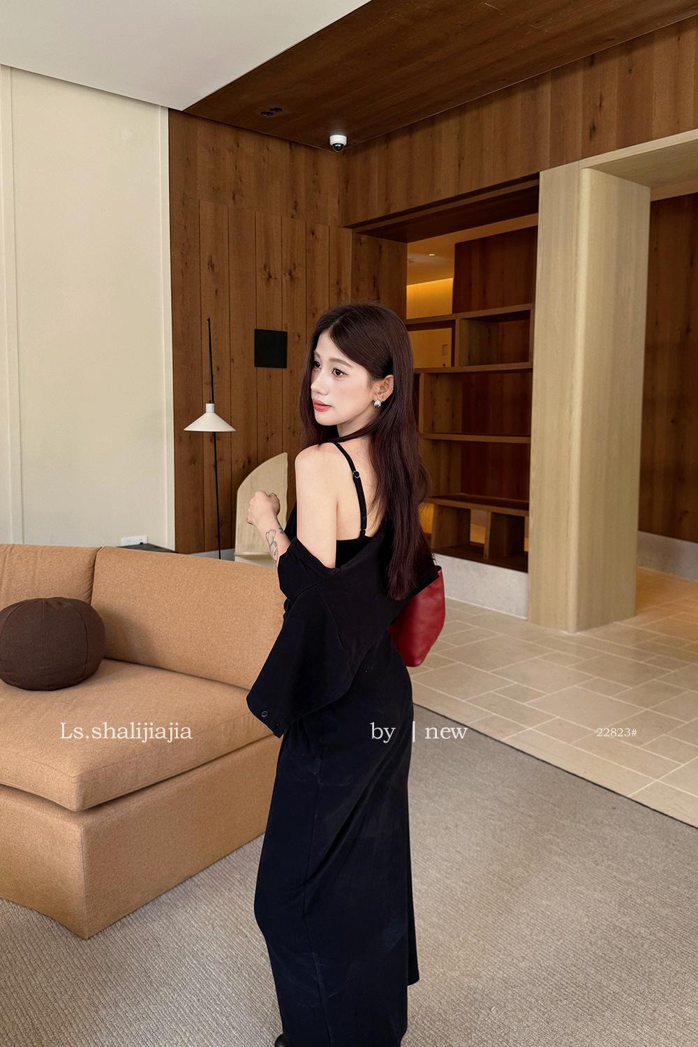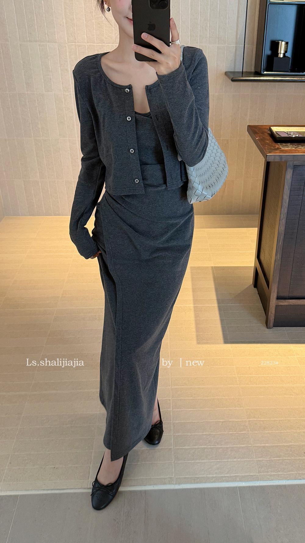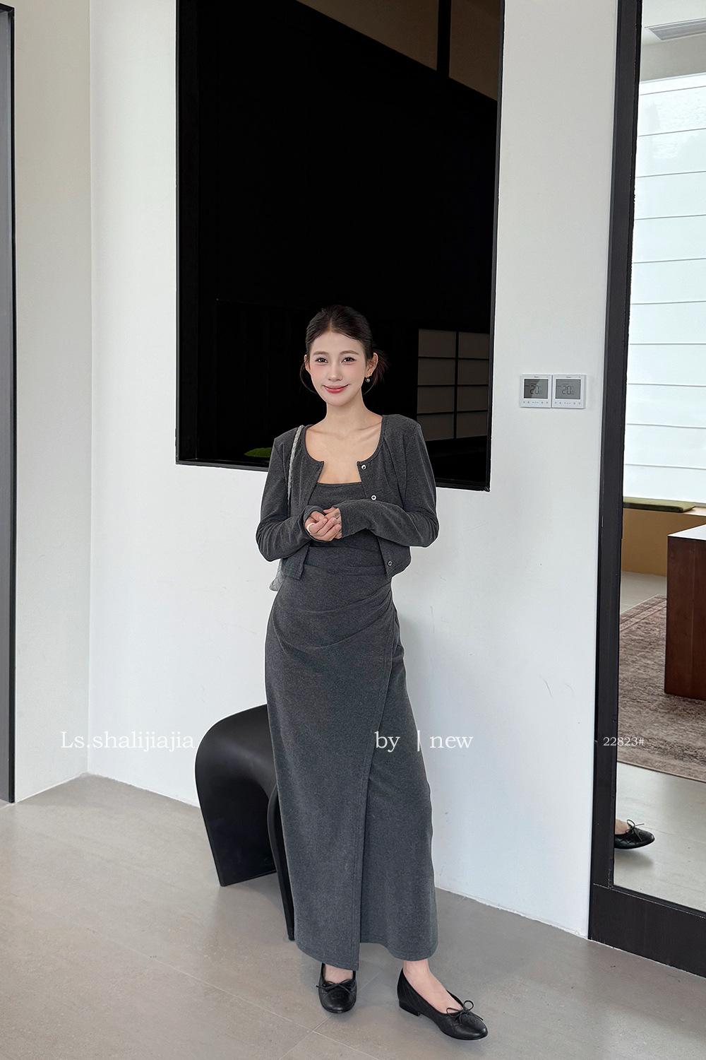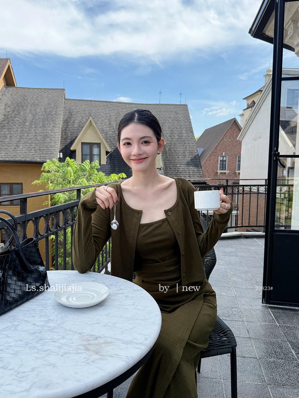 Set Cárdigan Elegante LS + Vestido Slip Guangzhou Thirteen Rows 2025 Principios de Otoño Nueva Ropa de Mujer 22823#