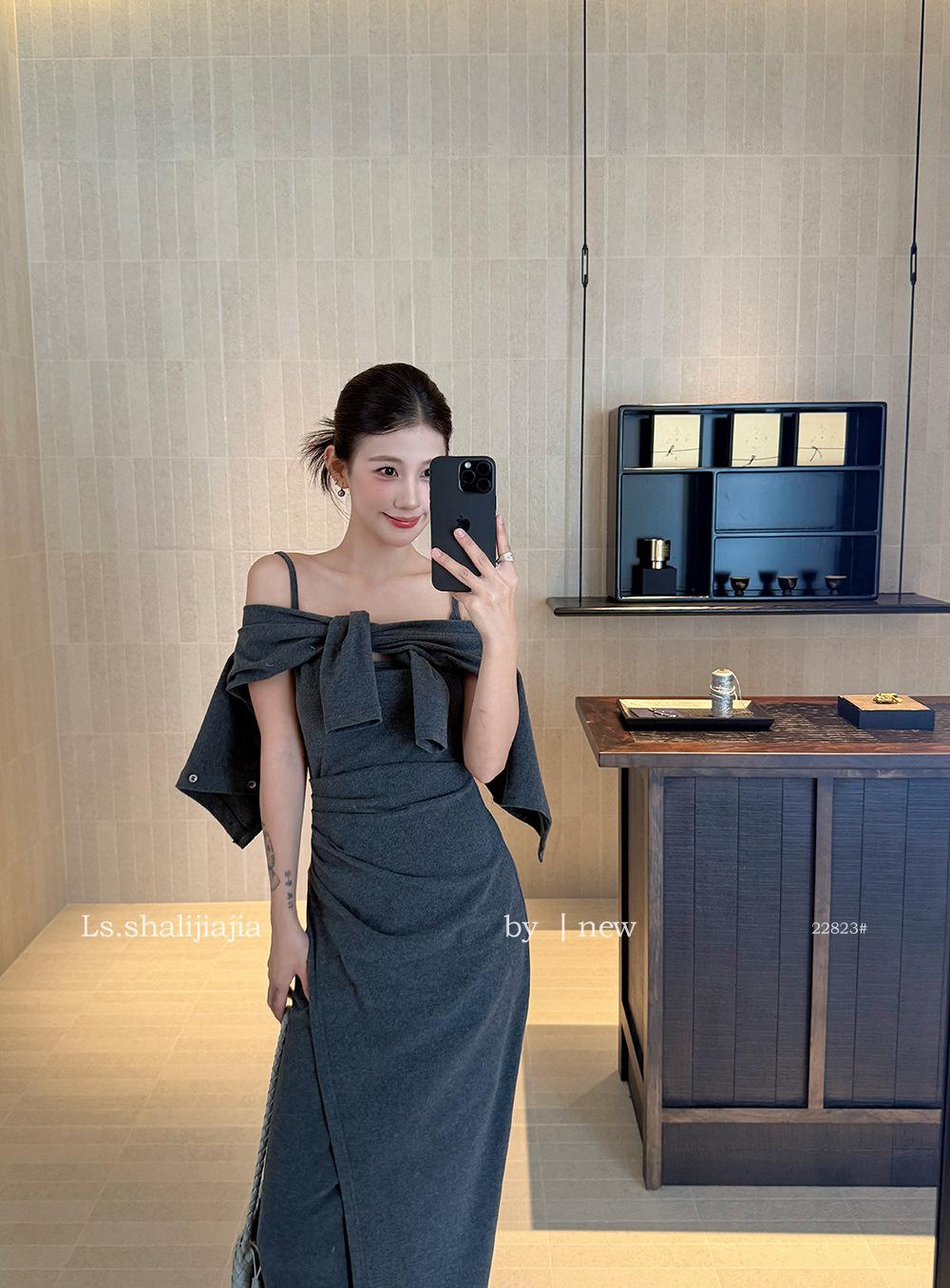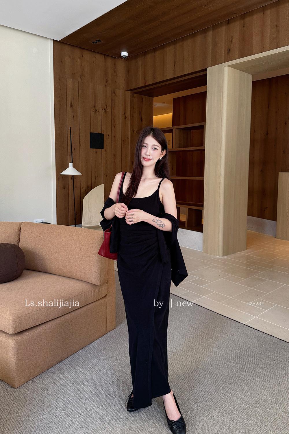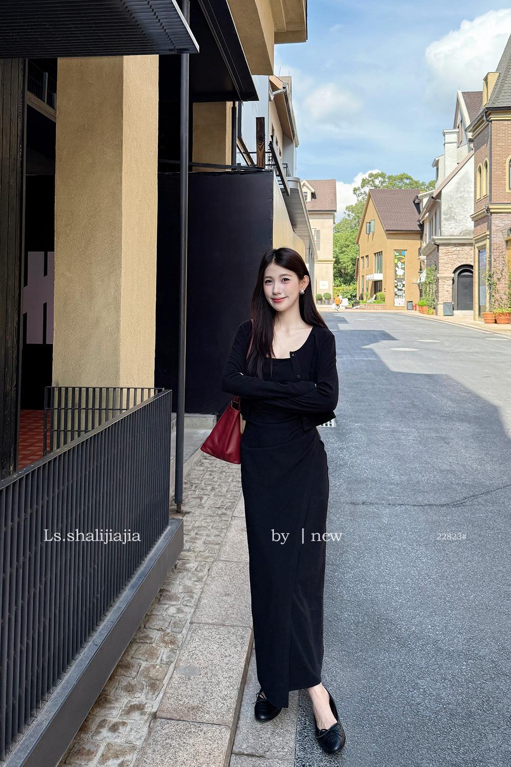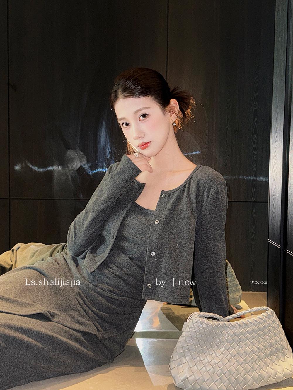 Set Cárdigan Elegante LS + Vestido Slip Guangzhou Thirteen Rows 2025 Principios de Otoño Nueva Ropa de Mujer 22823#