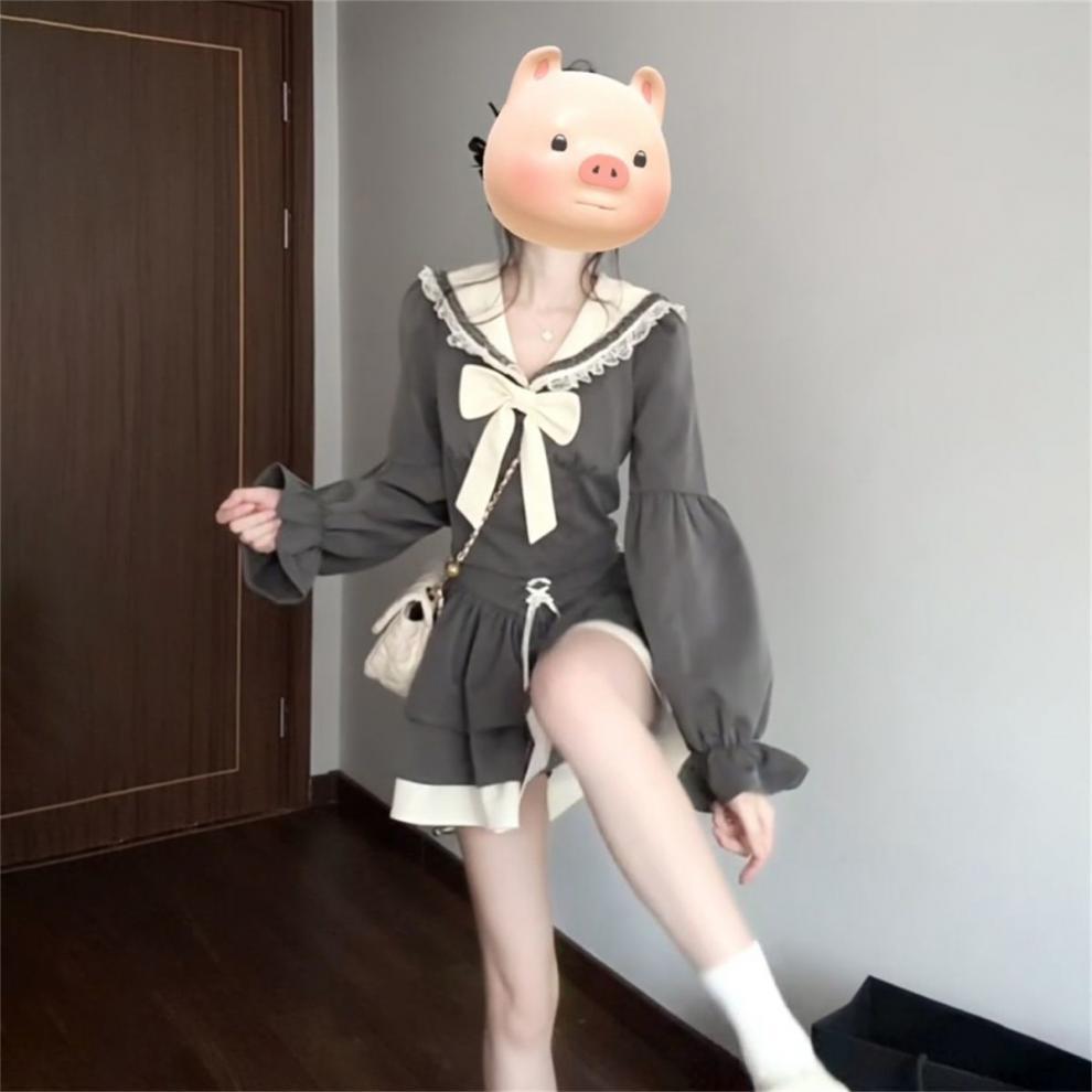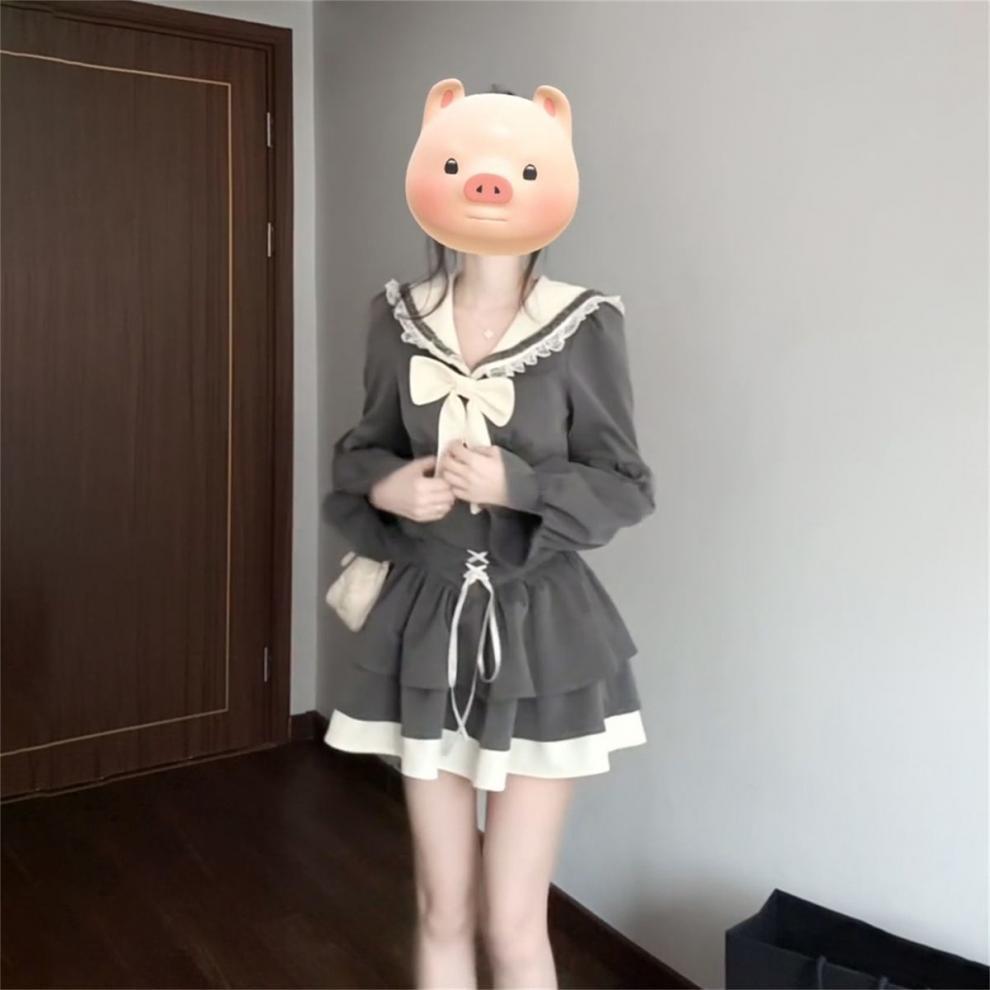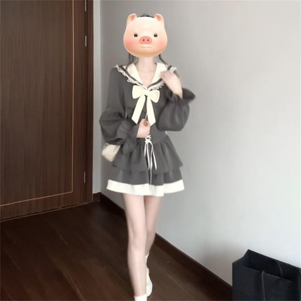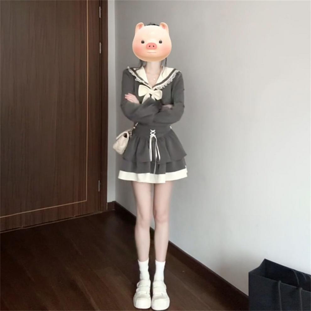 [suit] gray top + gray skirt, [single piece] navy collar top, [single piece] gray skirt