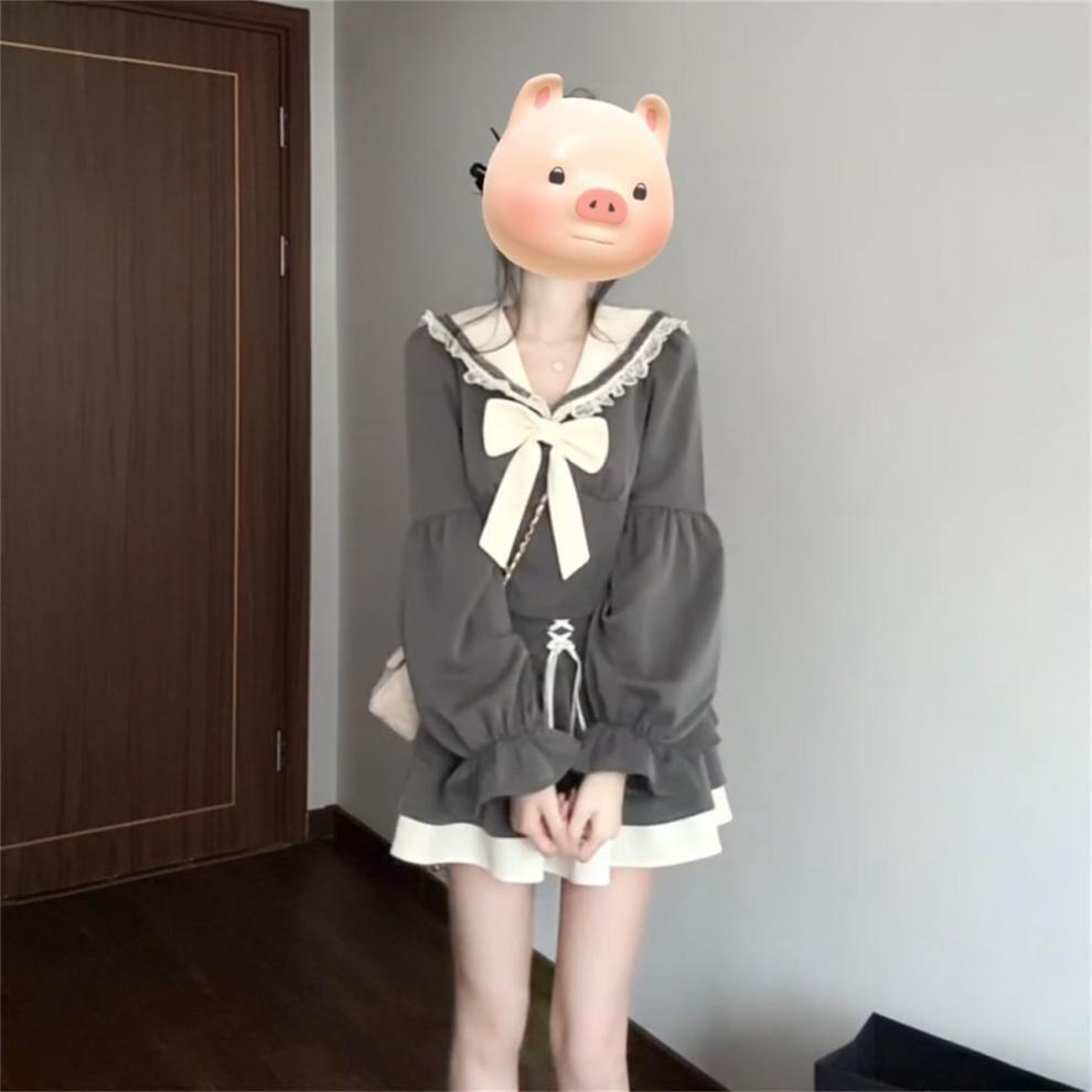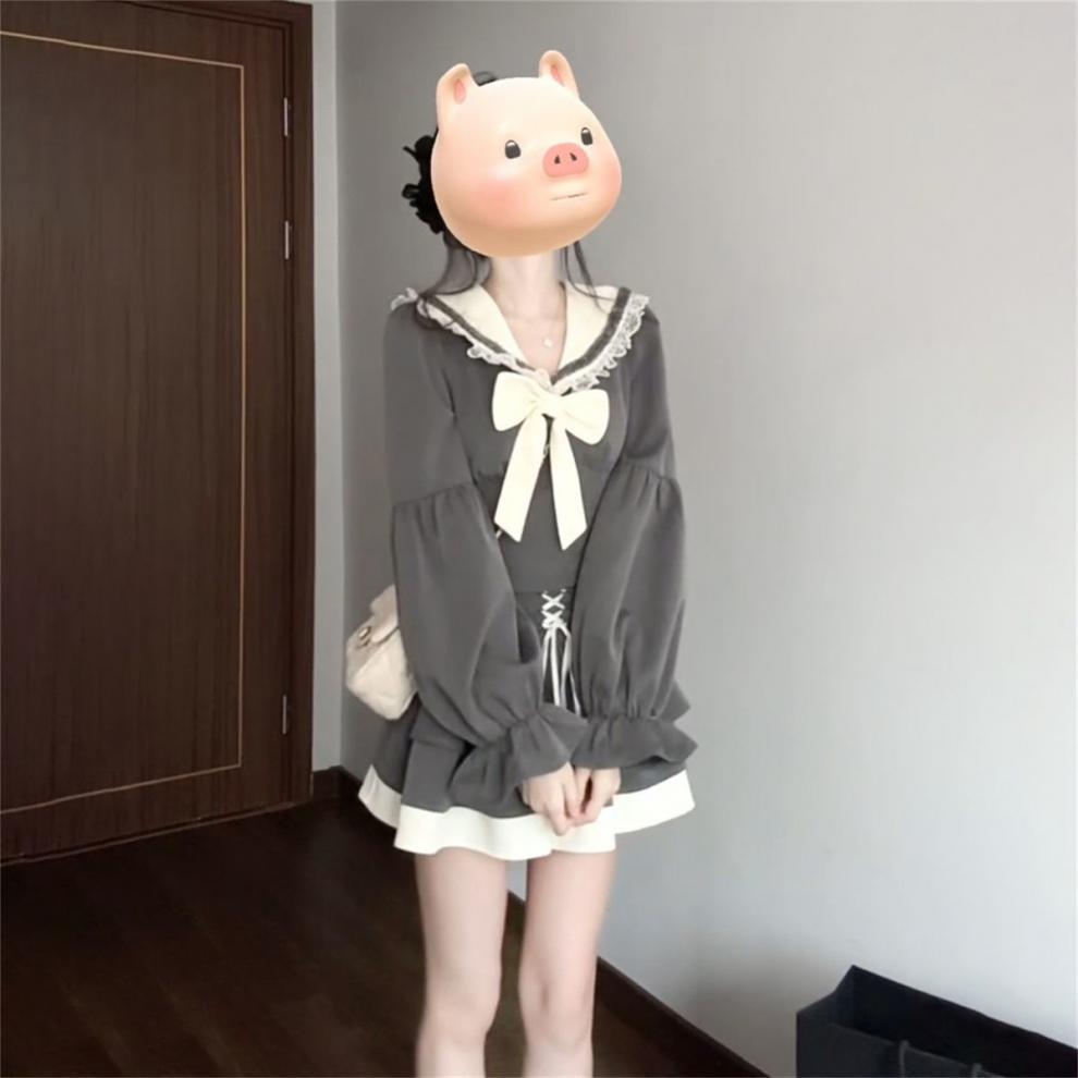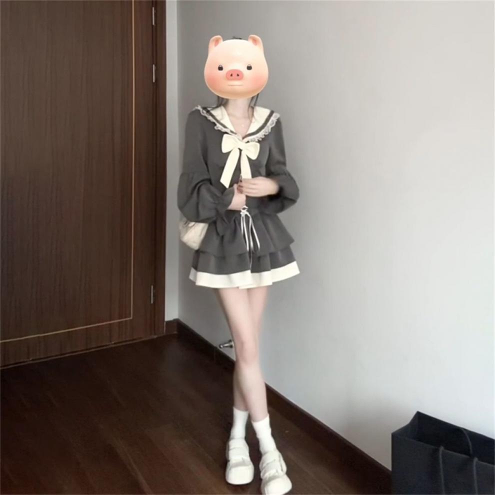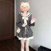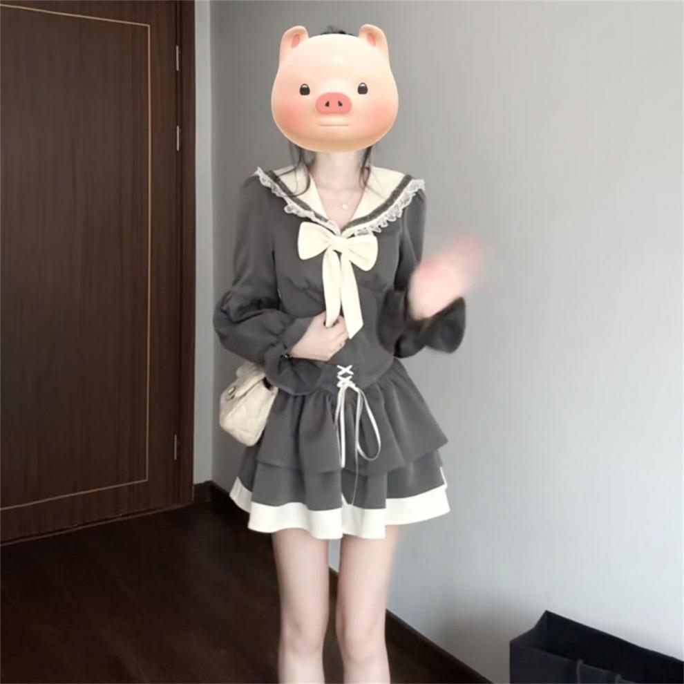 [suit] gray top + gray skirt, [single piece] navy collar top, [single piece] gray skirt