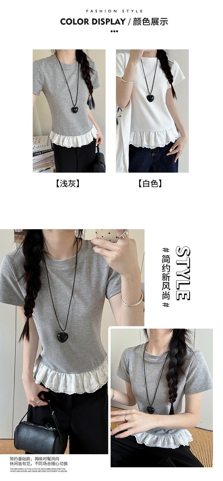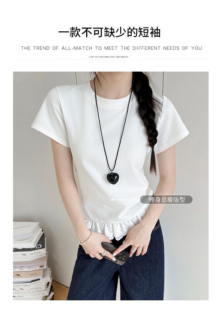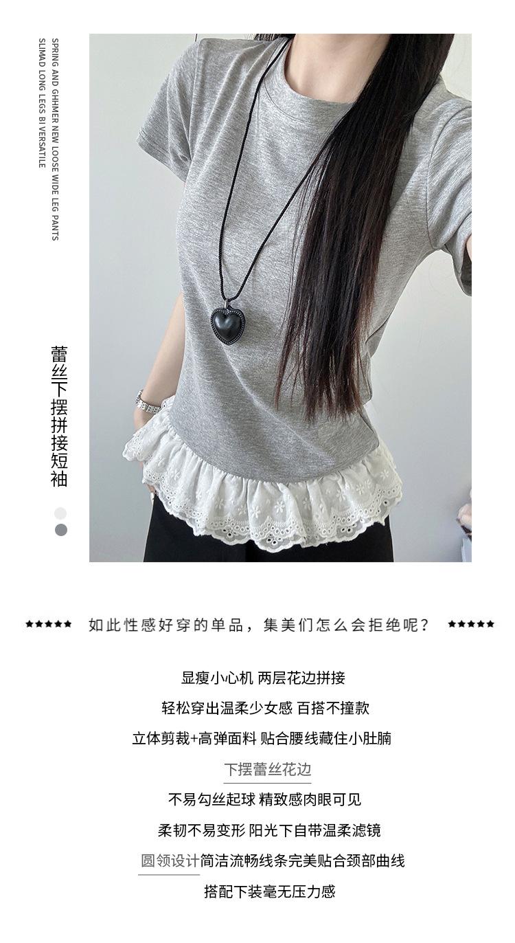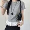 Playera Coreana de Encaje con Dobladillo en el Hombro Derecho de Manga Corta para Mujer Verano Nuevo Dulce y Versátil Look Adelgazante Top Estilo Ballet