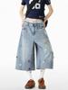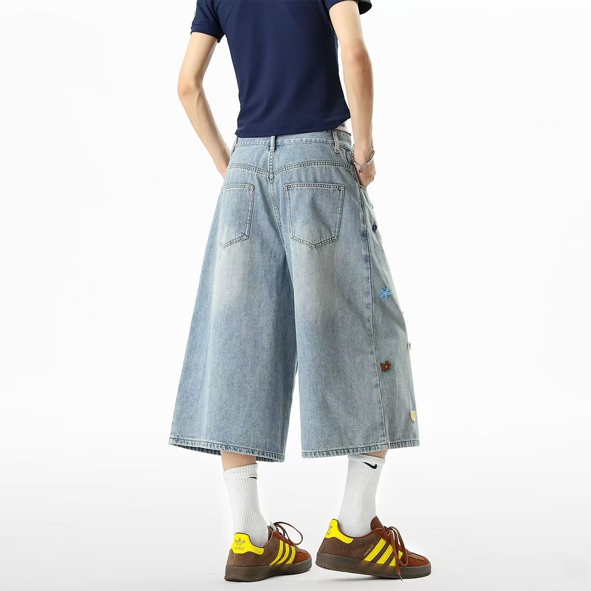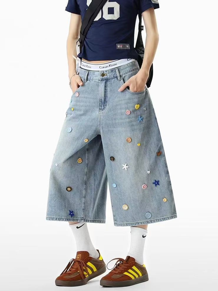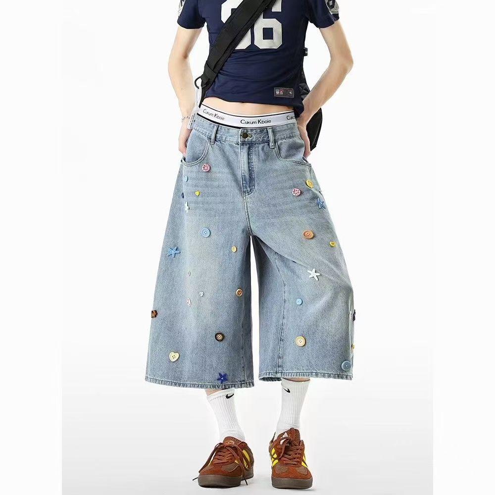 Jeans de Otoño de Cintura Alta Siete Puntos Mujer 2025 Nuevo Bordado de Chica Americana Hot Rectos Casuales Shorts de Pierna Ancha