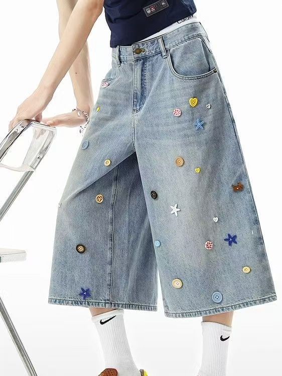 Compra Jeans de Otoño de Cintura Alta Siete Puntos Mujer 2025 Nuevo Bordado de Chica Americana Hot Rectos Casuales Shorts de Pierna Ancha al por mayor en Joom.pro