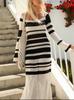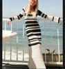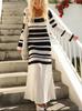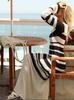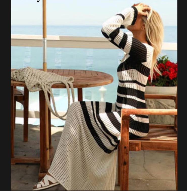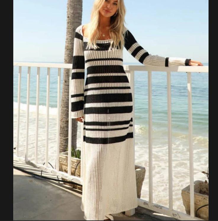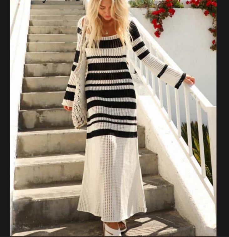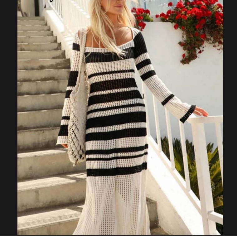 Blusa europea y americana transfronteriza a rayas blancas y negras hueca protectora solar Sexy cuello U Tejido Vestido de playa Vestido de vacaciones de manga larga