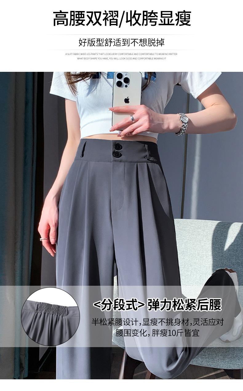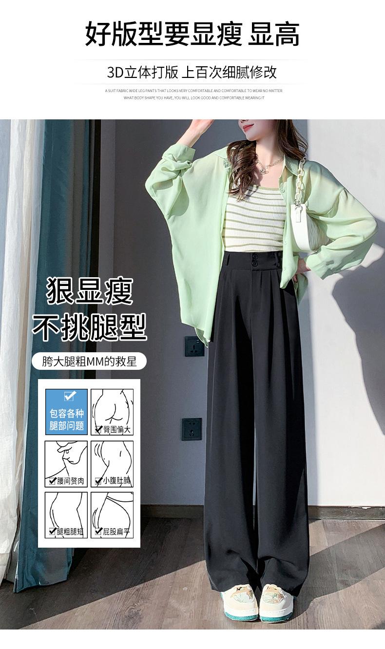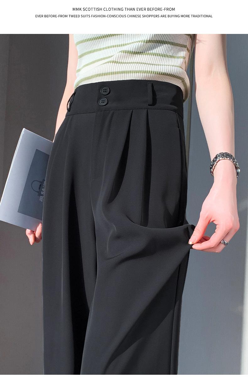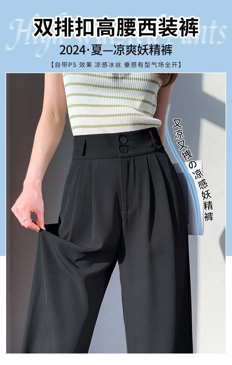 Traje Negro Pantalones de Pierna Ancha para Mujer Dosing Seda Helada Verano Cintura Alta Diseño de Doble Hebilla Ligeramente Gordo Estrecho Dosing Pantalones Rectos