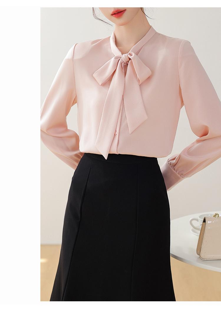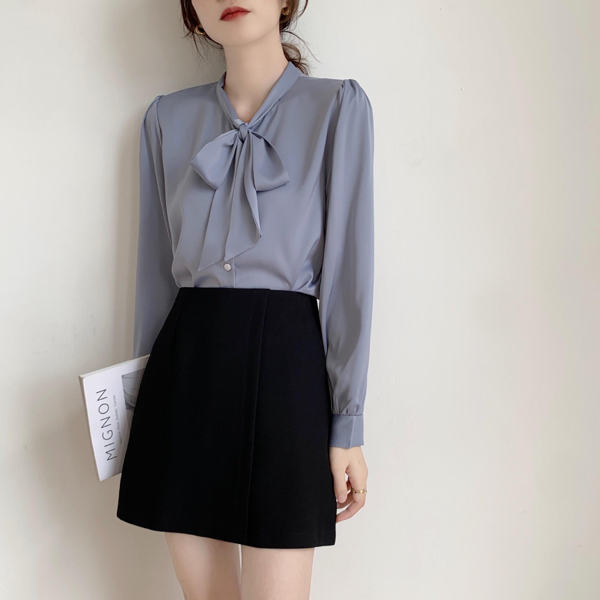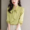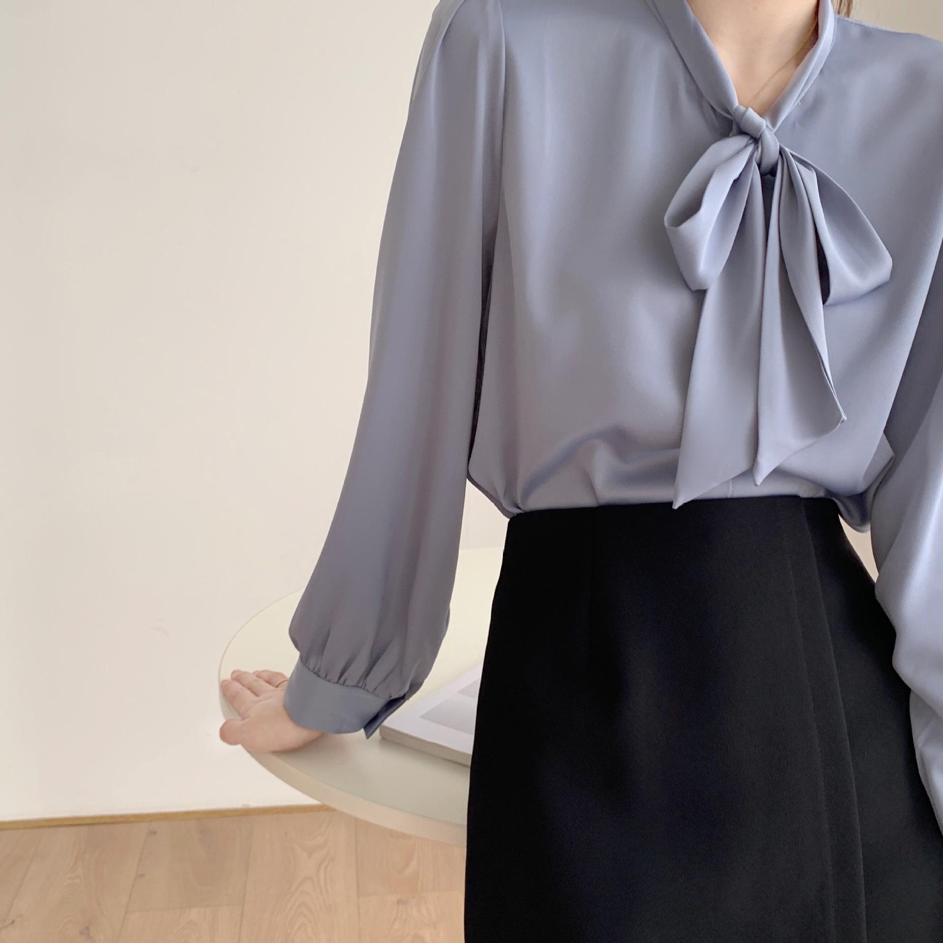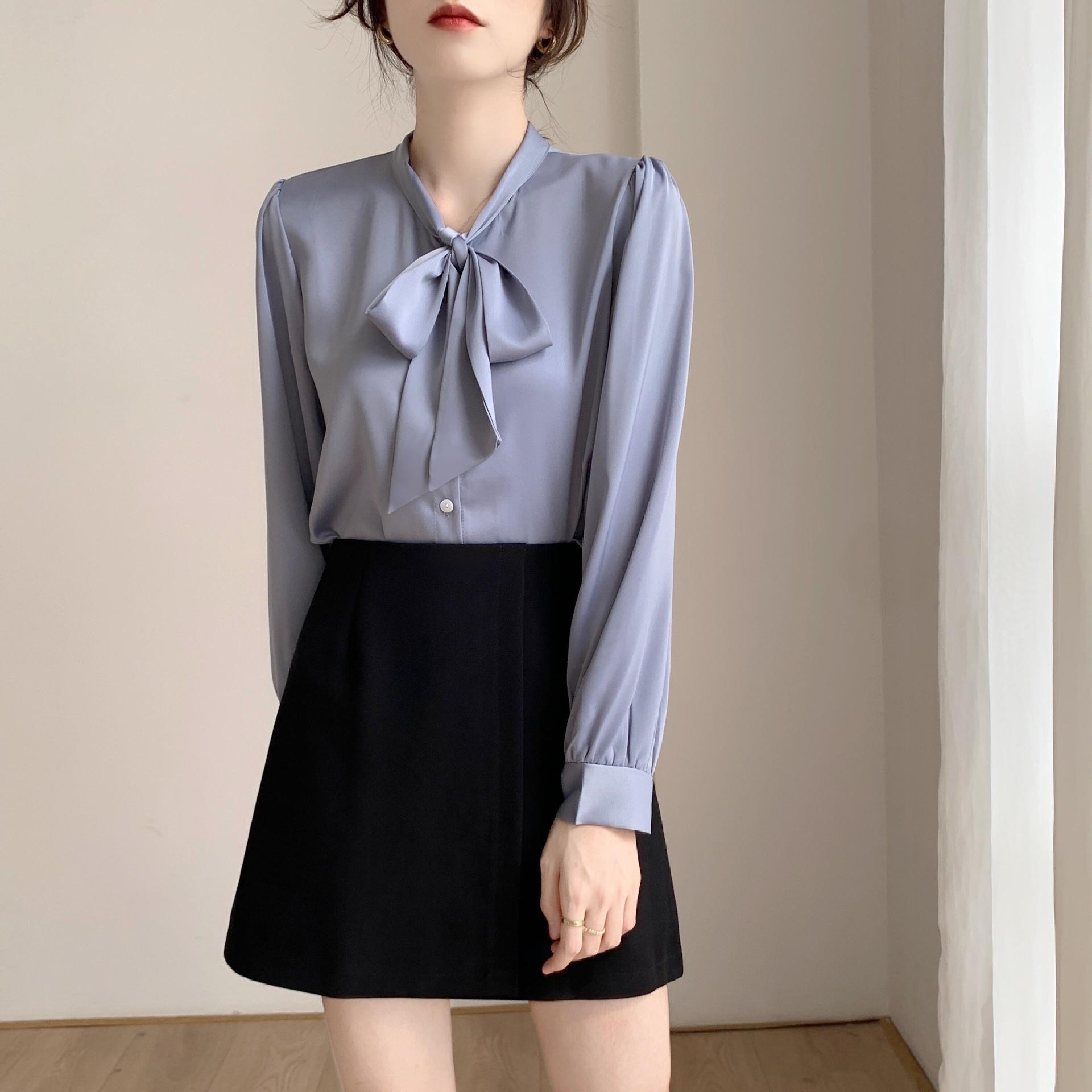 Blusa Super Original Azul con Lazo para Mujer Diseño de Nicho con Sentido Profesional Camisa de Temperamento Top de Satén con Lazo