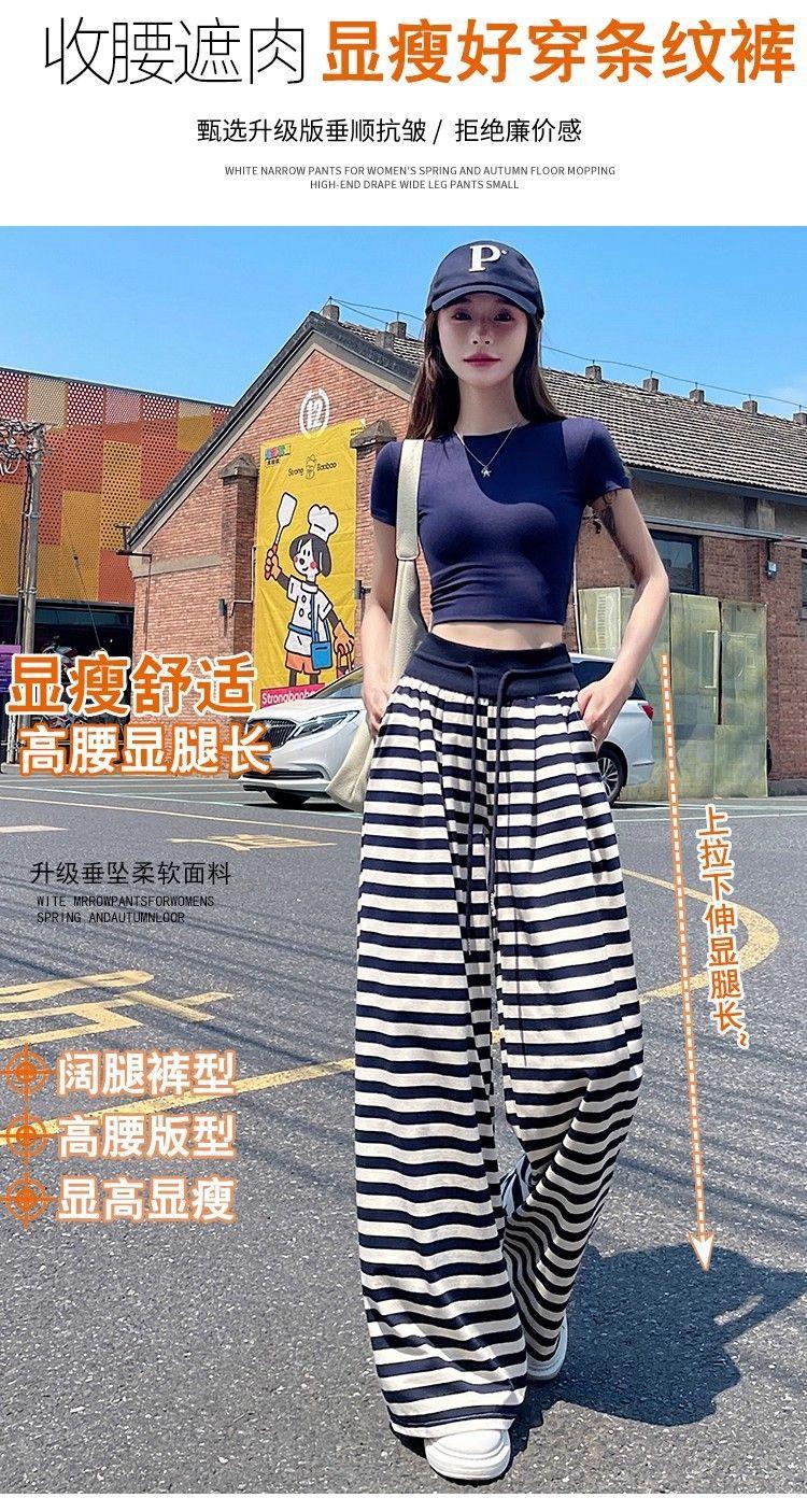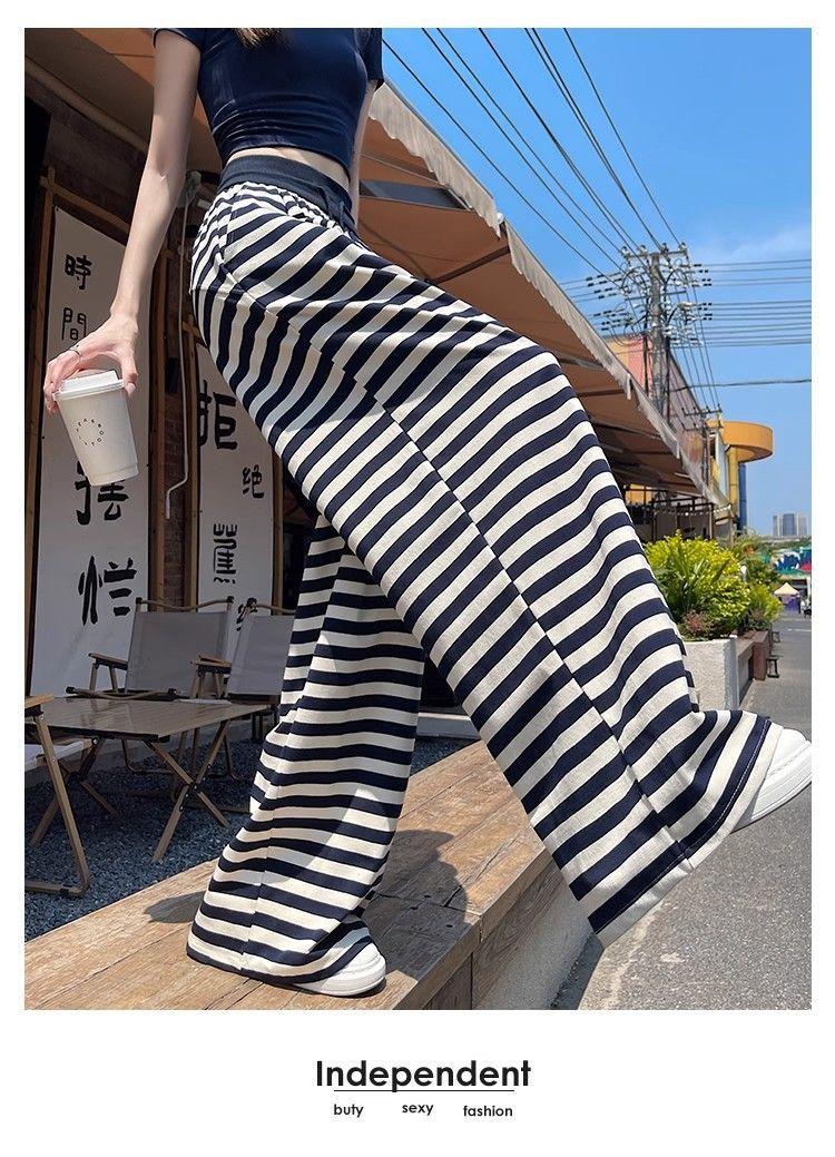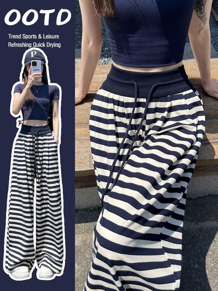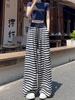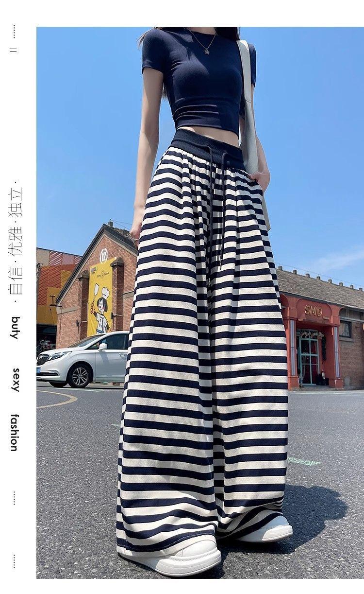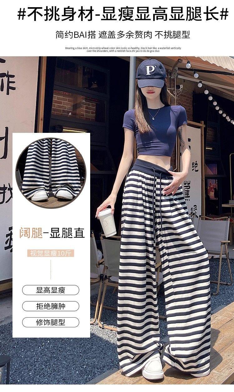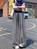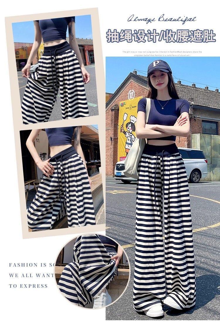 Talla Grande Gordo MM Estilo Coreano Pantalones Casuales con Cordón a Rayas Blancas y Negras para Mujer Estilo Holgazán Pantalones de Pierna Ancha Adelgazantes de Pierna Recta Deportivos Pantalones Largos