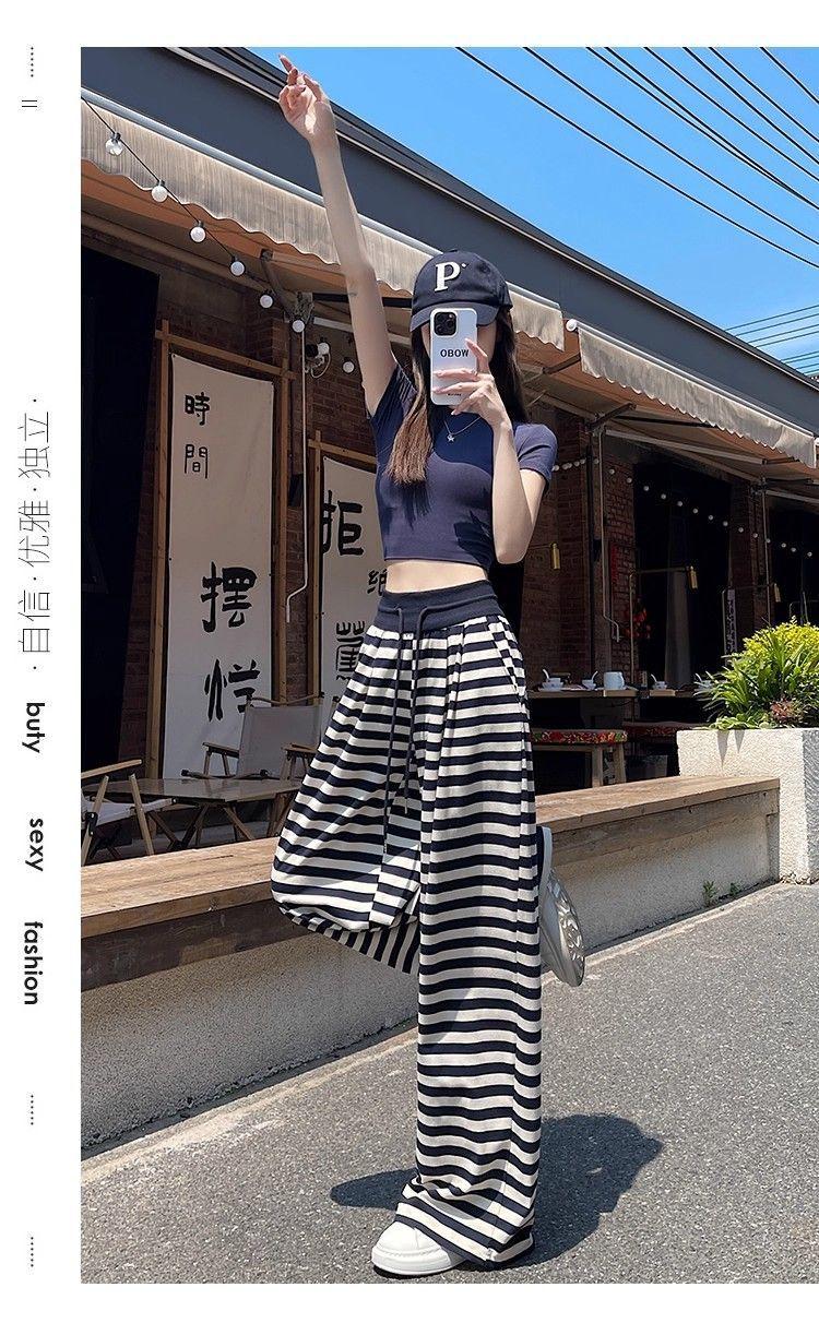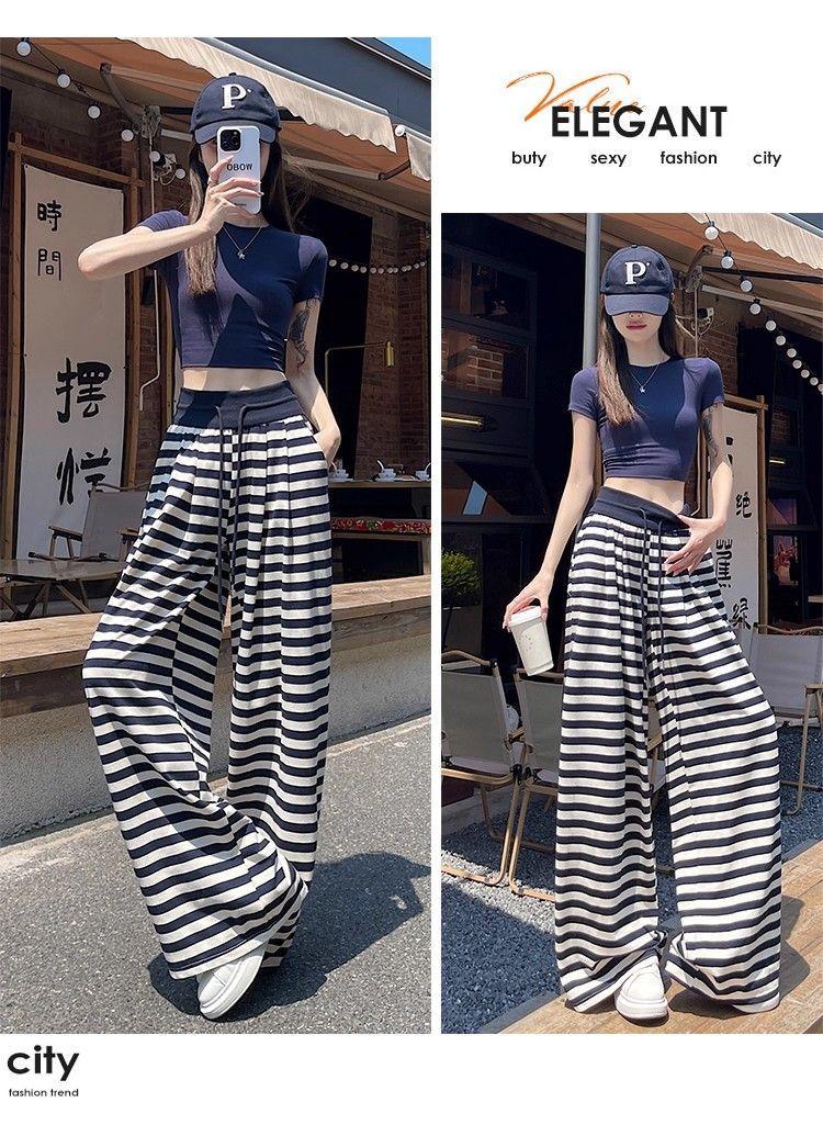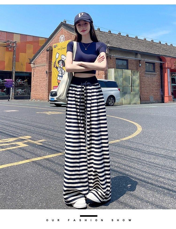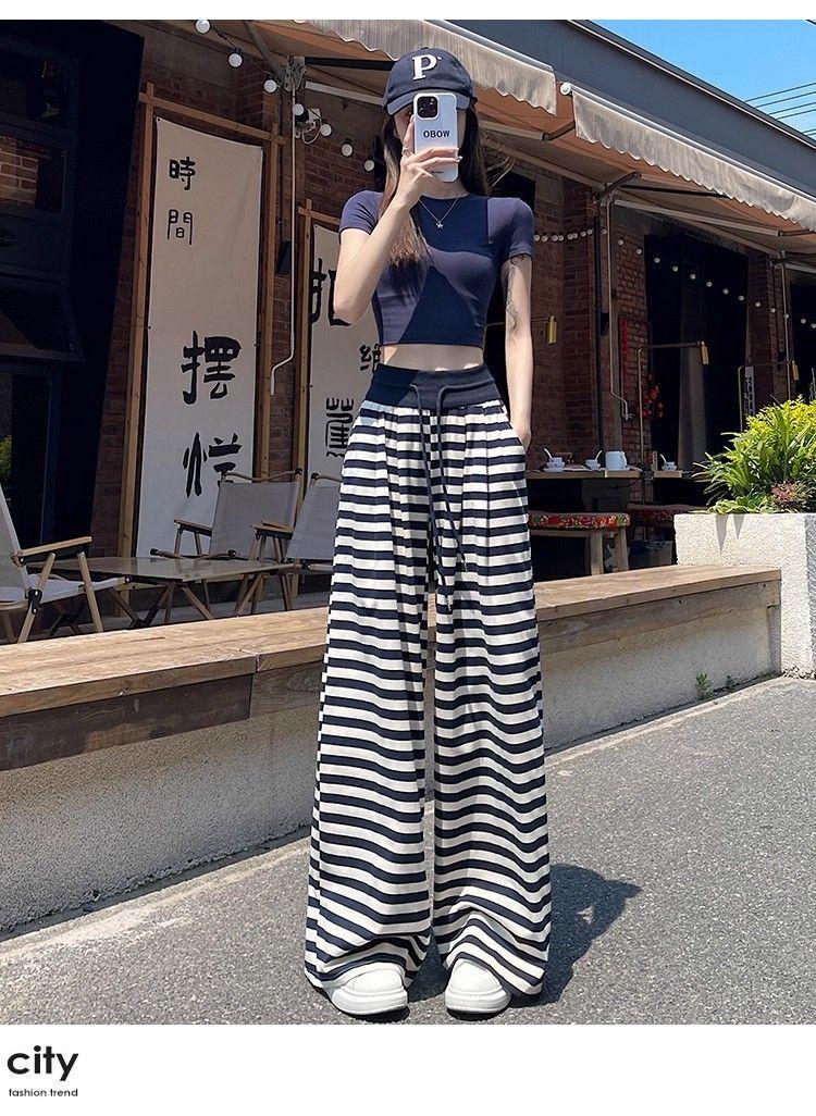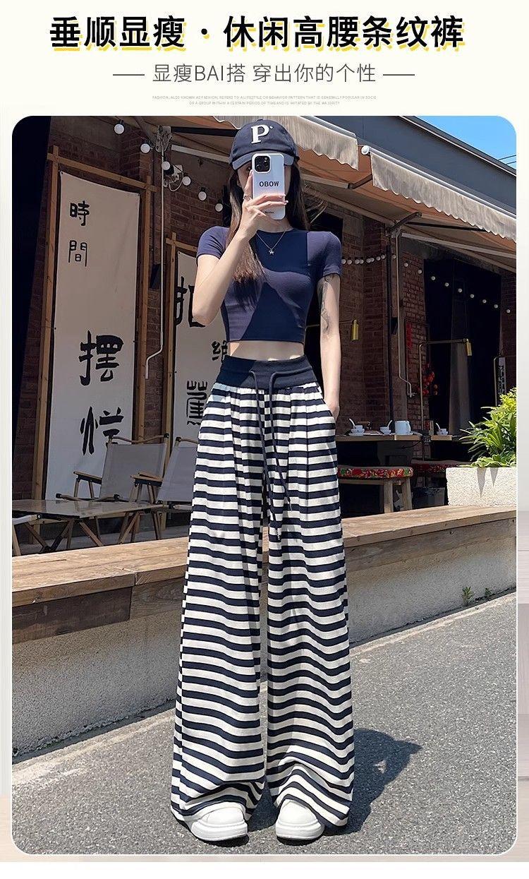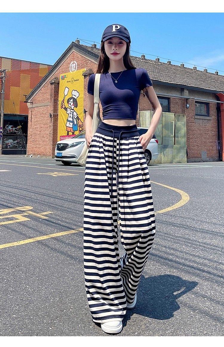Talla Grande Gordo MM Estilo Coreano Pantalones Casuales con Cordón a Rayas Blancas y Negras para Mujer Estilo Holgazán Pantalones de Pierna Ancha Adelgazantes de Pierna Recta Deportivos Pantalones Largos