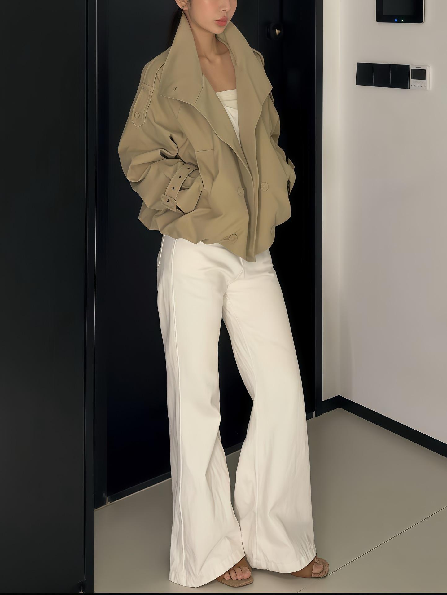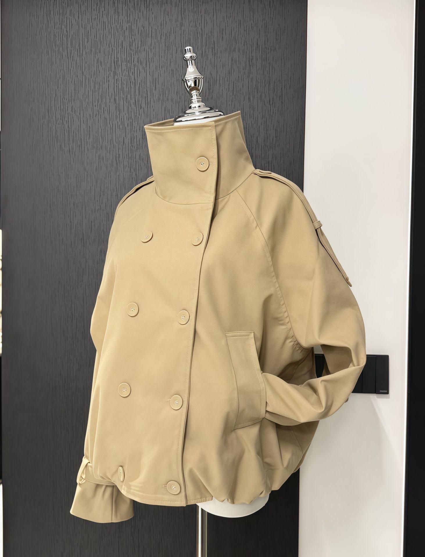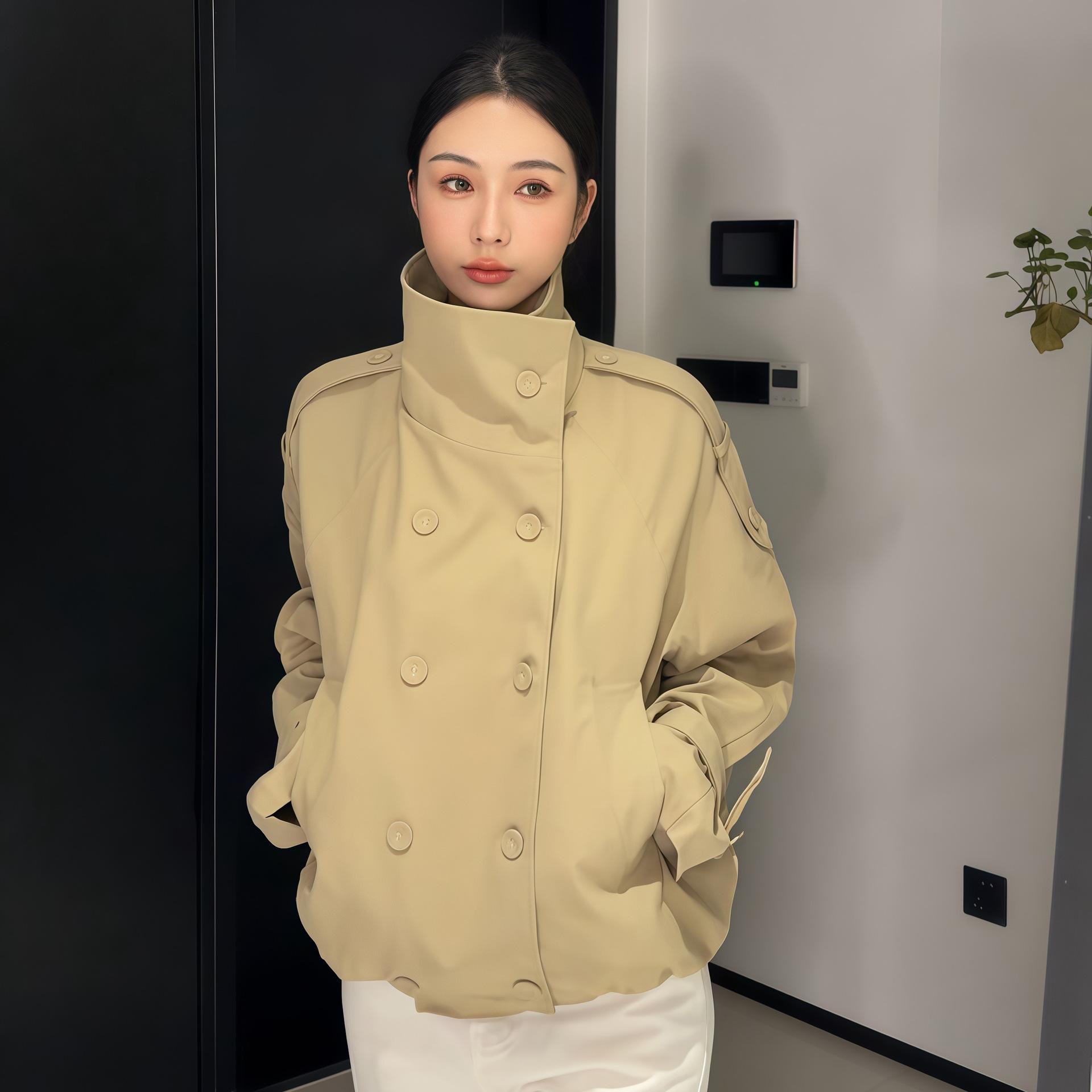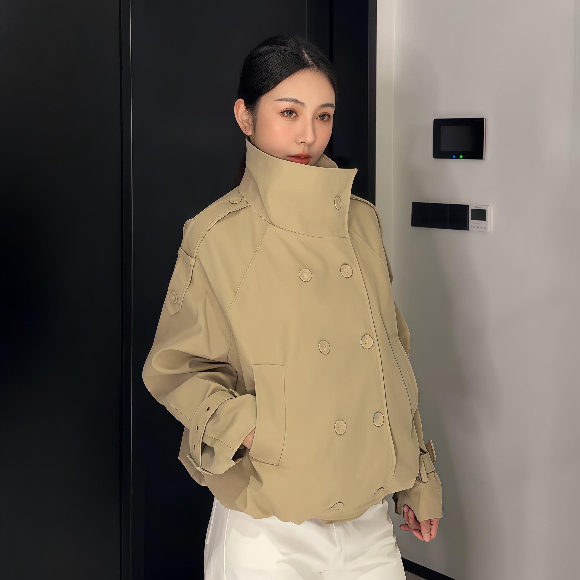 Compra Nuevo abrigo corto tipo gabardina con cuello alto de diseño estilo británico para mujer, temporada de principios de primavera, estilo coreano, top único de doble botonadura al por mayor en Joom.pro