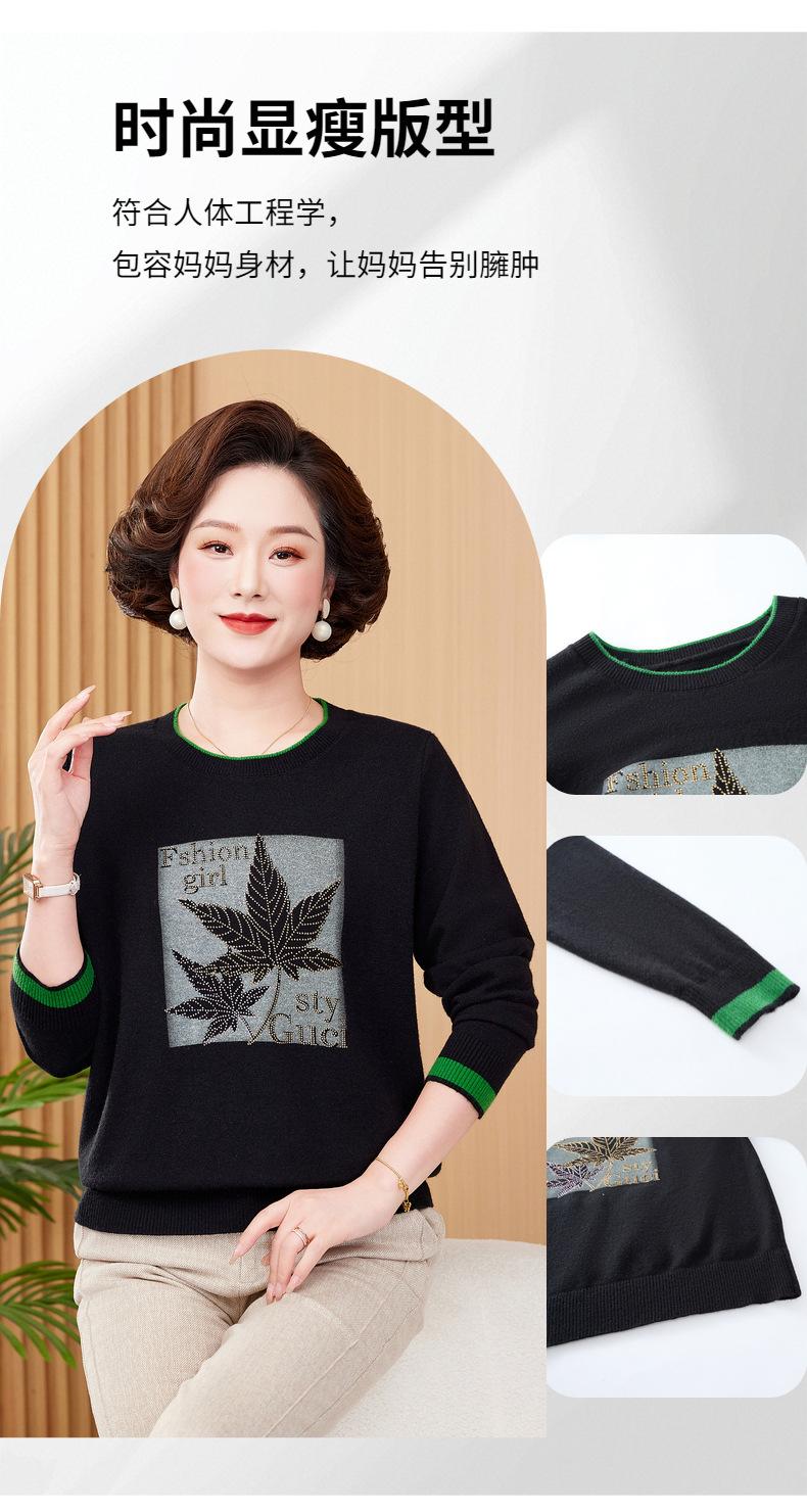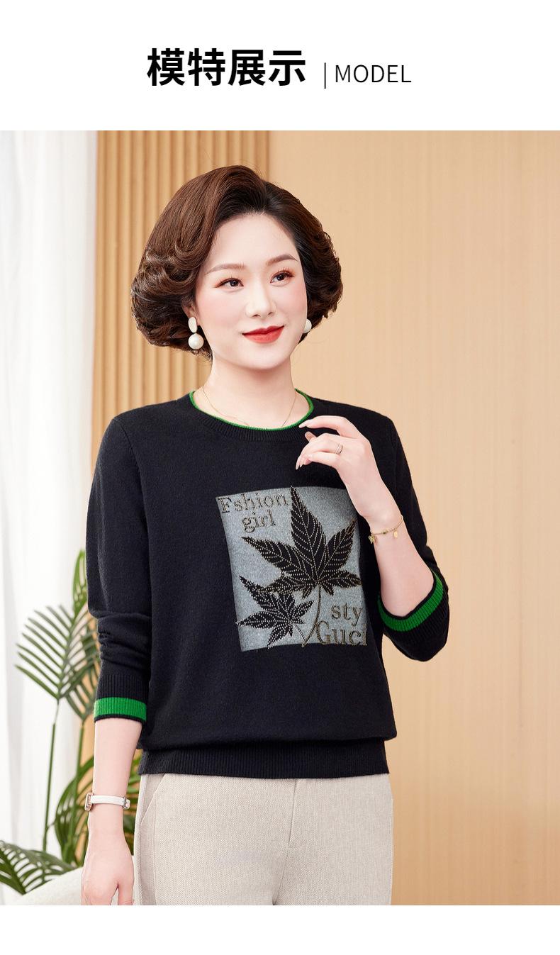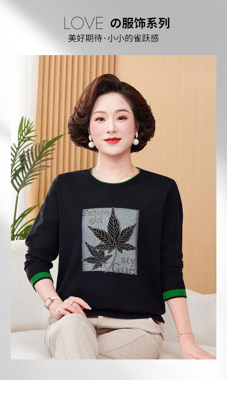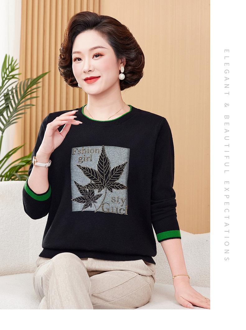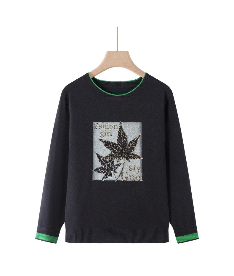 Otoño Nueva Moda para Madres Estampado de Hojas Camiseta de Trabajo Pesado con Hot Drilling Suelta Versátil Cuello Redondo Suéter de Bloque de Color para Mujer