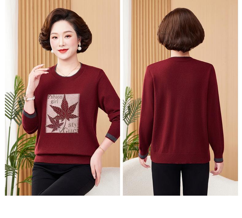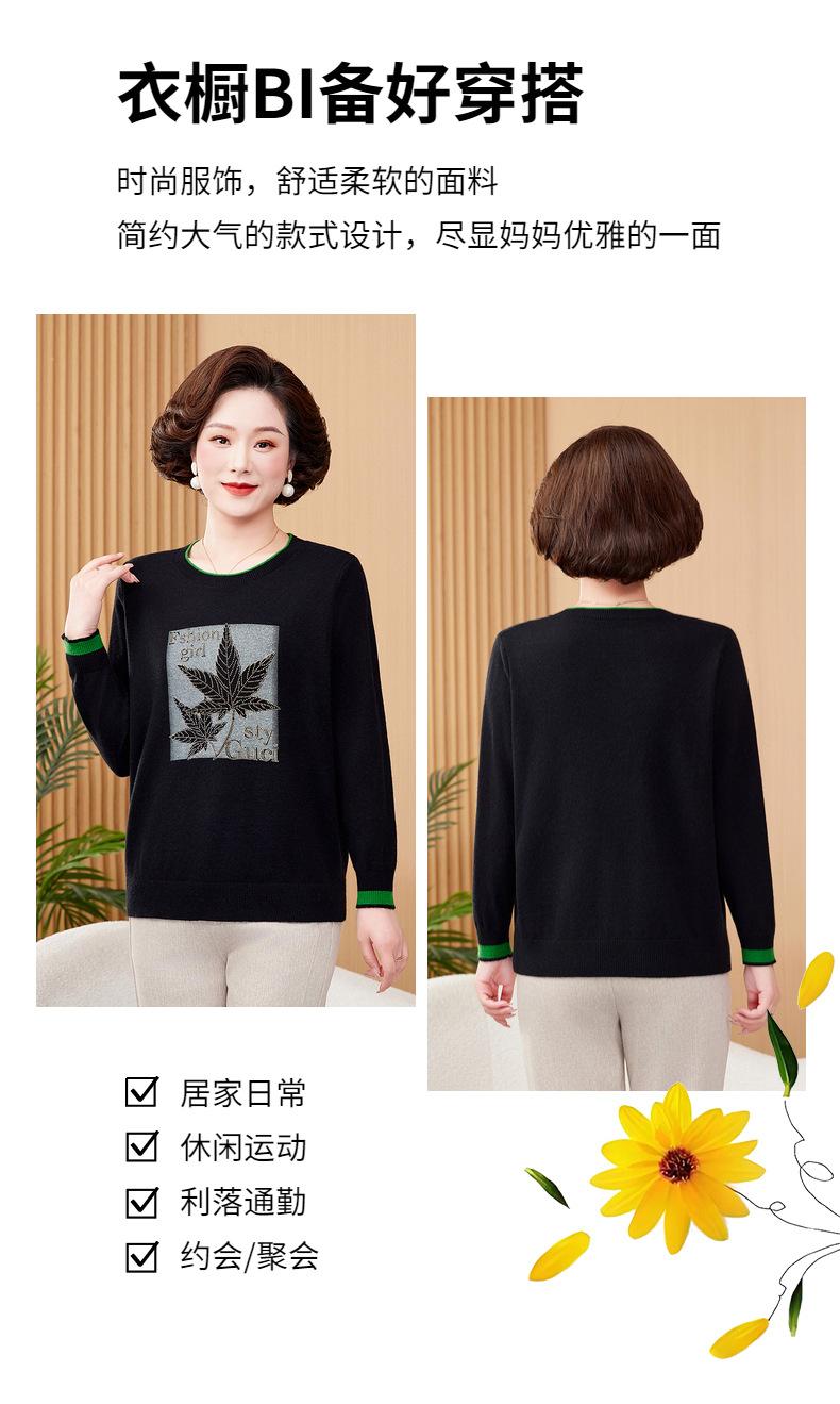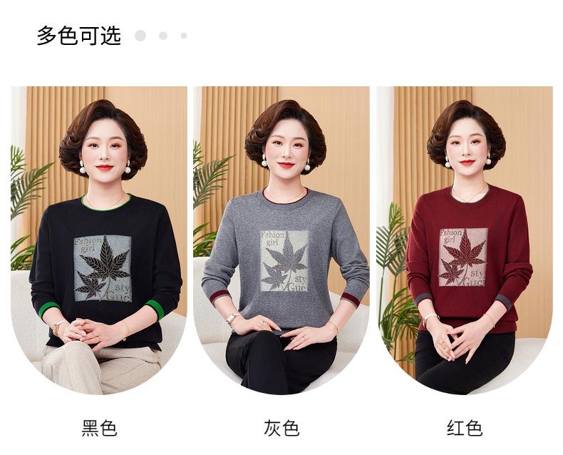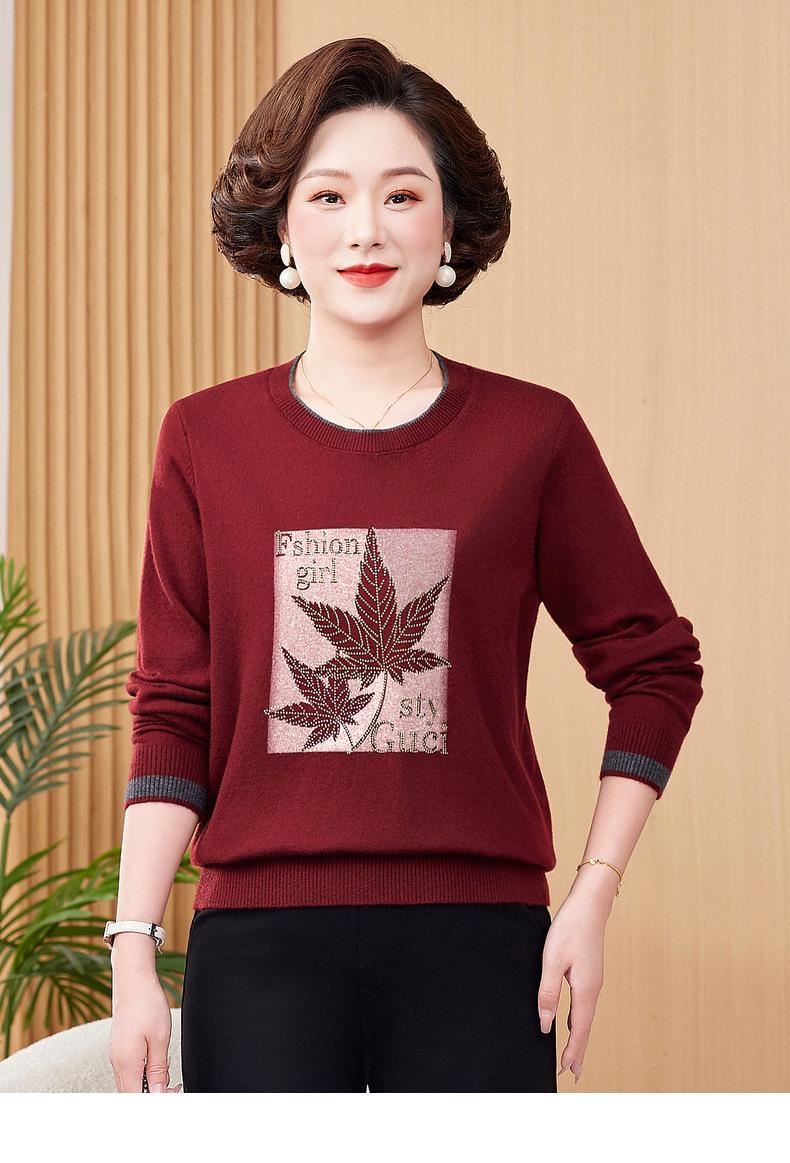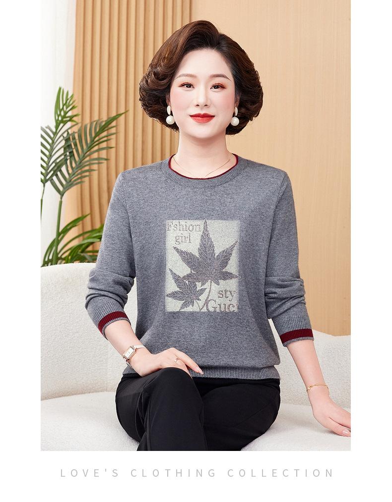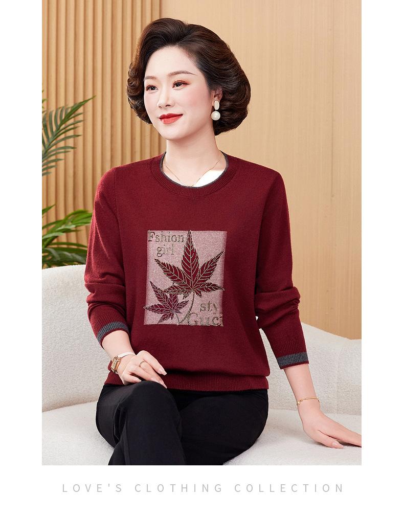 Otoño Nueva Moda para Madres Estampado de Hojas Camiseta de Trabajo Pesado con Hot Drilling Suelta Versátil Cuello Redondo Suéter de Bloque de Color para Mujer