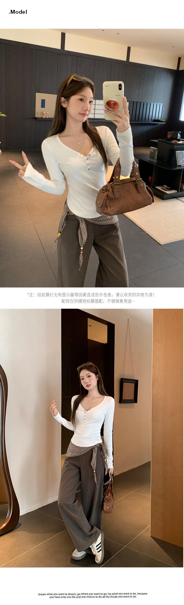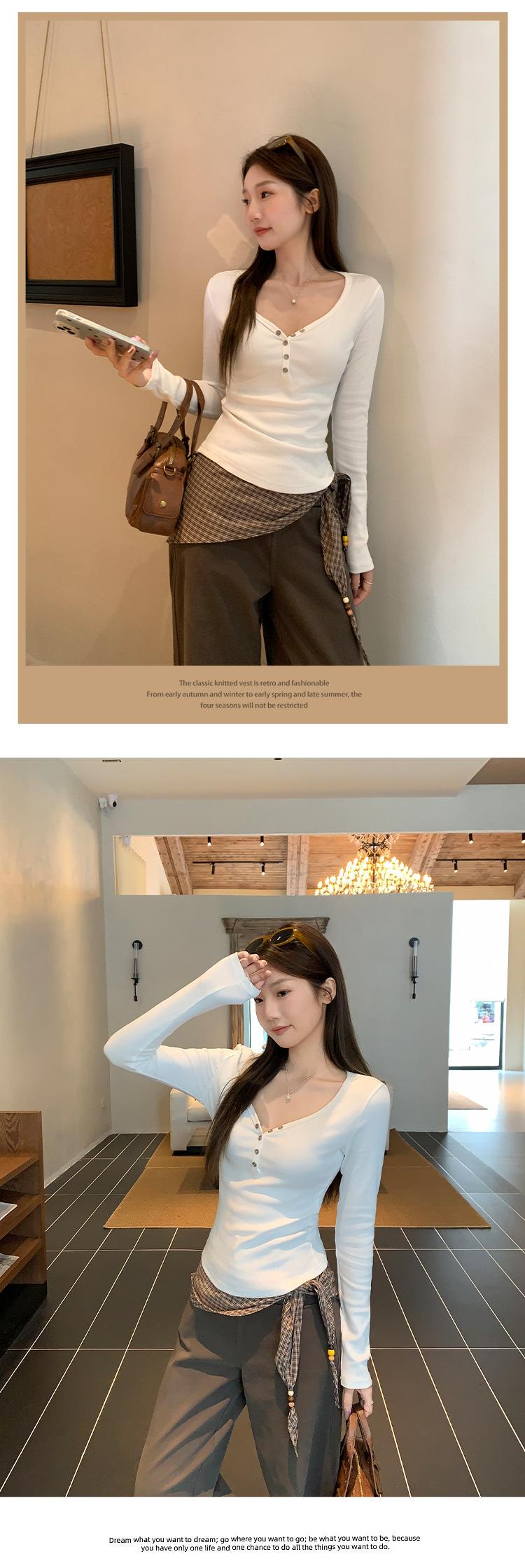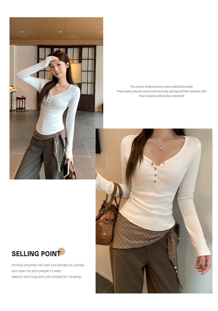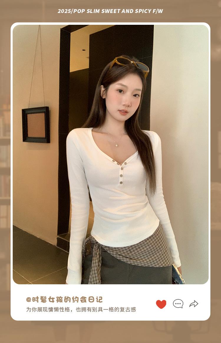 Compra Camiseta blanca de manga larga con cuello en V y diseño de botones rectos en los hombros para mujer, nueva para otoño 2025, top sencillo, casual y ajustado al por mayor en Joom.pro