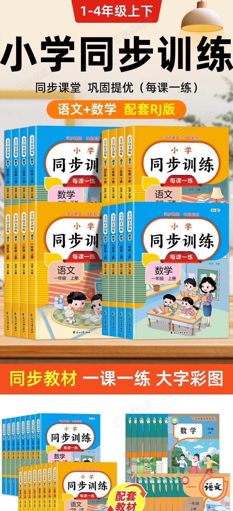 Primaria Chino, Matemáticas e Inglés Entrenamiento Sincrónico para Grados 1-4, Volumen 1 y 2, Edición Educación del Pueblo Ejercicios Sincrónicos, Una Lección y Una Práctica