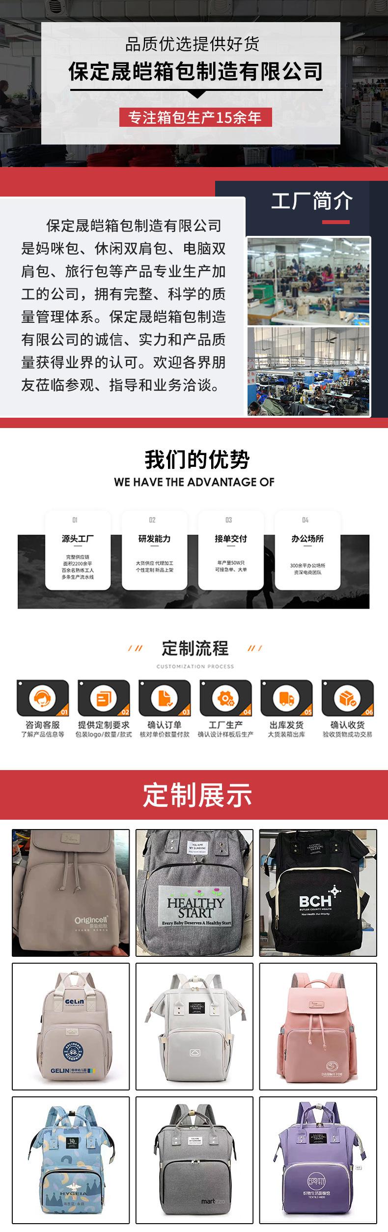 Baoding Shengai Manufacturing Co., Ltd. se especializa en la producción de bolsas para mamá, bolsas de viaje, bolsas para computadora, mochilas, bolsas de negocios, bolsas para estudiantes, y puede procesar y fabricar con el logotipo de la empresa impreso según las necesidades del cliente. La fábrica produce según el principio de calidad primero. Damos la bienvenida a nuestros clientes a elegir estilos para el procesamiento, proporcionar dibujos para el muestreo y proporcionar muestras para el procesamiento y la personalización.