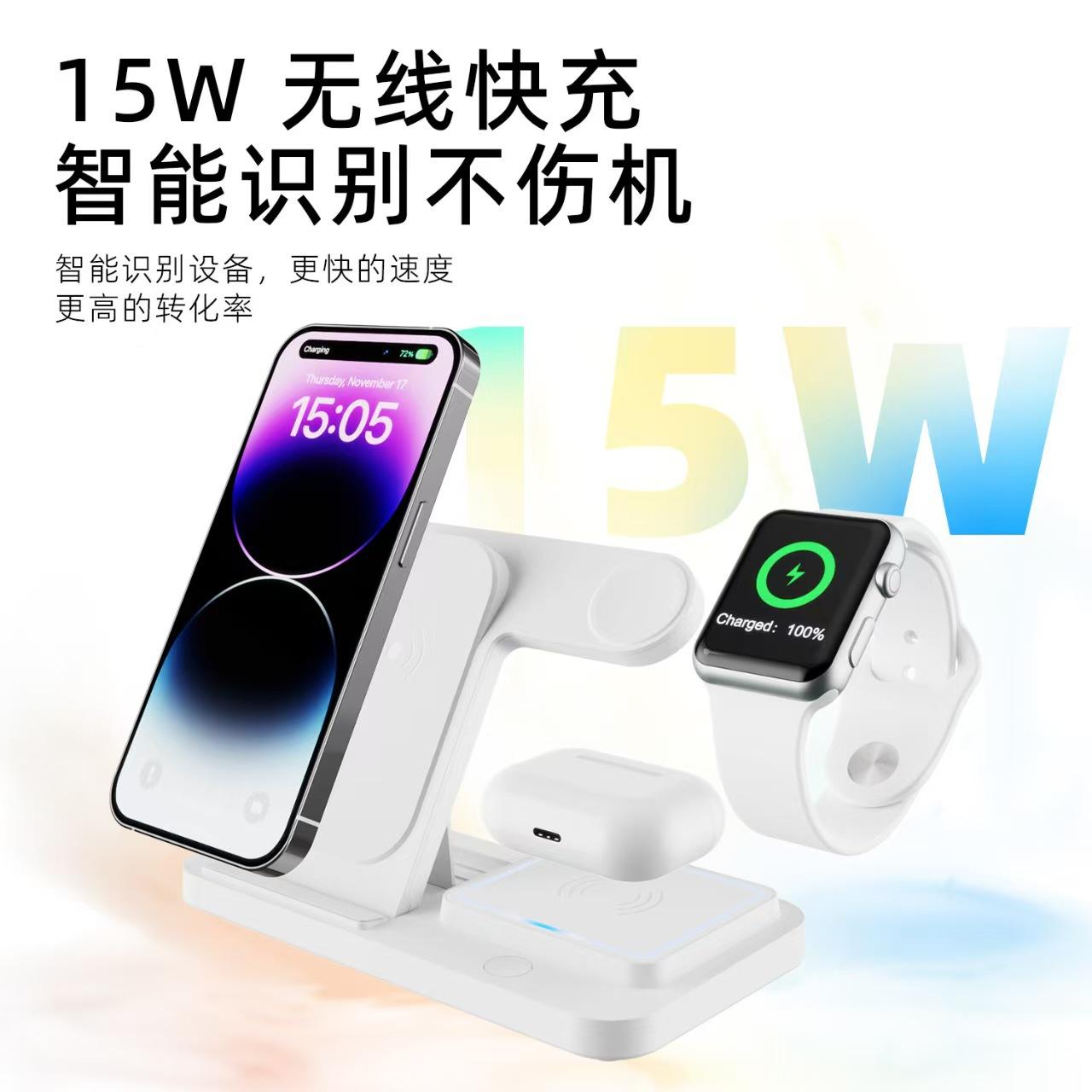 Cargador Inalámbrico Tres en Uno Transfronterizo Soporte Vertical de Escritorio Carga Rápida Inalámbrica Adecuado para Teléfono Móvil Apple, Audífonos y Relojes