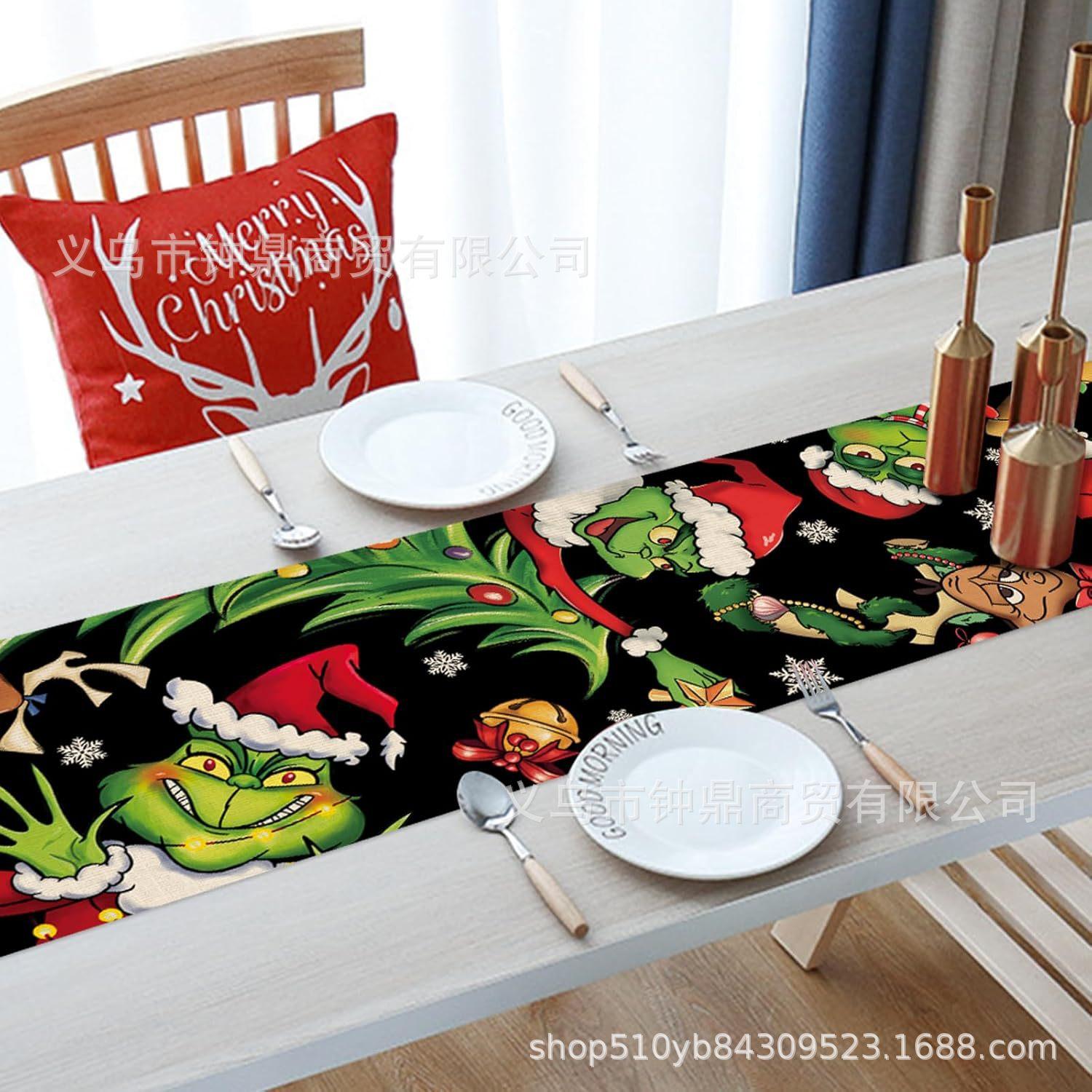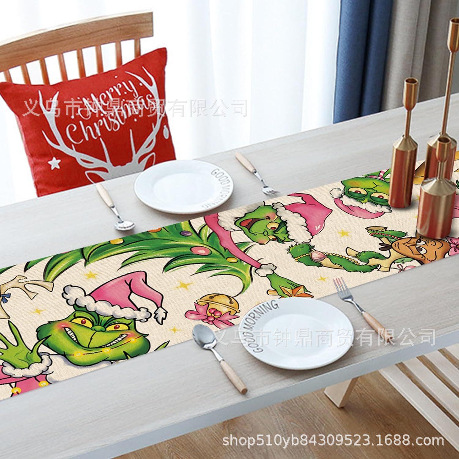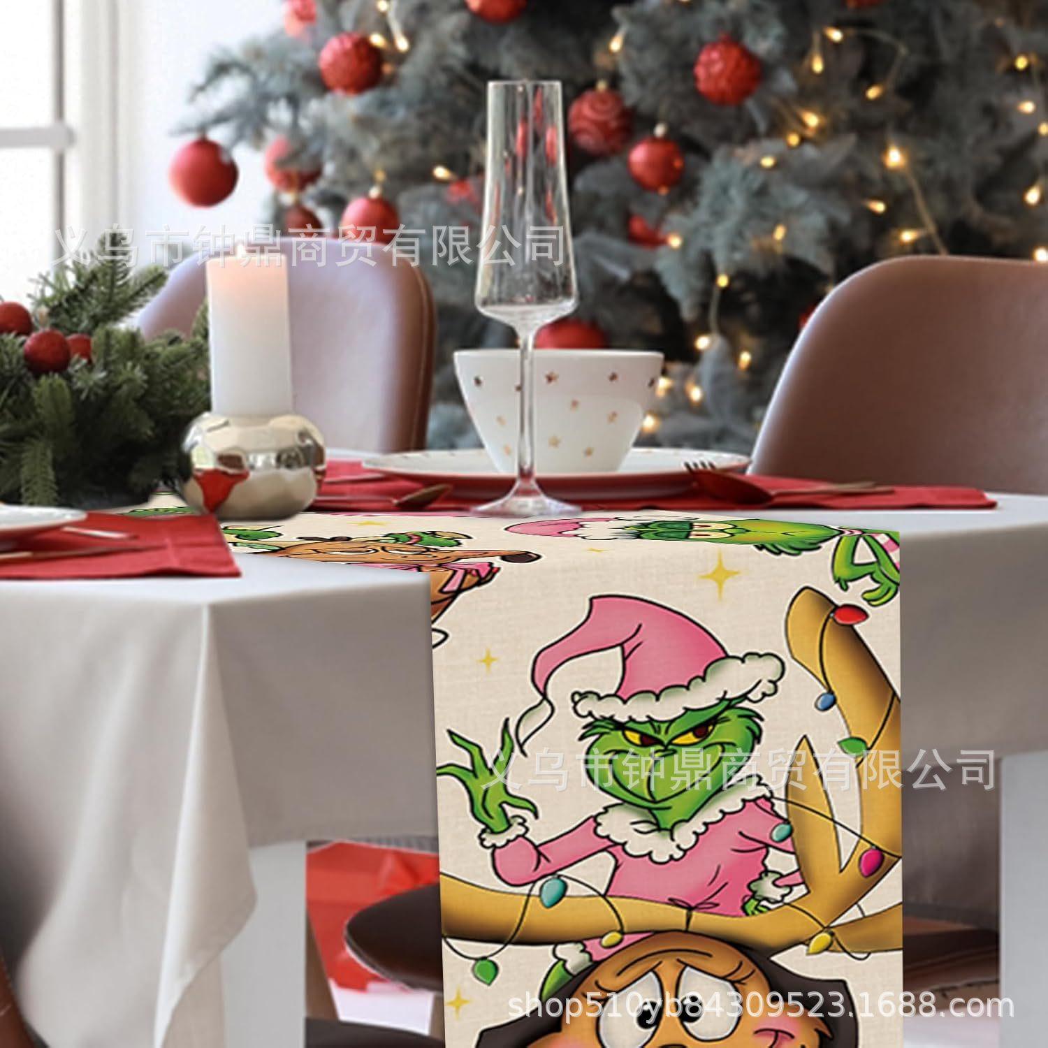 Camino de mesa navideño más vendido de Amazon estampado de reno Grinch material de lino decoración de mesa de comedor navideña mantel