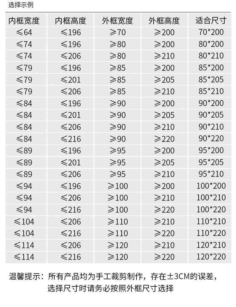 100*210, 70*200, 80*200, 85*205, 85*210, 90*200, 90*205, 90*220, 95*200, 95*210, 100*200, 100*220, 110*220, 120*220