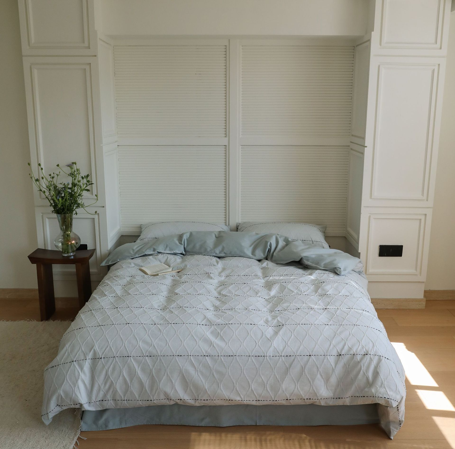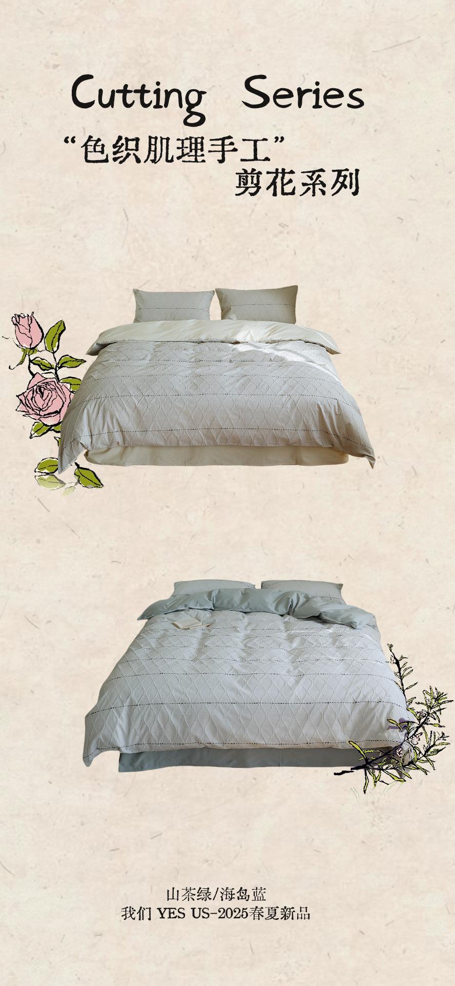Artesanía: Flores de corte de línea de sésamo de línea modificada a mano, (las flores cortadas a mano varían en tamaño, vivaces y hermosas) tejido jacquard texturizado teñido con hilo, proceso especial de plisado, formando una hermosa textura cóncava-convexa, tratado con un proceso de lavado, formando así una textura suave