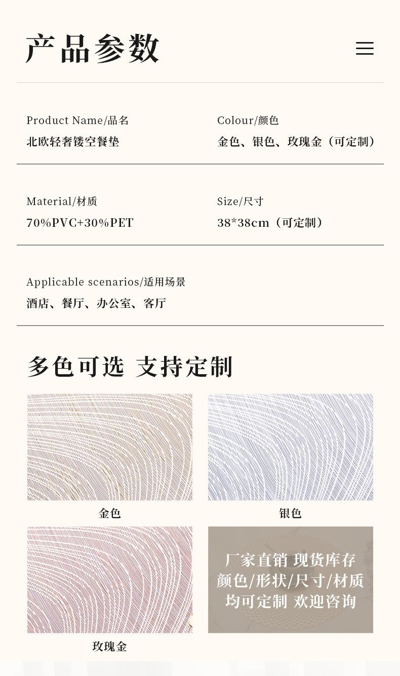 【Gold】Cutout Placemat, 【Silver】Openwork Placemat, 【Rose Gold】Cutout Placemat