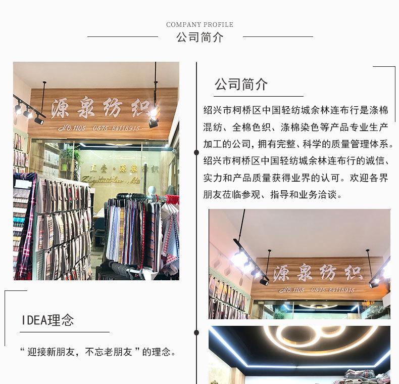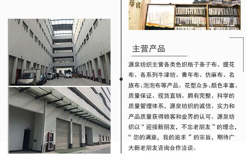 Yuanyuan Textile se dedica principalmente a varios tejidos de cuadros y rayas teñidos en hilo, tejidos jacquard, varias series de tela Oxford, popelina, tejidos tipo lino, tejidos étnicos, tejidos seersucker y otros productos. Con una amplia variedad de patrones, colores ricos, calidad garantizada y ventas al contado. Poseyendo un sistema de gestión de calidad completo y científico, la integridad, la fortaleza y la calidad del producto de Yuanyuan Textile han sido reconocidas por los clientes y la industria. Con el concepto de "Dando la bienvenida a nuevos amigos, sin olvidar a los viejos amigos." y el principio de "Su satisfacción, mi búsqueda.", esperamos consultas y cooperación de nuestro vasto número de nuevos y viejos amigos.