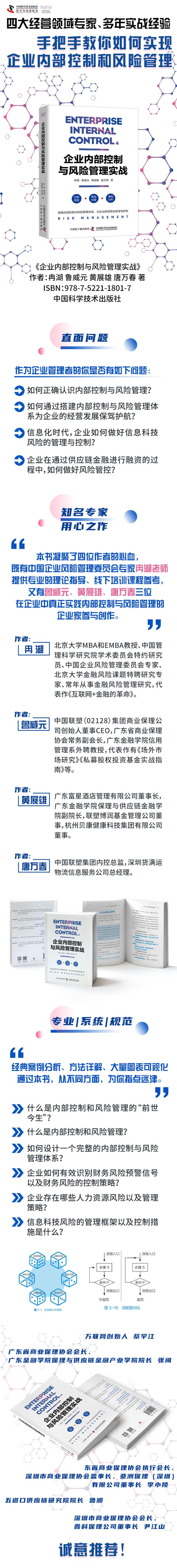 Este libro revisa sistemáticamente los conceptos y estrategias prácticas de control interno empresarial y gestión de riesgos desde una perspectiva práctica, y presenta una guía práctica para los lectores con casos del mundo real y una gran cantidad de gráficos. El libro tiene 8 capítulos. El Capítulo 1 presenta el "pasado y el presente" del control interno y la gestión de riesgos desde una perspectiva general. El Capítulo 2 discute con más detalle qué son el control interno y la gestión de riesgos. El Capítulo 3 presenta las ideas erróneas y los obstáculos en el control interno y la gestión de riesgos empresariales, y explica los 7 pasos de diseño y las herramientas de diseño del sistema de control interno y gestión de riesgos. El Capítulo 4, desde una perspectiva financiera y fiscal, introduce qué es el riesgo financiero, cómo las empresas pueden identificar eficazmente las señales de alerta de riesgo financiero y las estrategias de control del riesgo financiero. El Capítulo 5, desde una perspectiva de gestión de recursos humanos, introduce qué riesgos de recursos humanos existen en las empresas y las estrategias de gestión. El Capítulo 6, desde una perspectiva de gestión de tecnología de la información, introduce la importancia del riesgo de tecnología de la información, el marco de gestión del riesgo de tecnología de la información y las medidas de control. El Capítulo 7, desde una perspectiva de financiación de la cadena de suministro, introduce qué es la financiación de la cadena de suministro, los modelos de financiación de la cadena de suministro, los tres principales riesgos de la financiación de la cadena de suministro y las medidas de control de riesgos. El Capítulo 8 toma industrias comunes como ejemplos para introducir los riesgos comunes y sus medidas de control, incluyendo la industria inmobiliaria, la industria automotriz, etc.