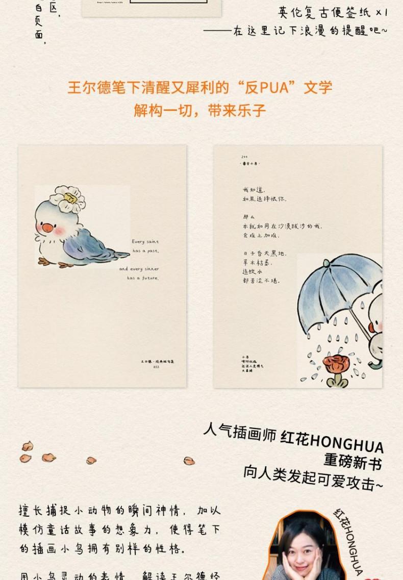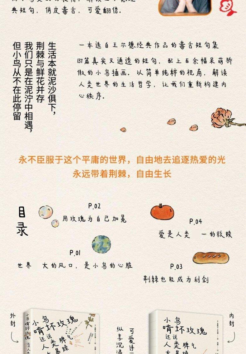 Una colección de frases cortas sarcásticas seleccionadas de las obras clásicas de Oscar Wilde. 137 frases cortas verdaderas y perspicaces, acompañadas de más de cien ilustraciones de pajaritos lindos y orgullosos. Interpretando la filosofía de la vida en el mundo humano desde una perspectiva simple y pura, permitiéndonos reconstruir nuestro orden interior.