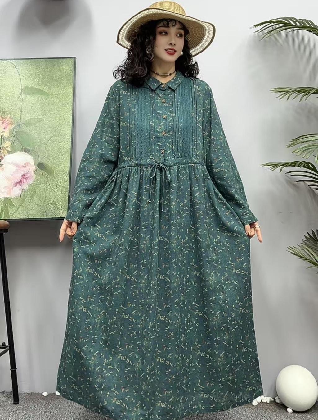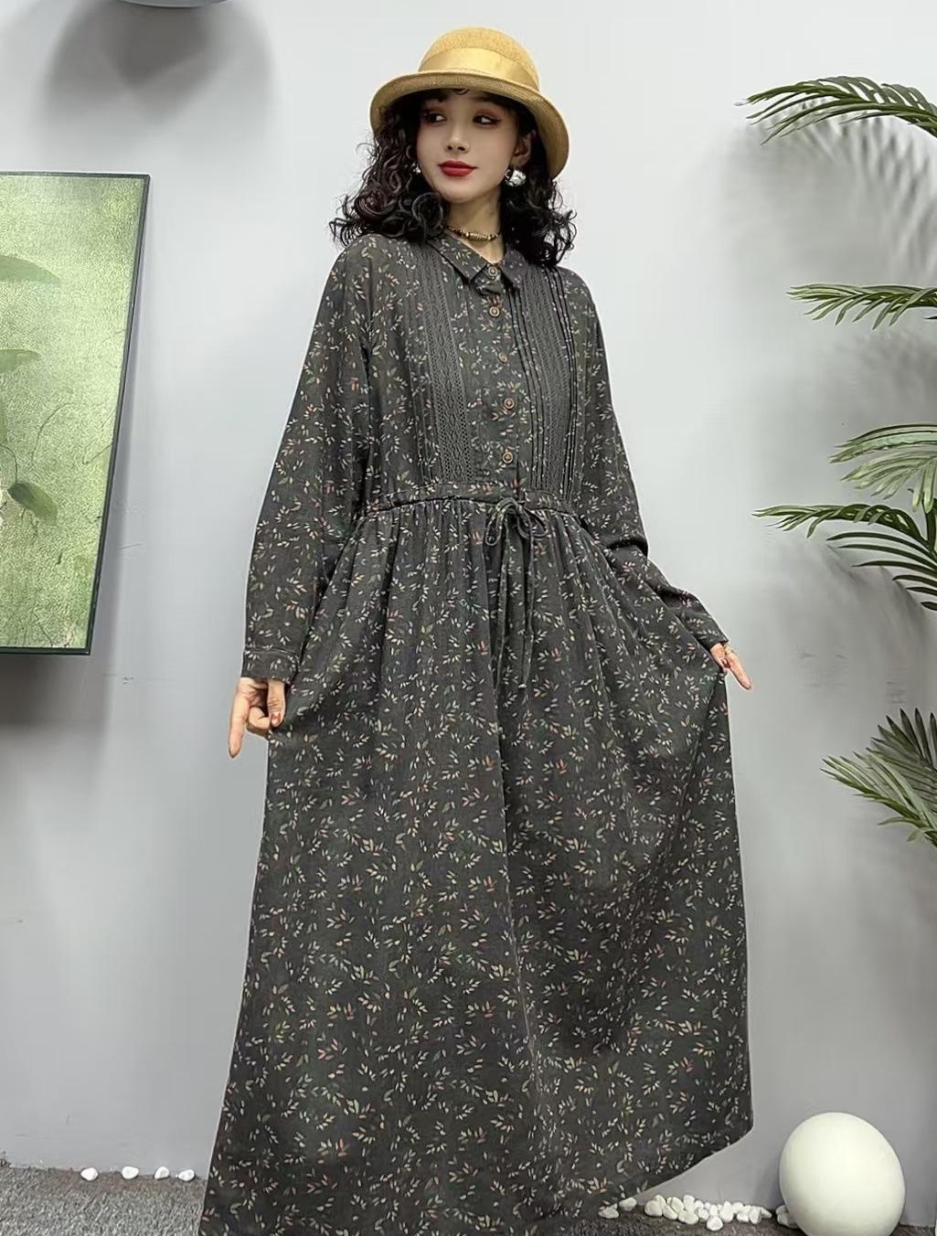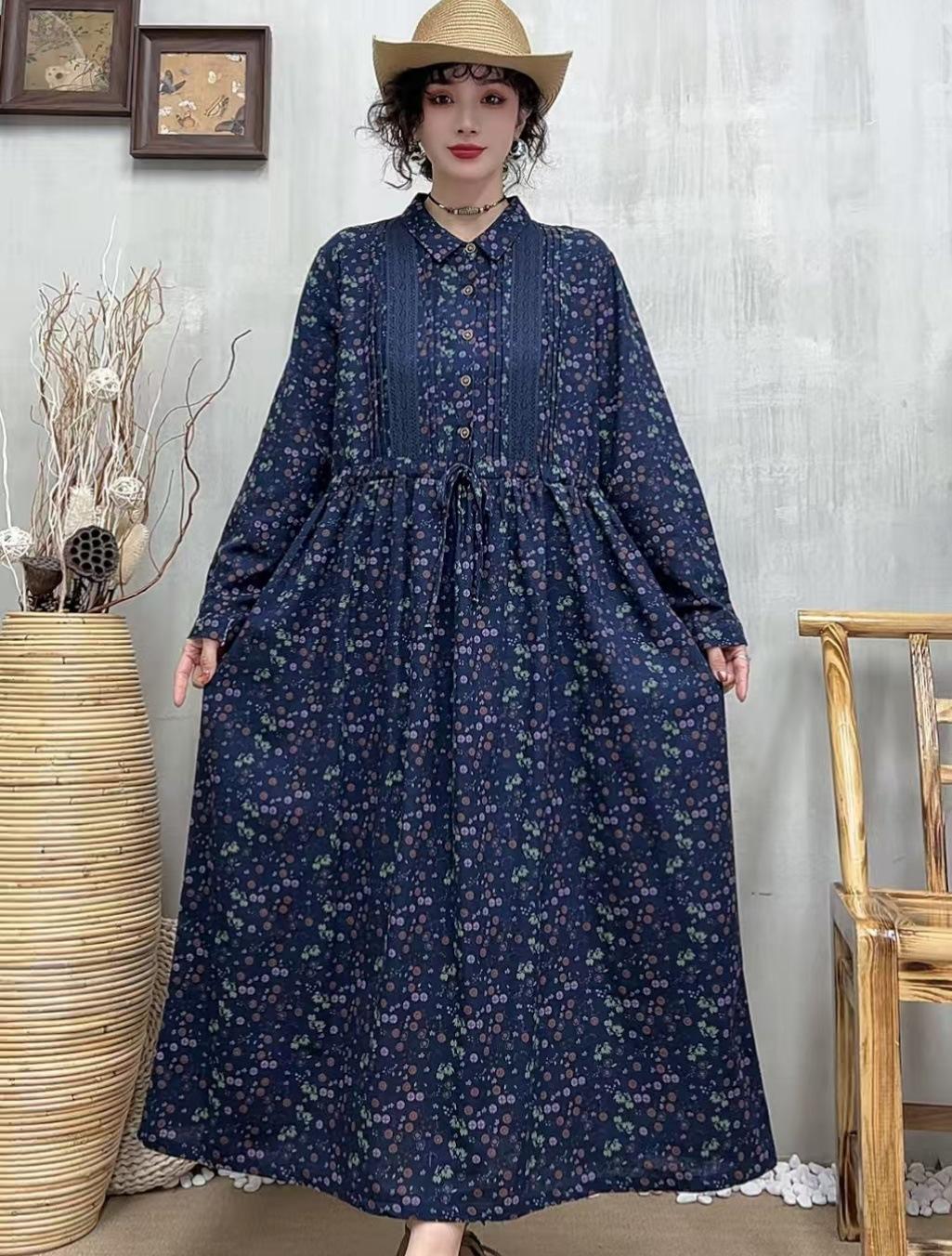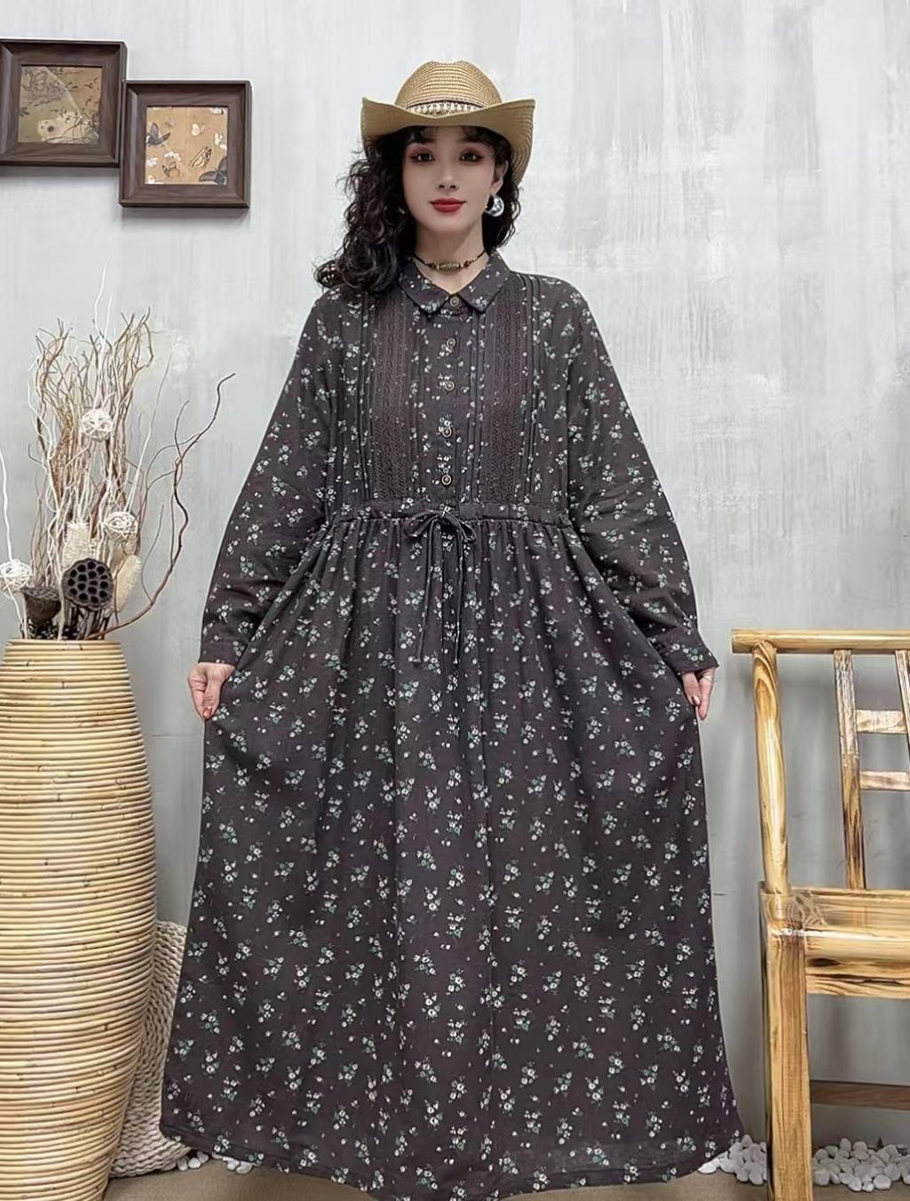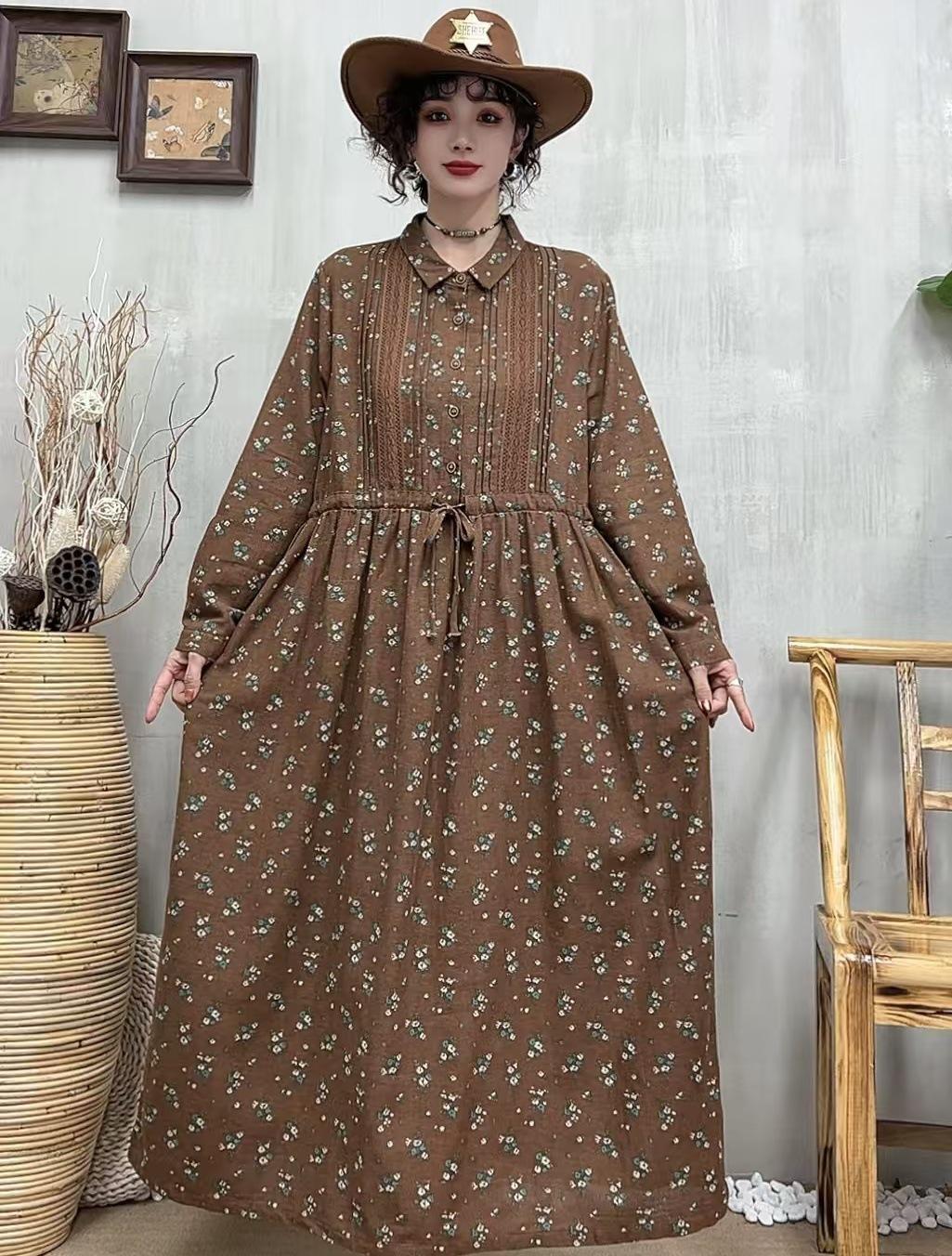 Otoño 2025 Talla Grande Algodón y Lino Camisa Medio Abierta Cuello Falda Larga Floral Cordón Ajustable Suelto Vestido de Mujer