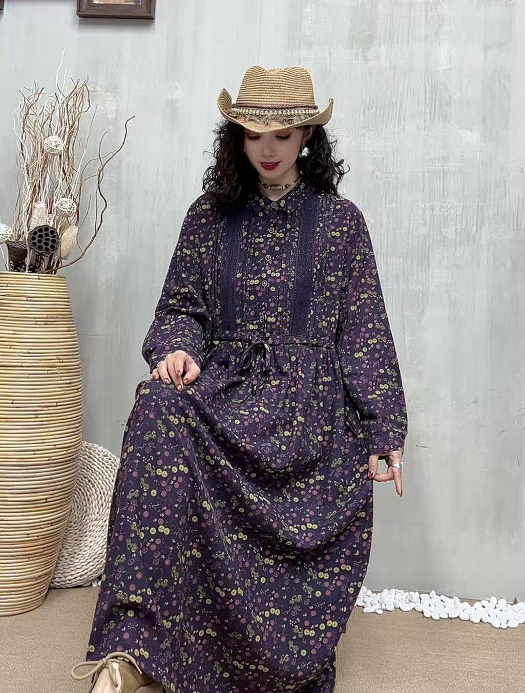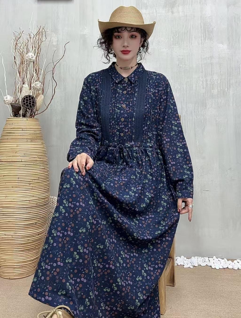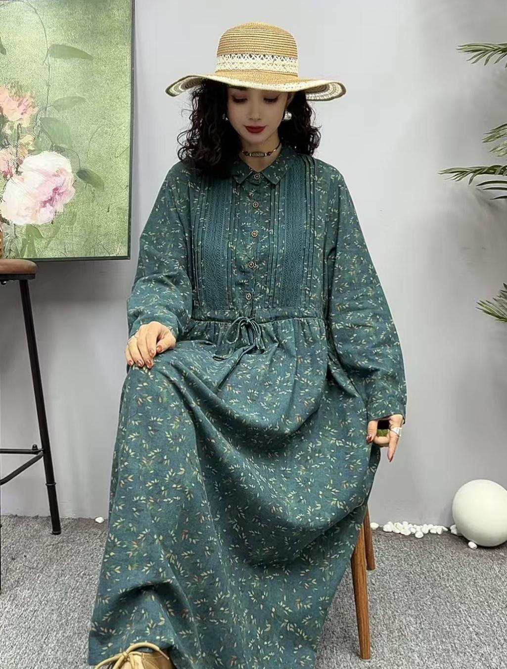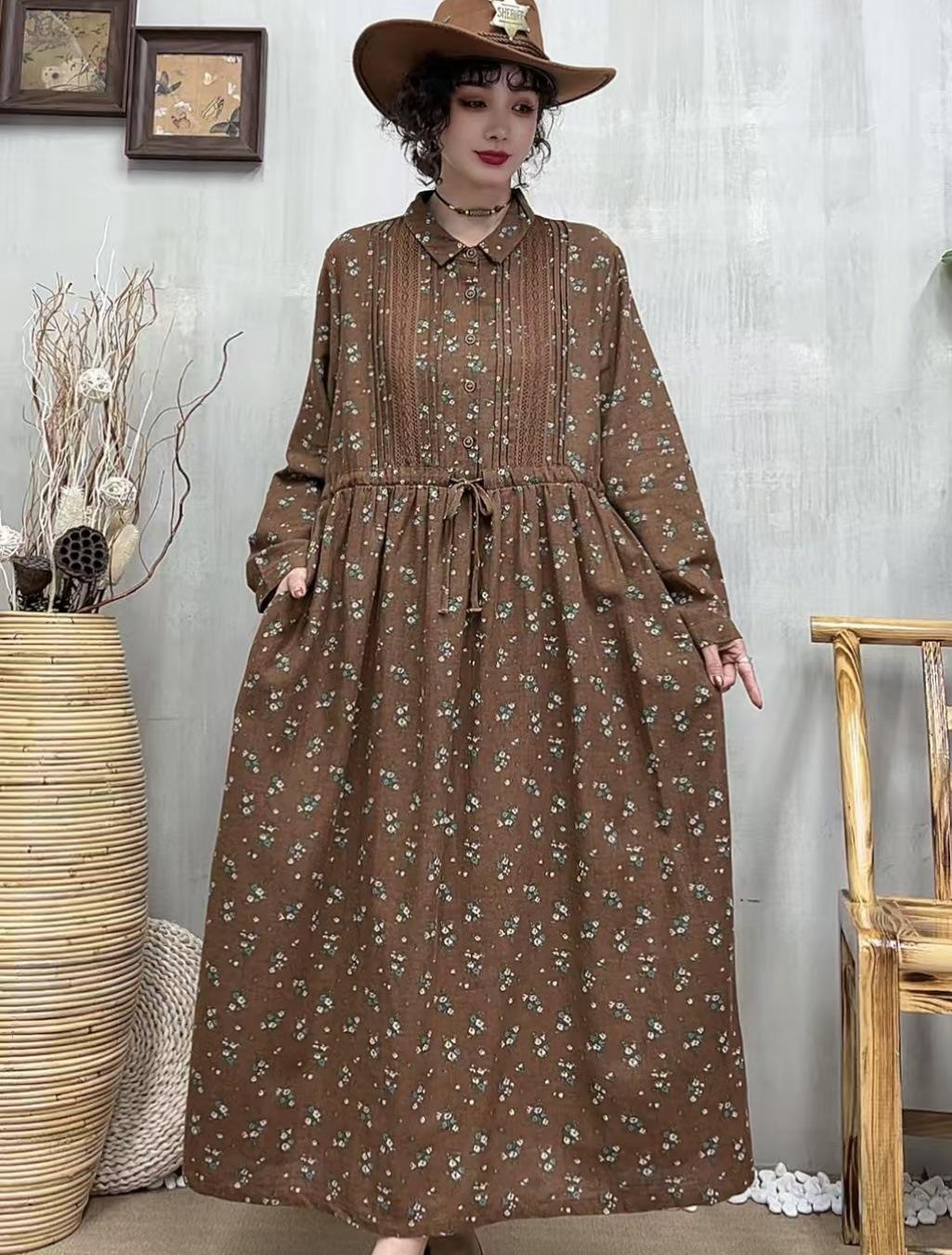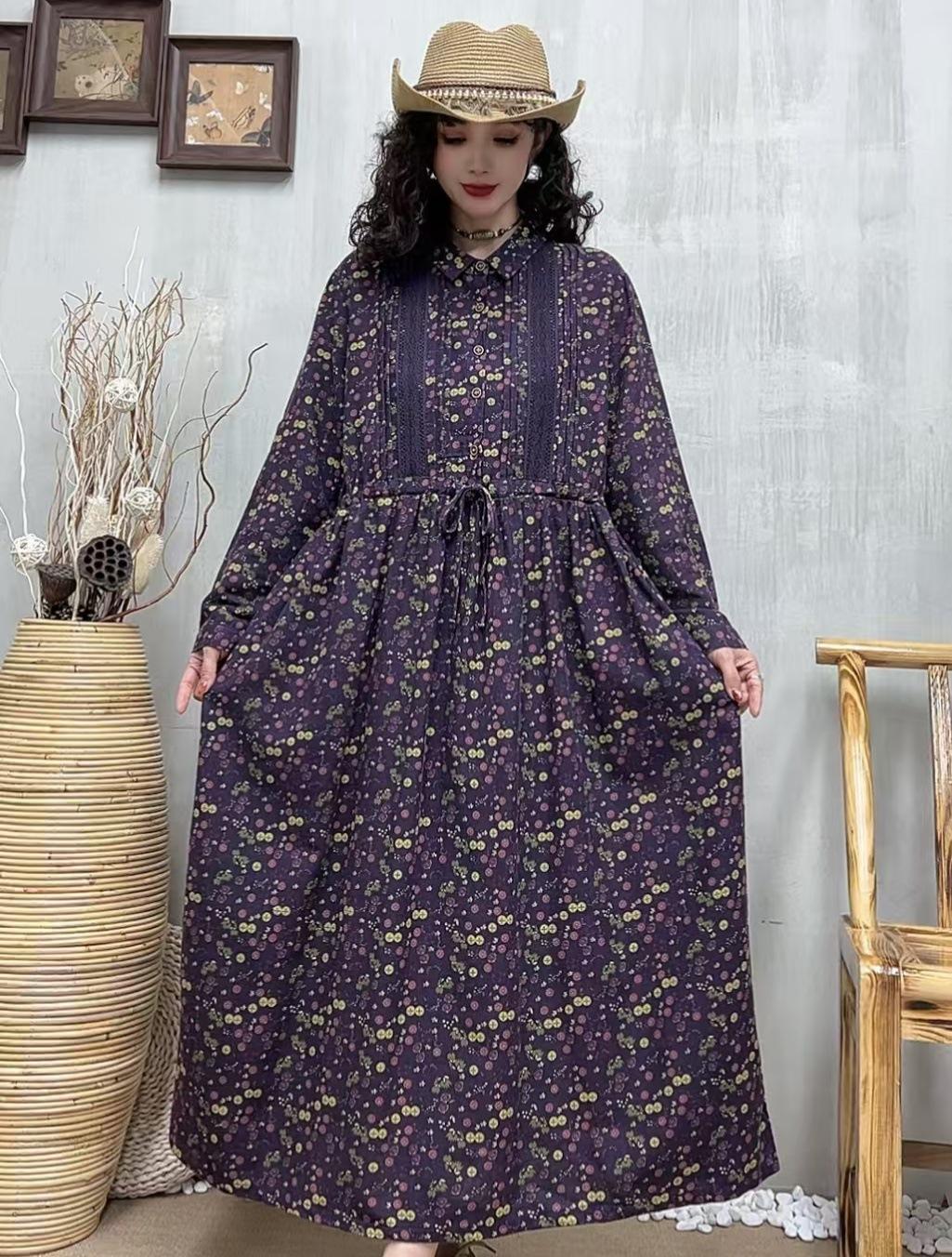 Otoño 2025 Talla Grande Algodón y Lino Camisa Medio Abierta Cuello Falda Larga Floral Cordón Ajustable Suelto Vestido de Mujer