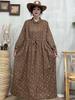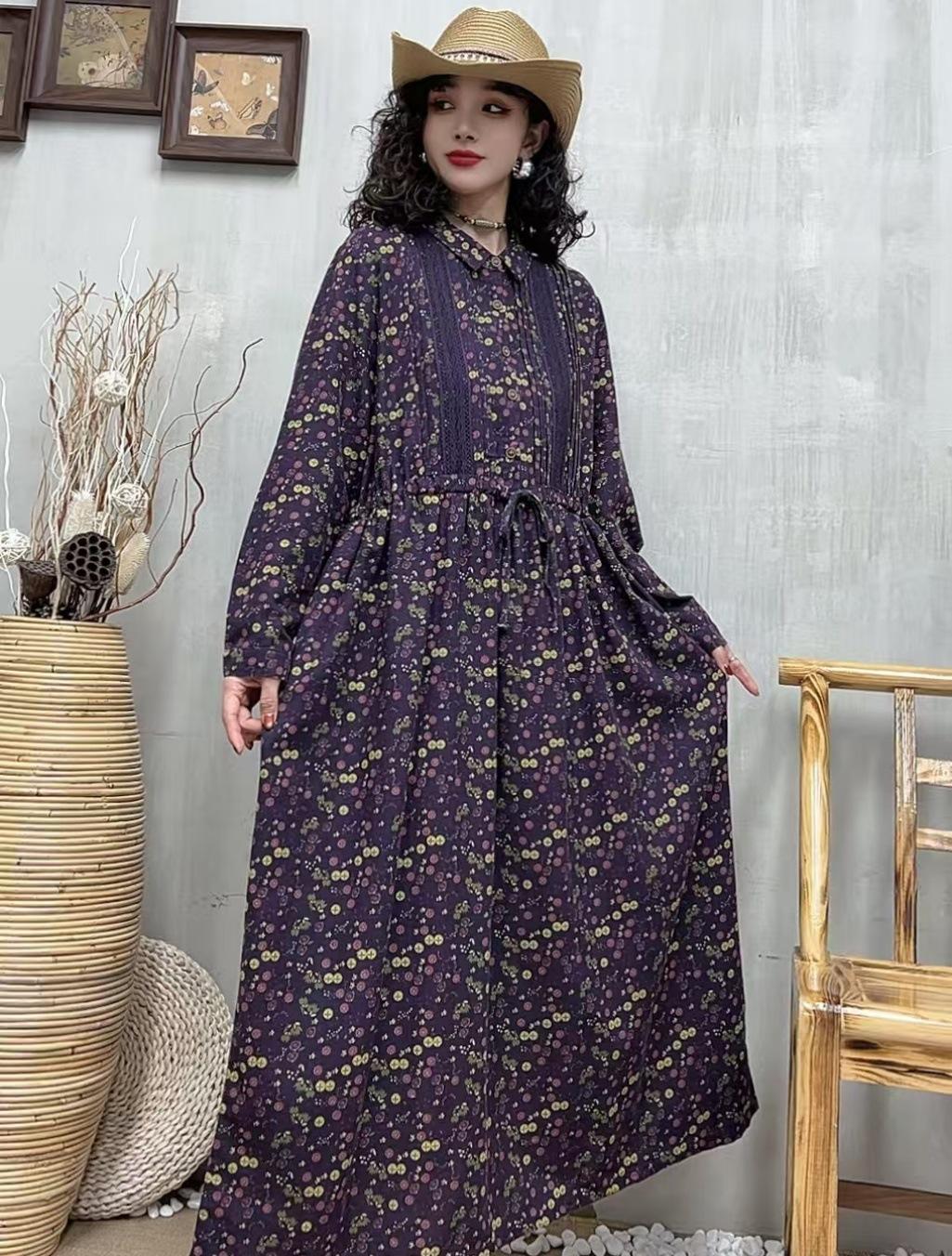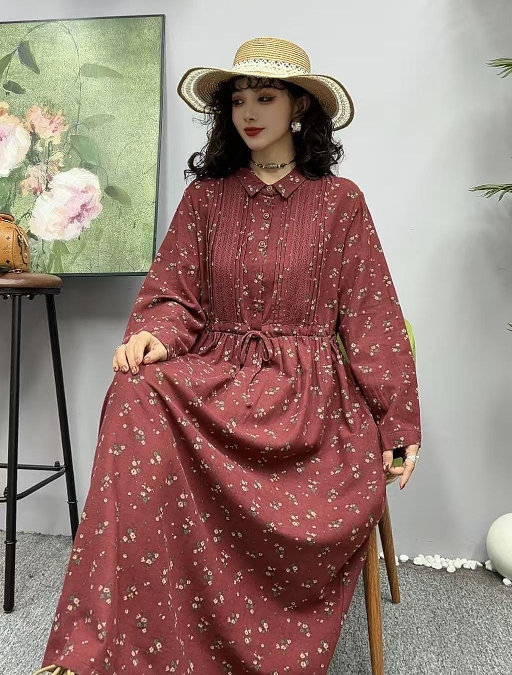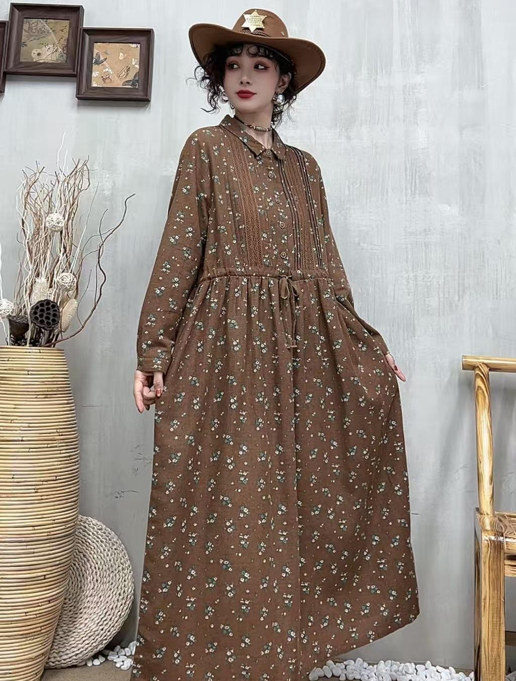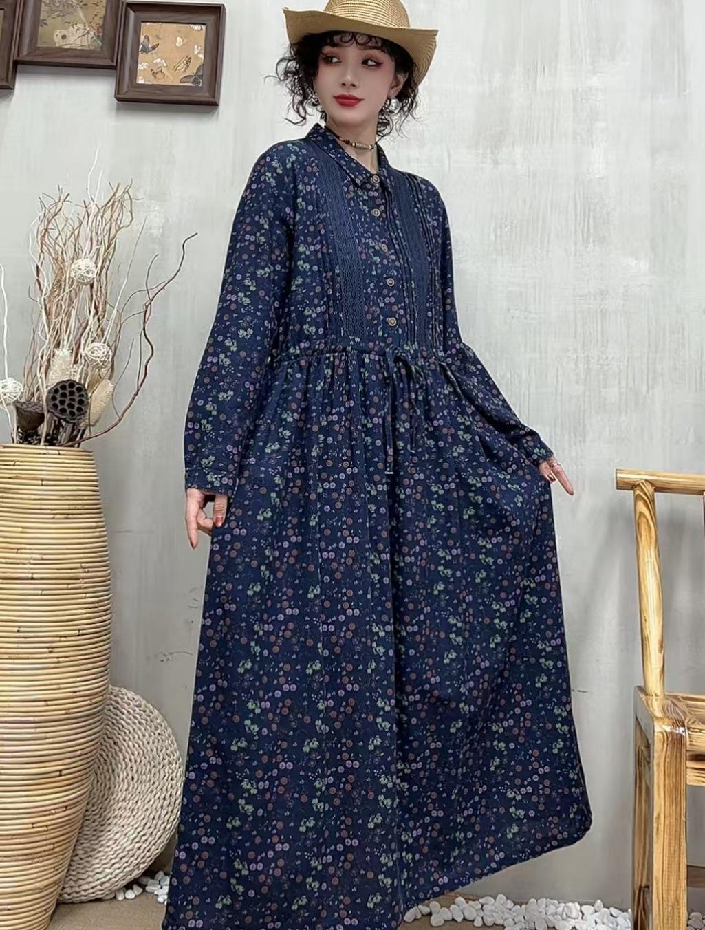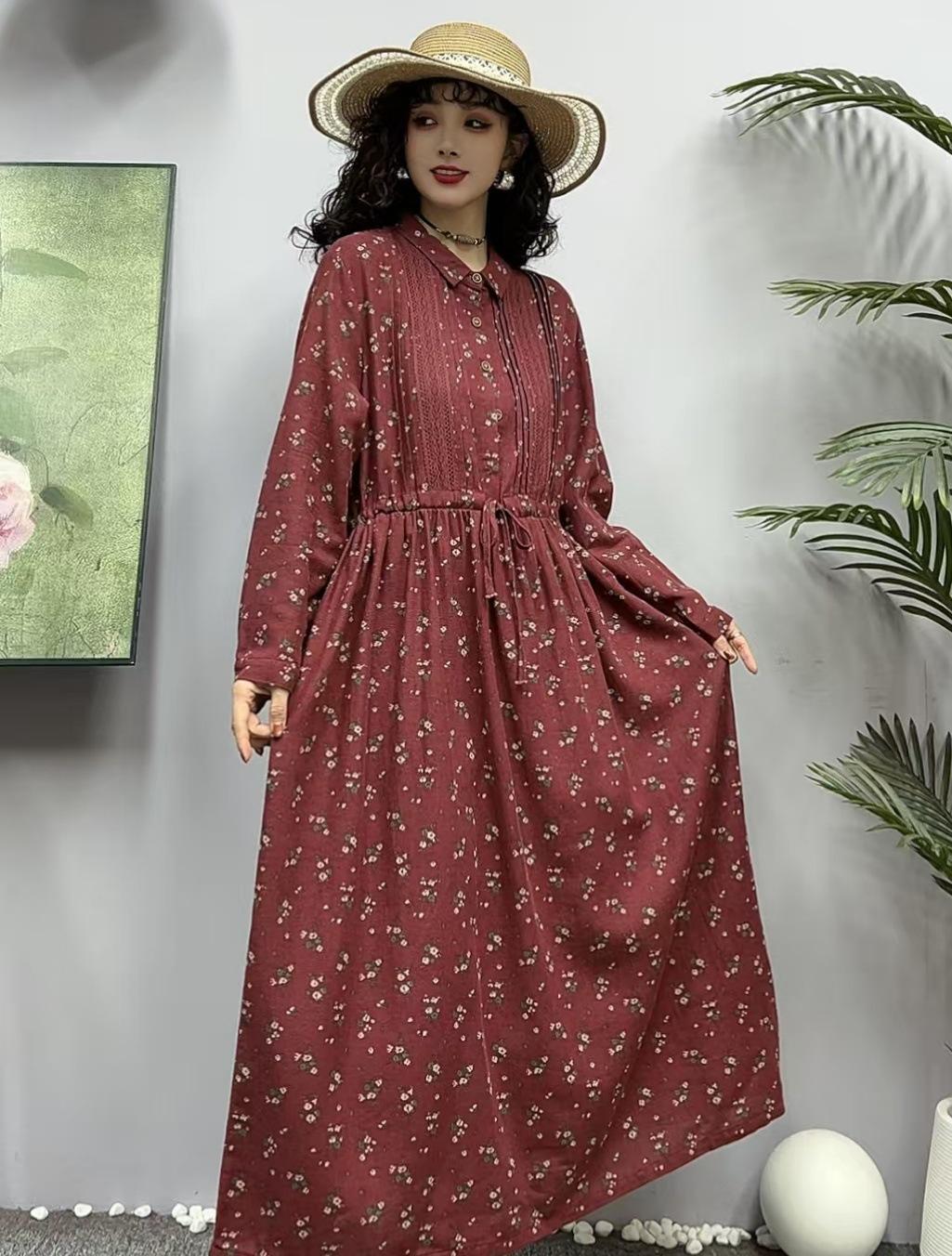 Otoño 2025 Talla Grande Algodón y Lino Camisa Medio Abierta Cuello Falda Larga Floral Cordón Ajustable Suelto Vestido de Mujer