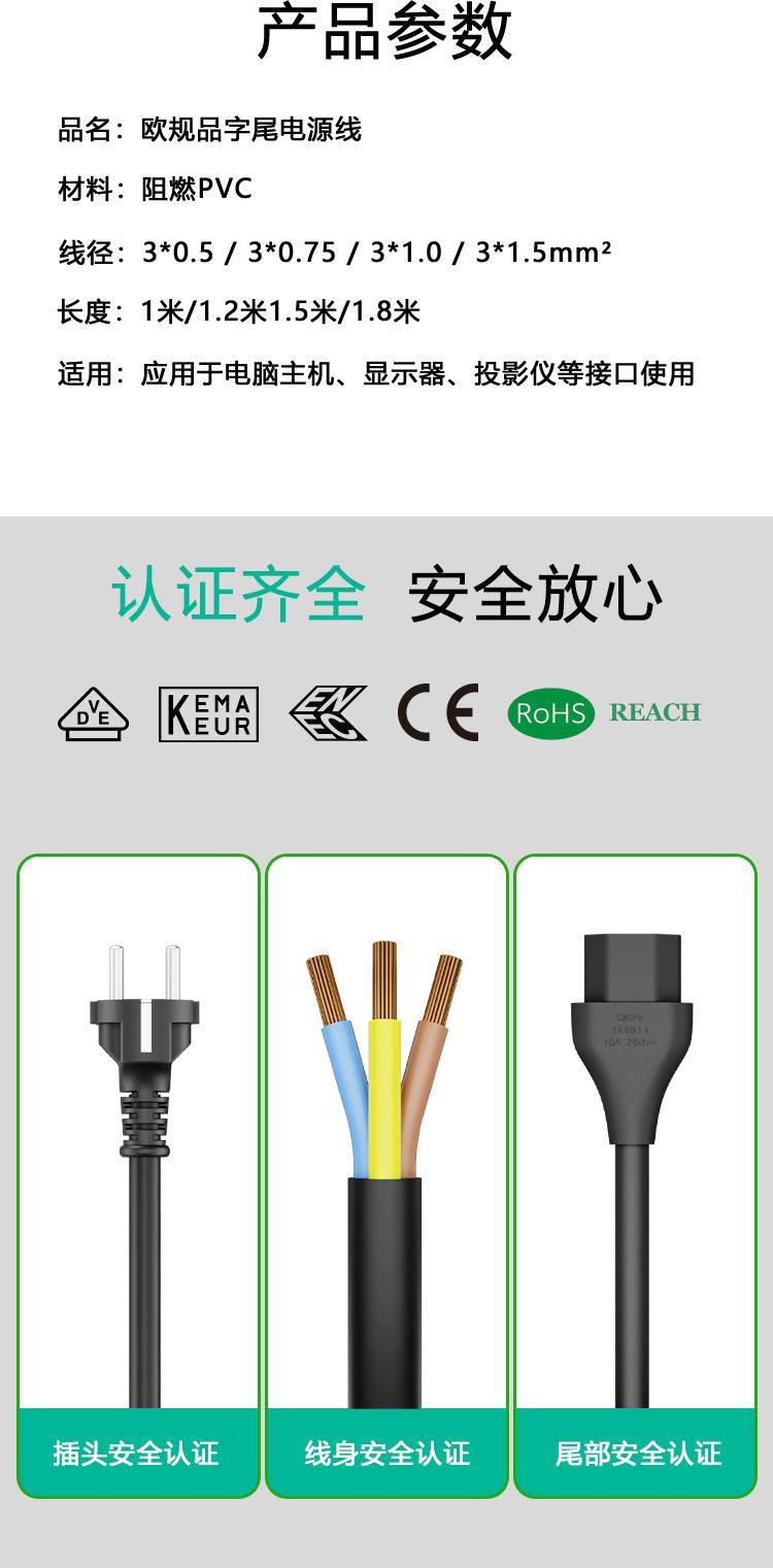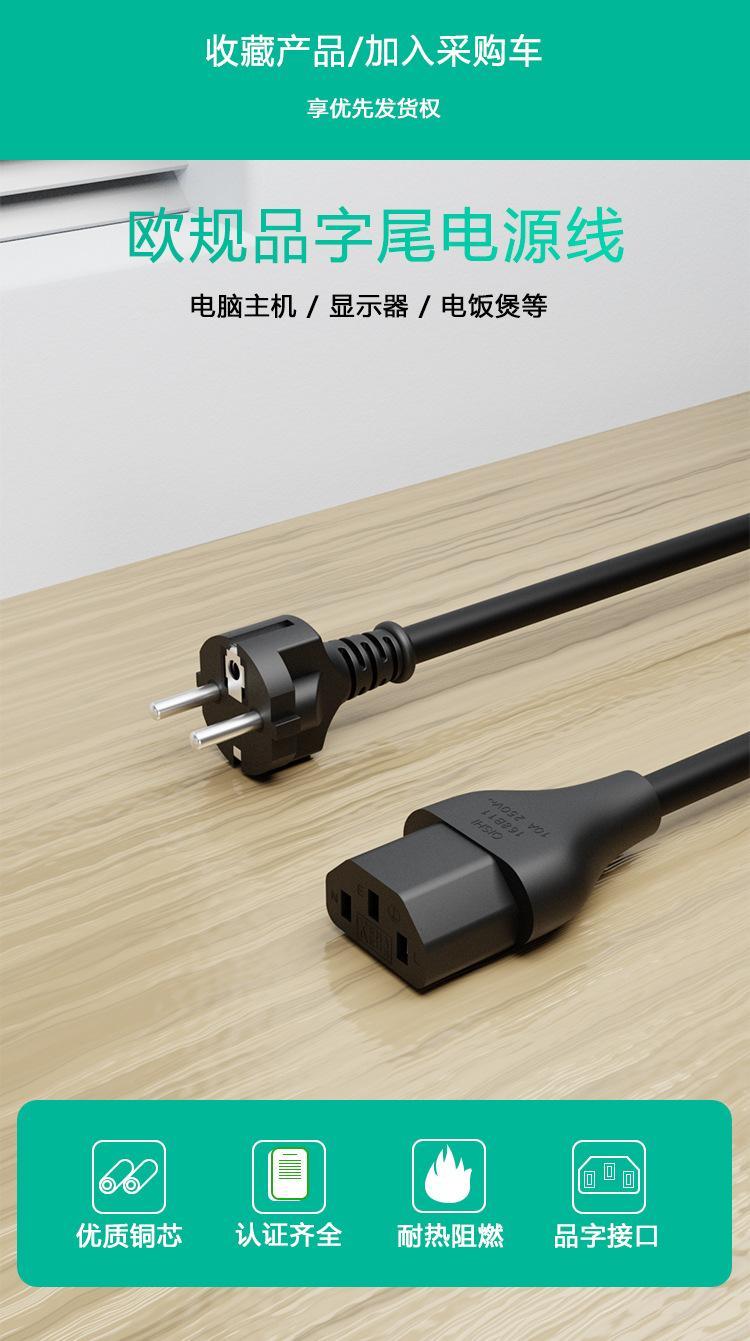 Cable de Alimentación Europeo Codo Cola de Tres Conectores Certificado Vde Extensión Adaptador de Computadora C13 Estilo Francés