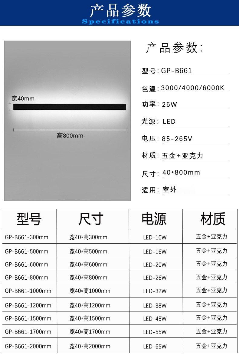 10W-300mm, 16W-500mm, 20W-600mm, 26W-800mm, 32W-1000mm, 38W-1200mm, 48W-1500mm, 55W-1700mm, 65W-2000mm