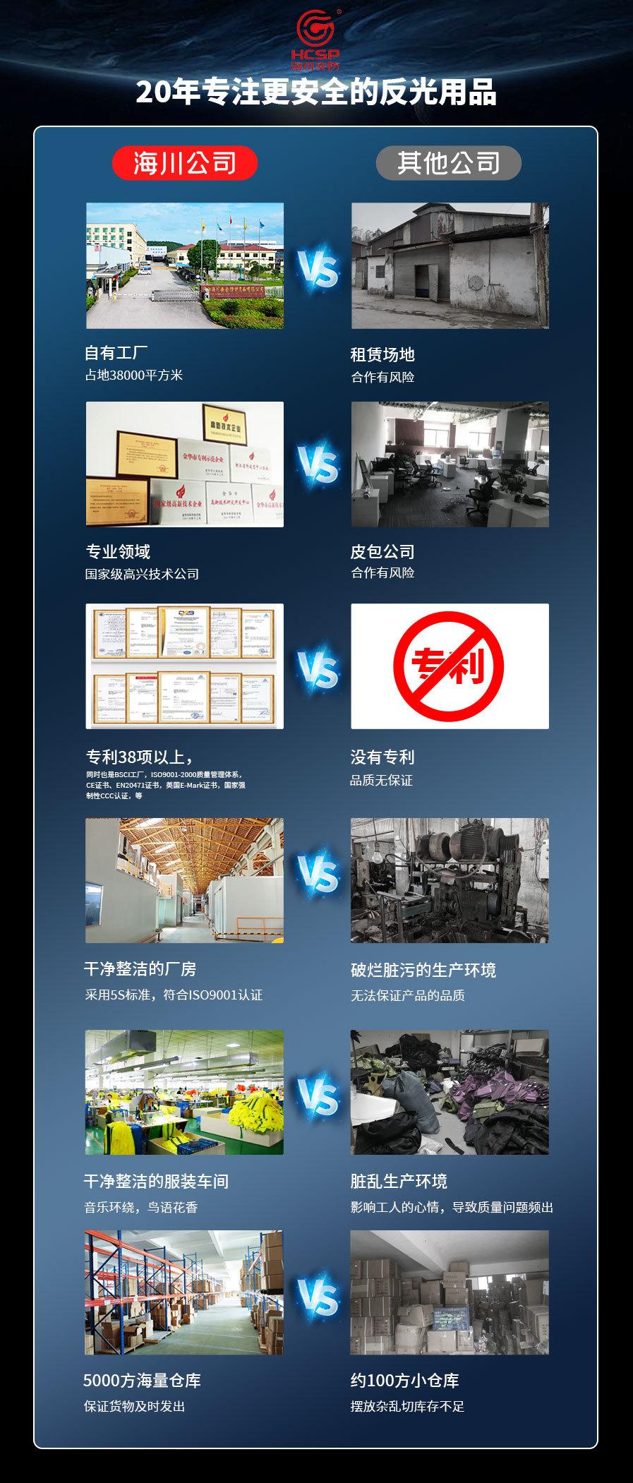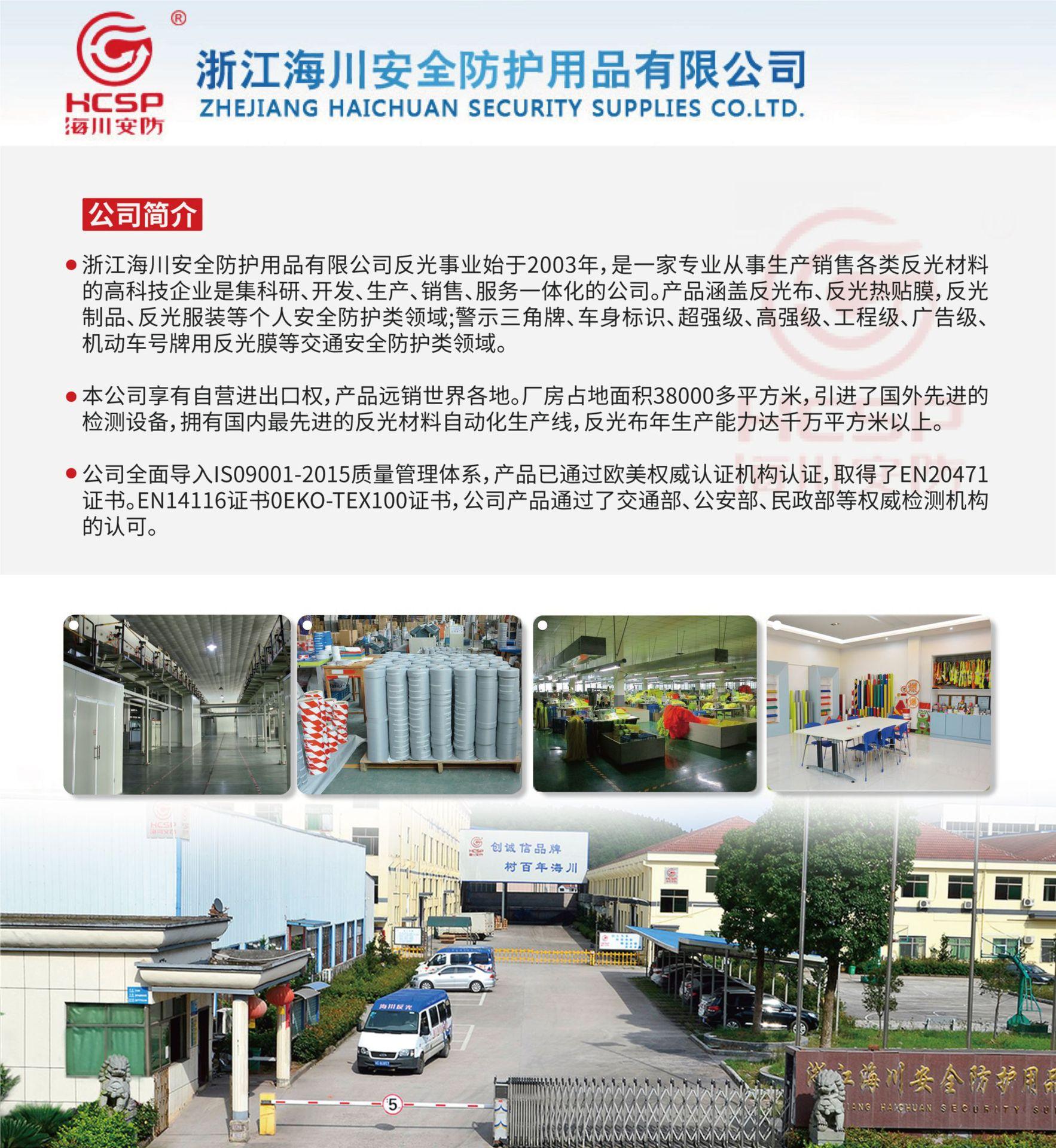 Zhejiang Haichuan Safety Protection Products Co., Ltd. fue fundada en 2003 y se ha centrado en la investigación y desarrollo y producción de materiales reflectantes durante 20 años. Sus productos principales incluyen marcas reflectantes para carrocerías de vehículos, grado de alta intensidad, grado de ingeniería, grado publicitario y series de películas reflectantes para placas de vehículos de motor, así como tela reflectante, película de transferencia de calor, ropa reflectante, productos reflectantes, señales de triángulo de advertencia y otros productos reflectantes. Zhejiang Haichuan Company está ubicada en la ciudad de Jiaodao, condado de Wuyi, ciudad de Jinhua, a 5 kilómetros de la salida de la autopista Jinhua-Lishui-Wenzhou y junto a la Carretera Nacional 330, adyacente a la Ciudad de Ferretería de Ciencia y Tecnología de China, con transporte muy conveniente. Haichuan Company tiene derechos de importación y exportación autogestionados, y sus productos se venden en todo el mundo. La fábrica cubre un área de más de 38,000 metros cuadrados y ha introducido equipos de prueba extranjeros avanzados, poseyendo líneas de producción automatizadas nacionales para materiales reflectantes.