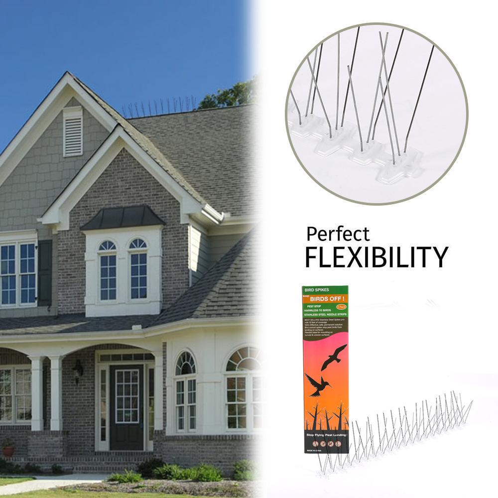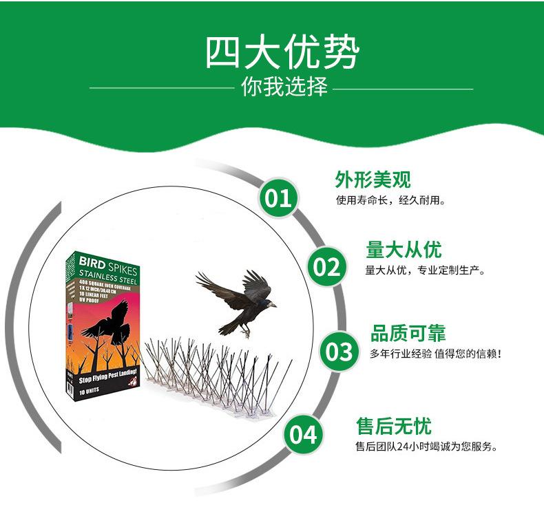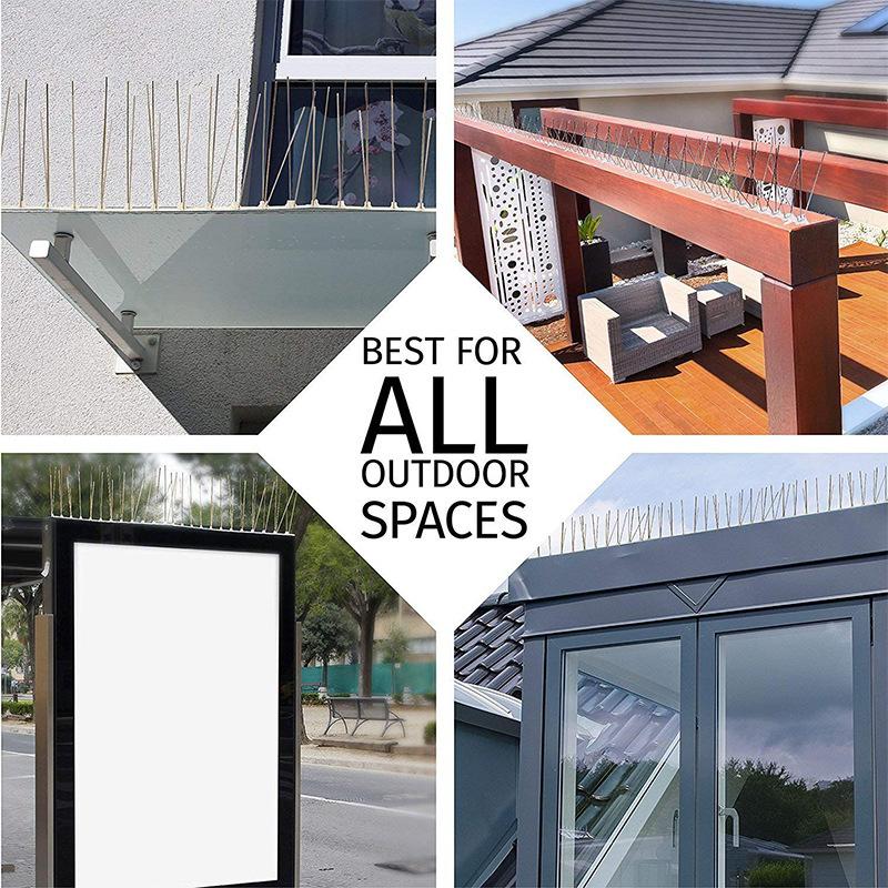 1. Las púas antipalomas son un producto generalizado, económico, práctico que puede prevenir ataques de aves. Son efectivas, embellecen el entorno, fáciles de mantener, tienen una larga vida útil y brindan beneficios a largo plazo después de una instalación única.2. Las púas antipalomas son adecuadas para lugares que necesitan protección como edificios, fábricas de alimentos, fábricas farmacéuticas, hoteles, etc., y se pueden instalar en paredes, aleros, alféizares de ventanas, balcones, barandillas, copas de farolas, etc., donde las aves pueden posarse.3. Hecho de plástico y acero inoxidable, la vida útil es de más de 10 años.4. Este tipo de pico a prueba de pájaros se ha utilizado en países extranjeros durante diez años y se puede utilizar en una variedad de escenarios.