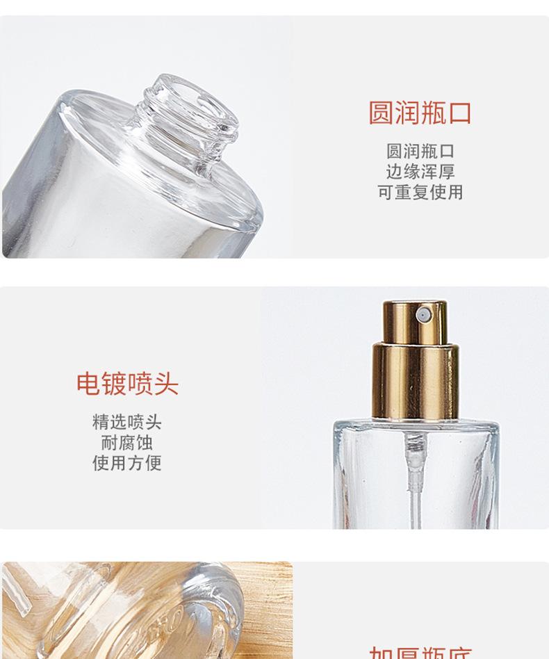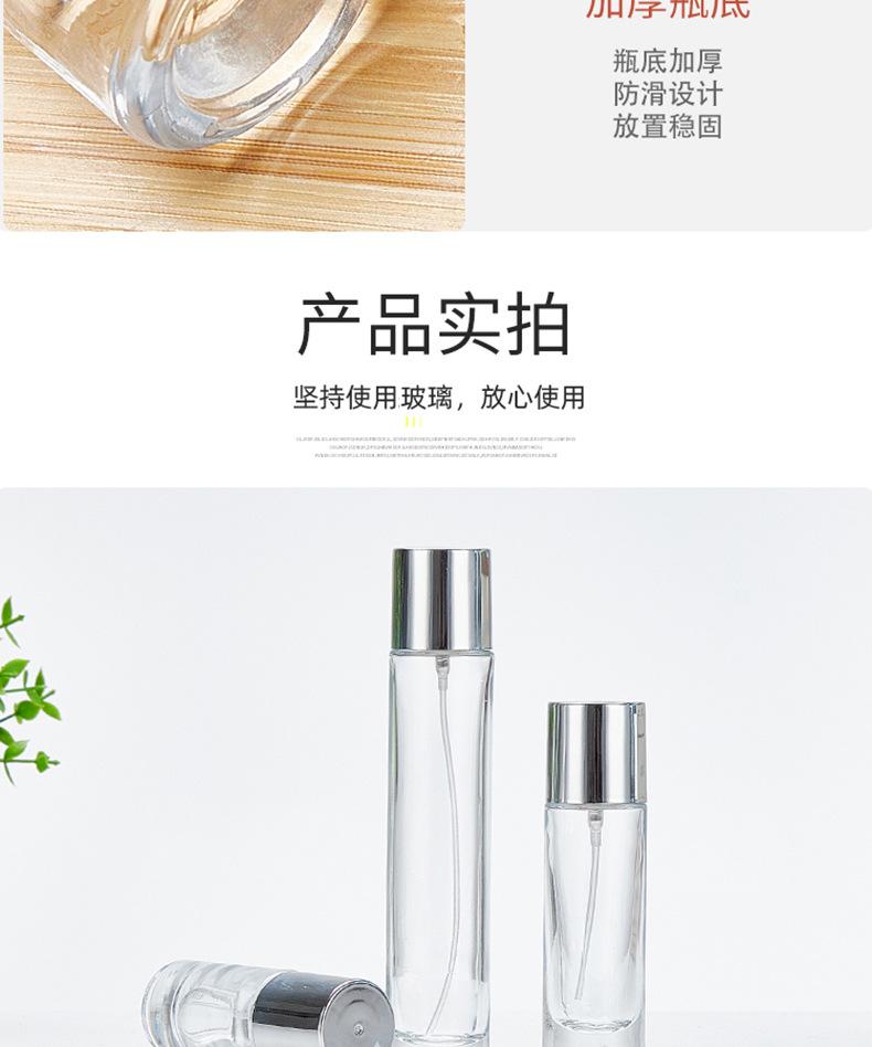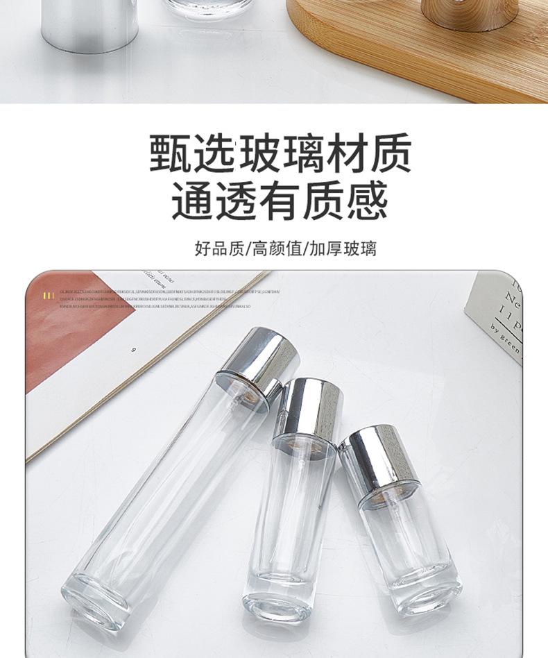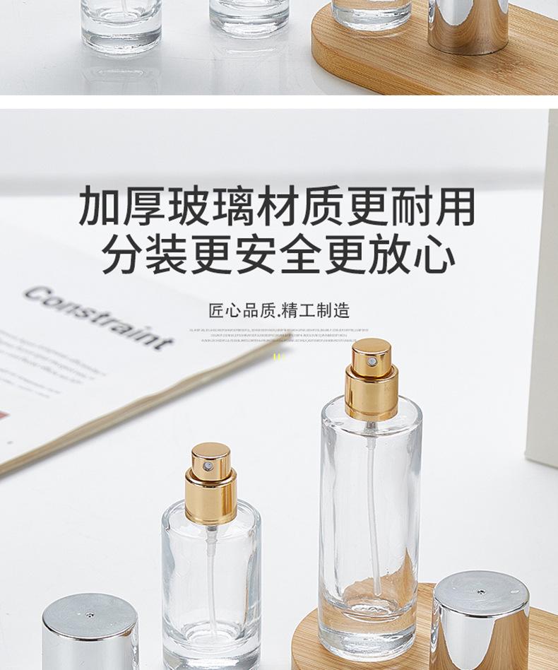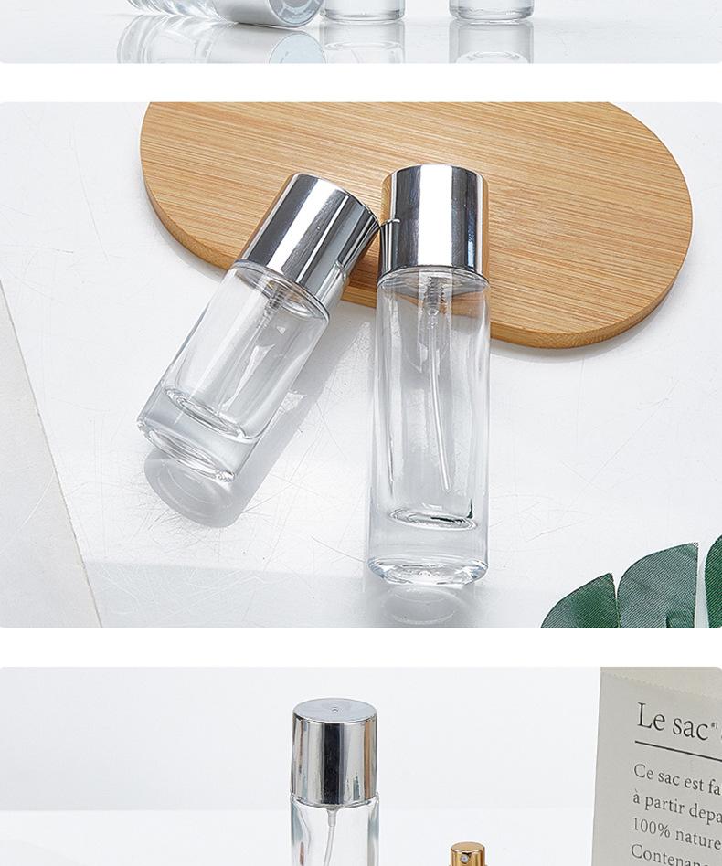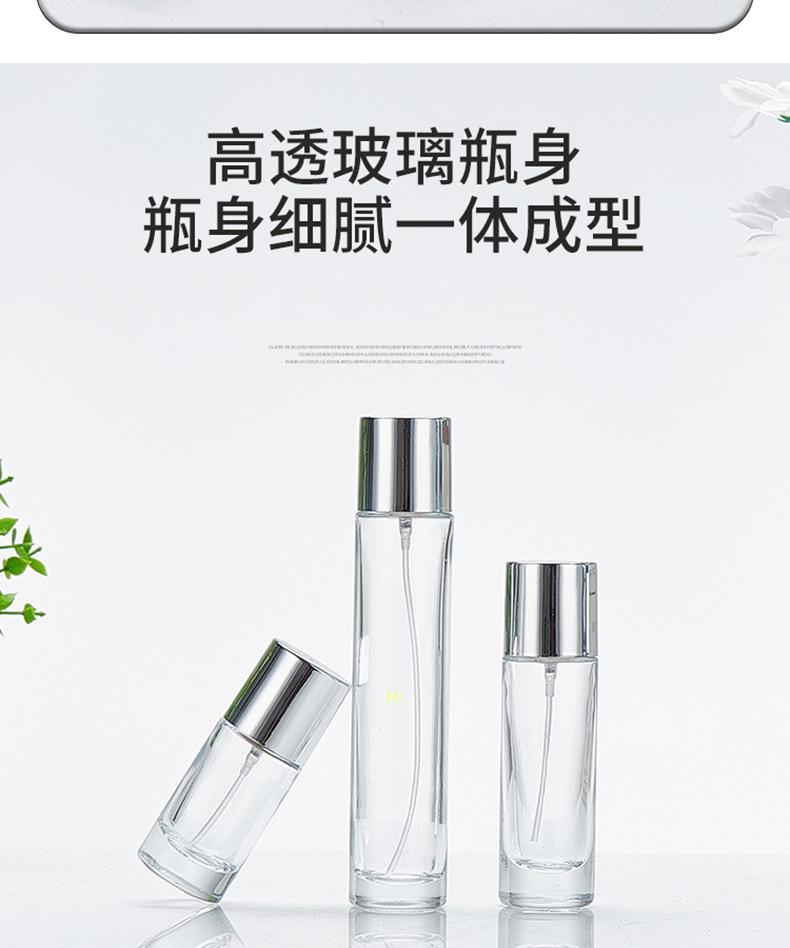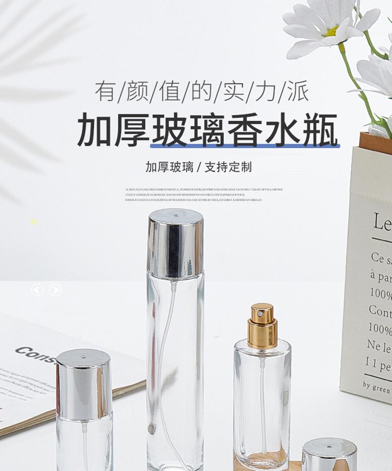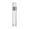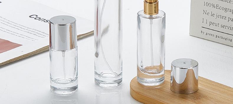 Frasco cilíndrico de vidrio para perfume, tapa plateada con rosca, pulverizador, ideal para cosméticos.