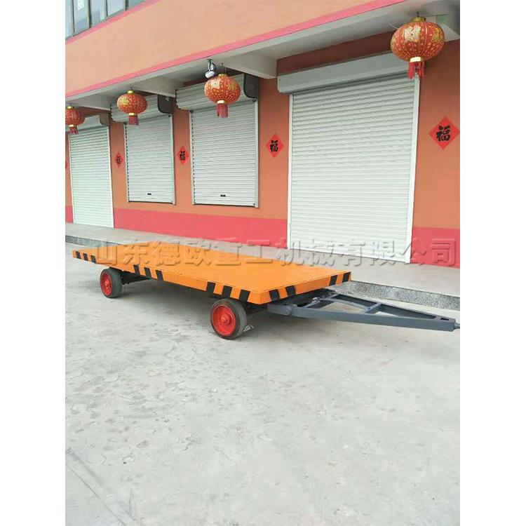 Los camiones de plataforma generalmente utilizan neumáticos sólidos inflables, con plataforma baja y gran capacidad de carga. No hay riesgo de pinchazos ni reventones. Son sencillos y duraderos. No requieren motor y requieren un tractor o una carretilla elevadora para remolcarlos. Generalmente, se utiliza un tren de uno o más camiones de plataforma y una carretilla elevadora o un tractor para transportar mercancías horizontalmente o transportar equipos pesados. Se utilizan ampliamente en aeropuertos, puertos, estaciones de tren, fábricas y grandes almacenes. Mejoran la eficiencia del transporte de carga y reducen el consumo de montacargas y la mano de obra.