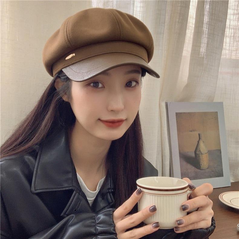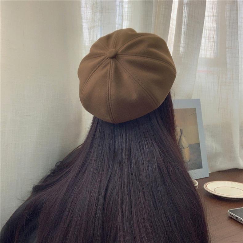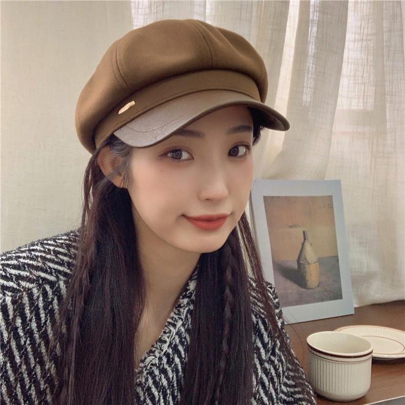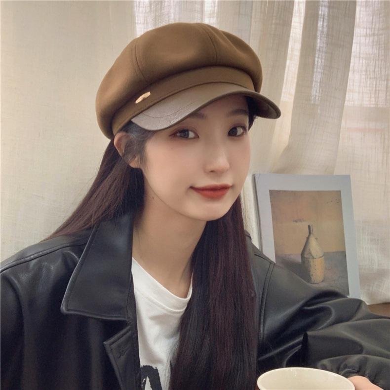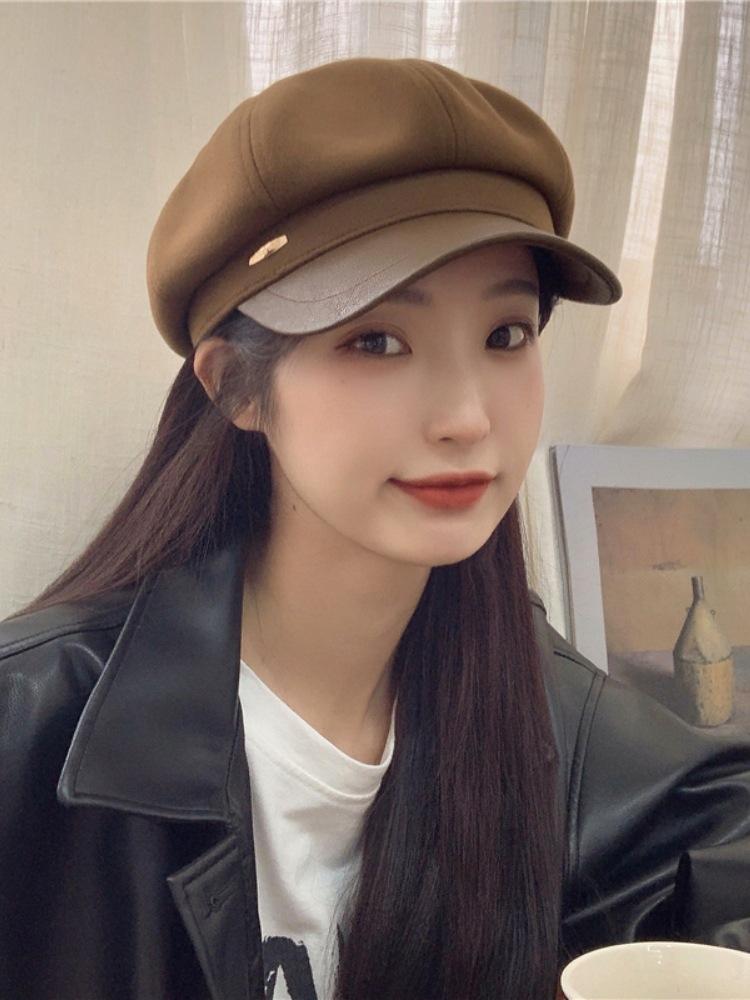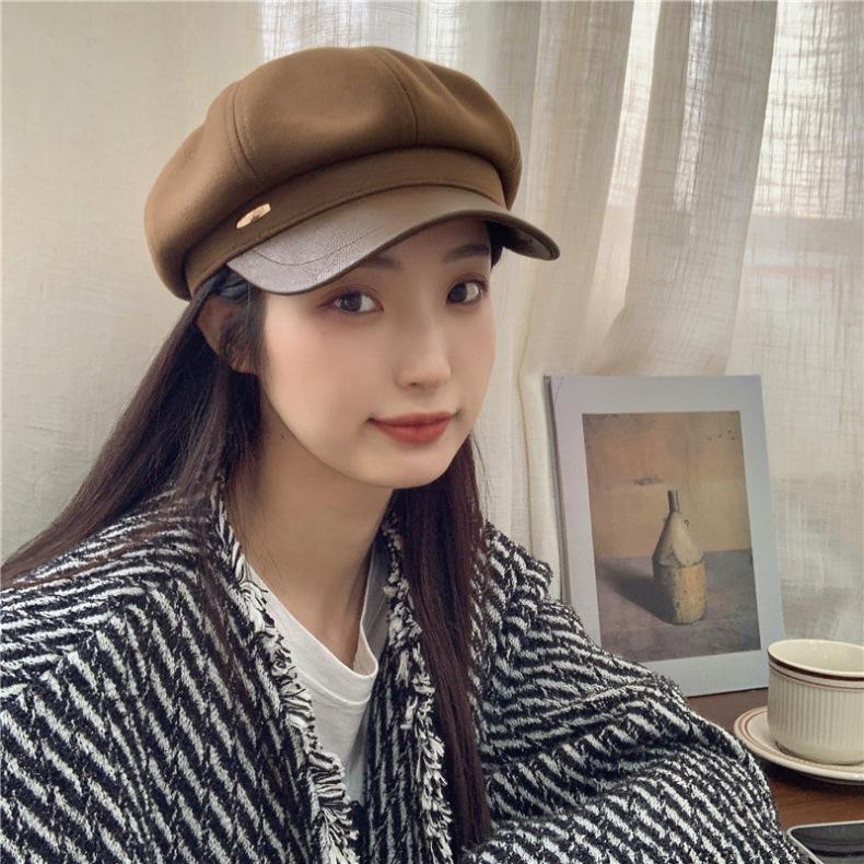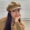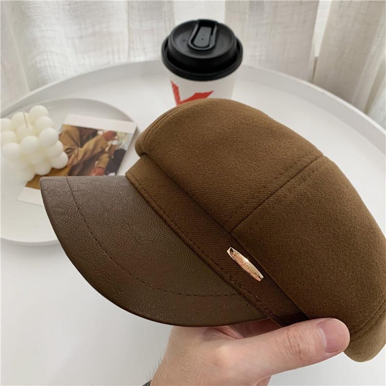 Boina de otoño marrón cálido con costuras de lana sintética para mujer, estilo coreano, otoño e invierno, versátil, retro, elegante, de moda, sombrero octogonal