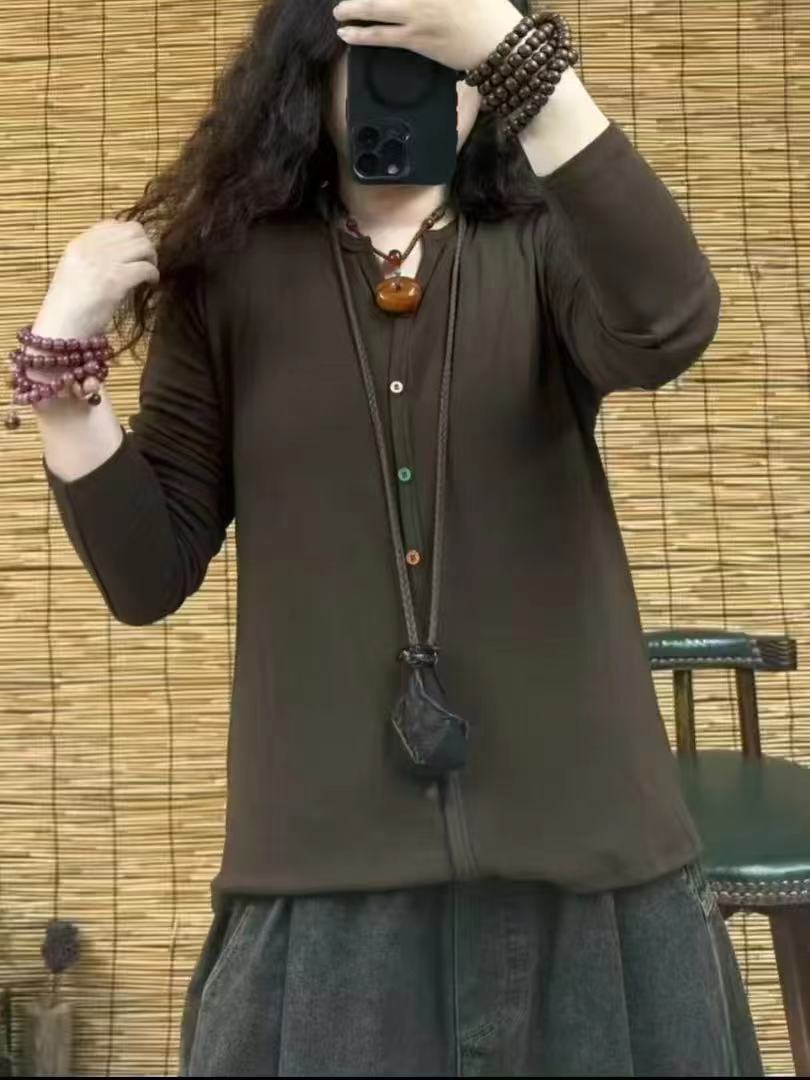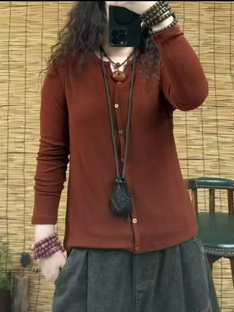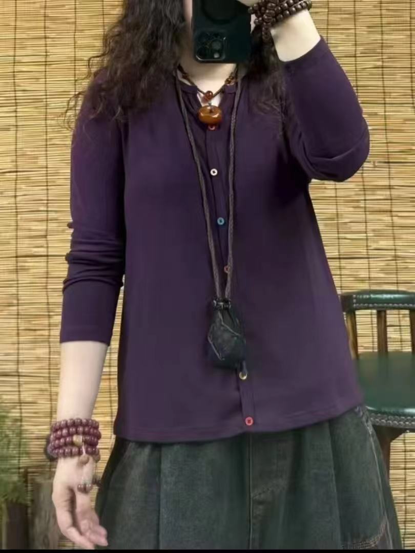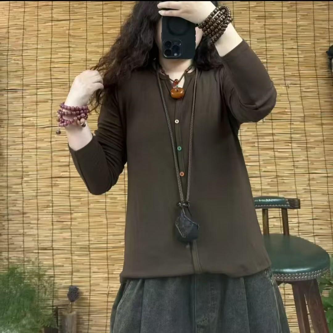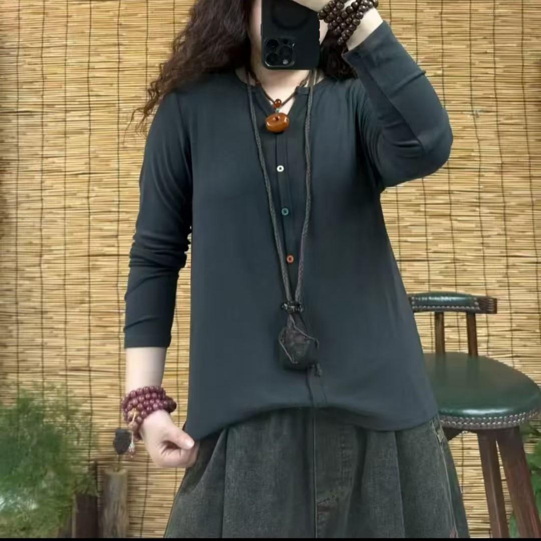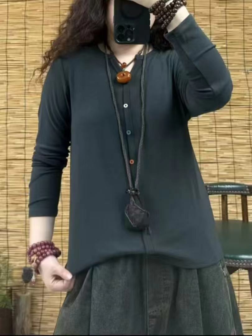 Otoño 2025 Nuevo Literario Color Sólido Camiseta Base Suelta Lisa Casual Versátil Adelgazante
