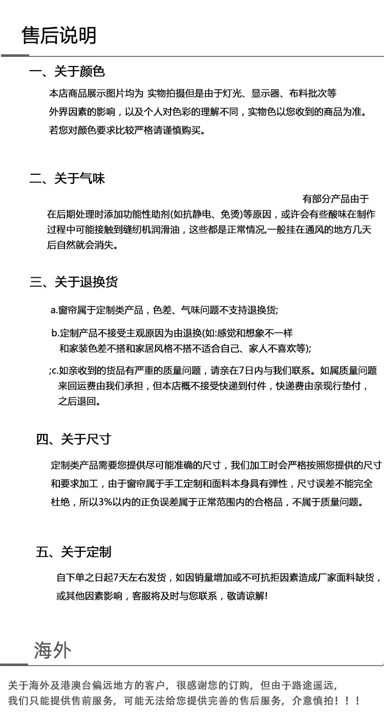 4. Al comprar en línea, es inevitable que haya diferencias de color. Todas nuestras cortinas son fotos reales, pero no podemos garantizar que no haya diferencias de color en el monitor del comprador. La tienda no acepta devoluciones ni cambios relacionados con diferencias de color. Las telas teñidas suelen tener olor. Si no soporta el olor, ¡tenga cuidado al comprar!