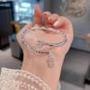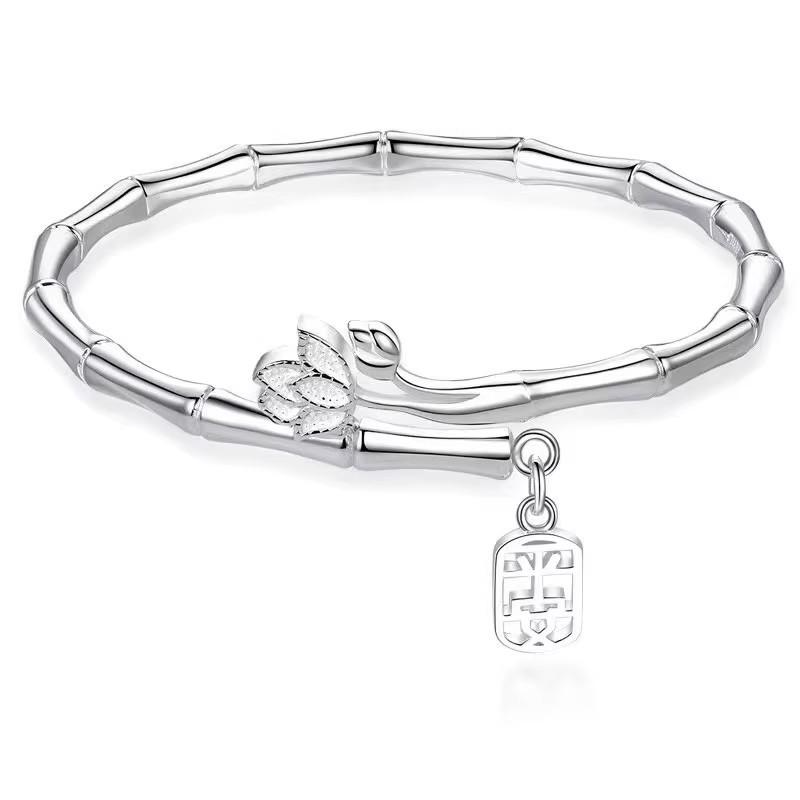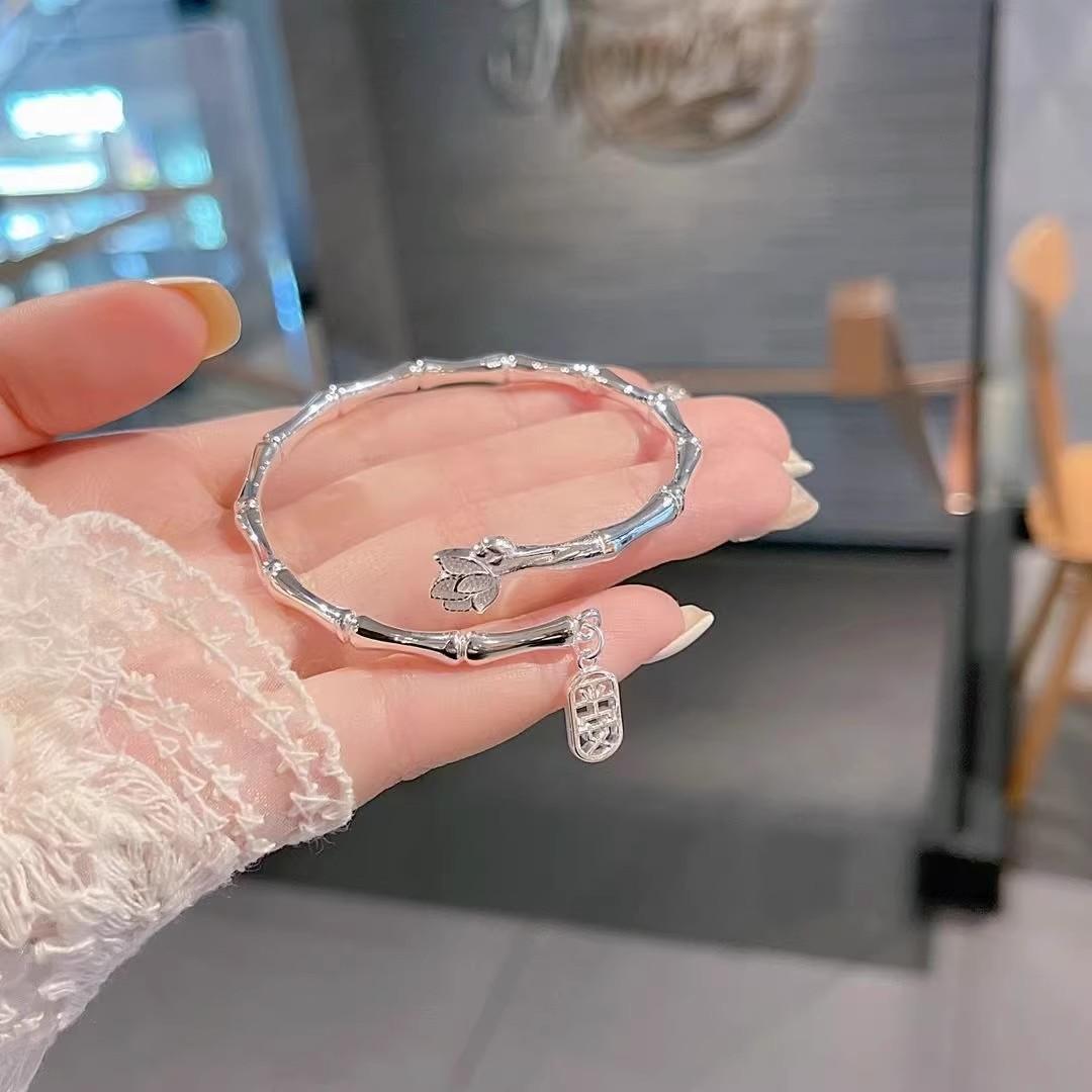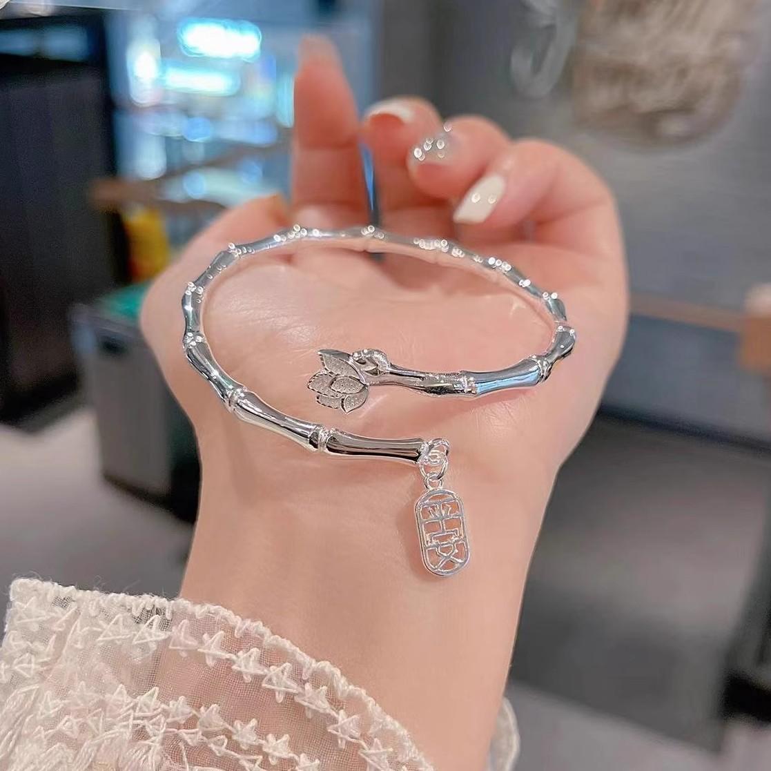 Pulsera de plata pura S999 con bambú, segura para periódicos, pulsera de plata para mujer, plata esterlina maciza, pulsera de loto abierta, regalo para novia, Día de San Valentín