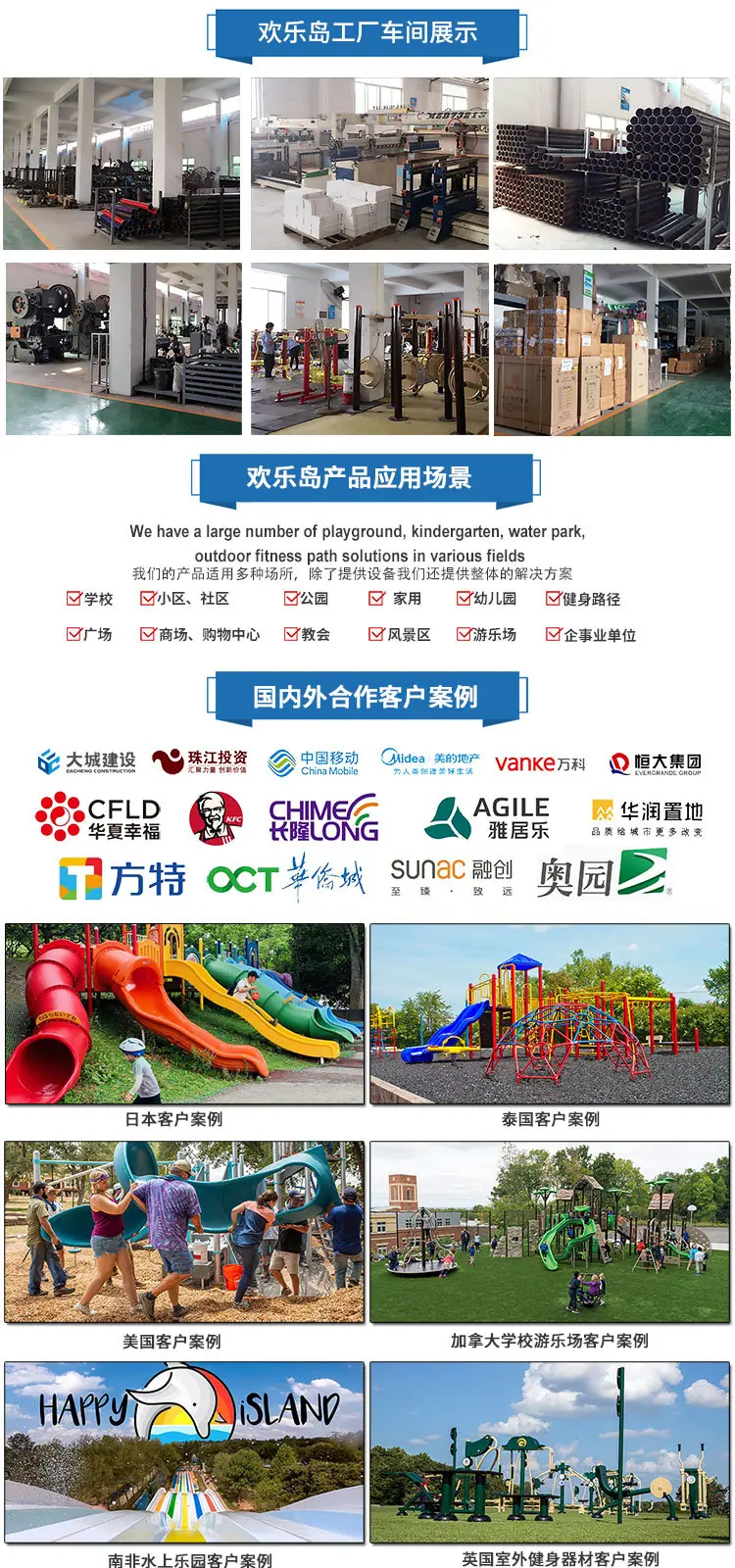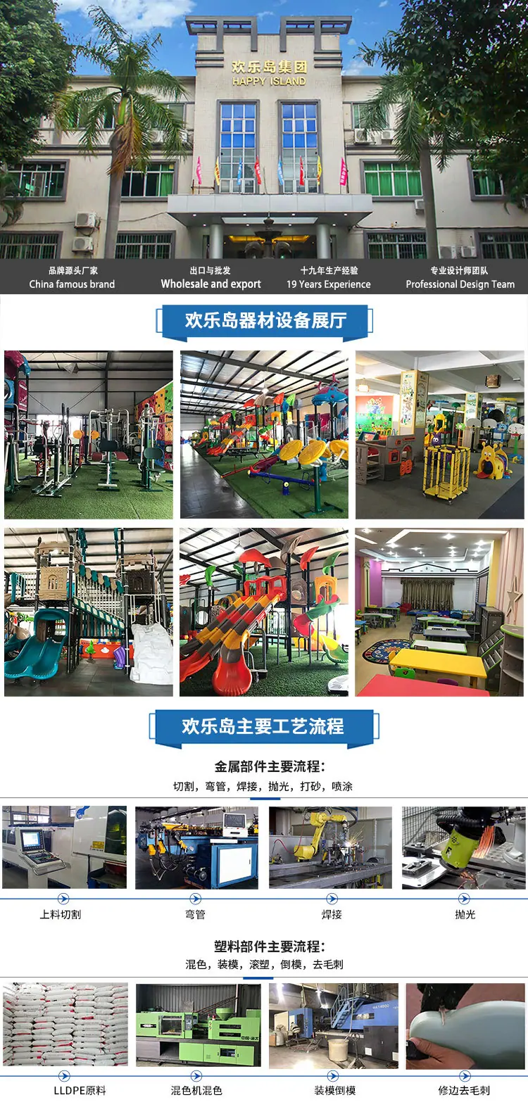 Happy Island Company se fundó en 2003 con un capital social de 10,2 millones de yuanes. Cuenta con una base de investigación y producción científica de 50.000 metros cuadrados, operada de forma independiente, especializada en el diseño y la producción de instalaciones de salud y fitness para jardines de infancia, zonas residenciales, patios privados, parques, centros comerciales y otros espacios de actividades.