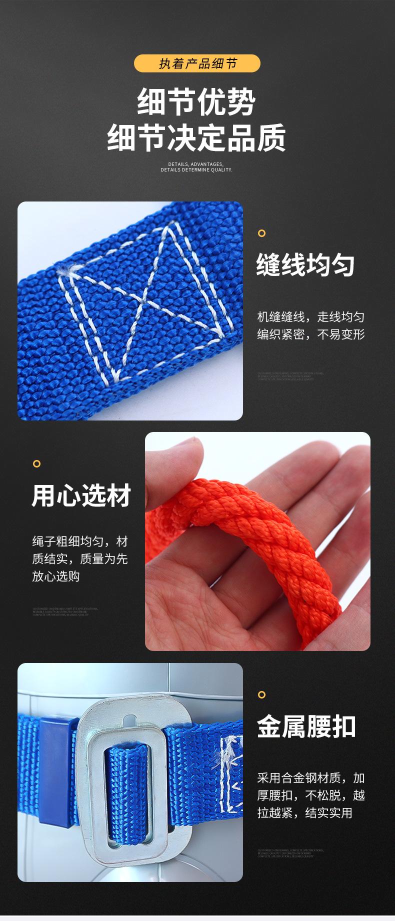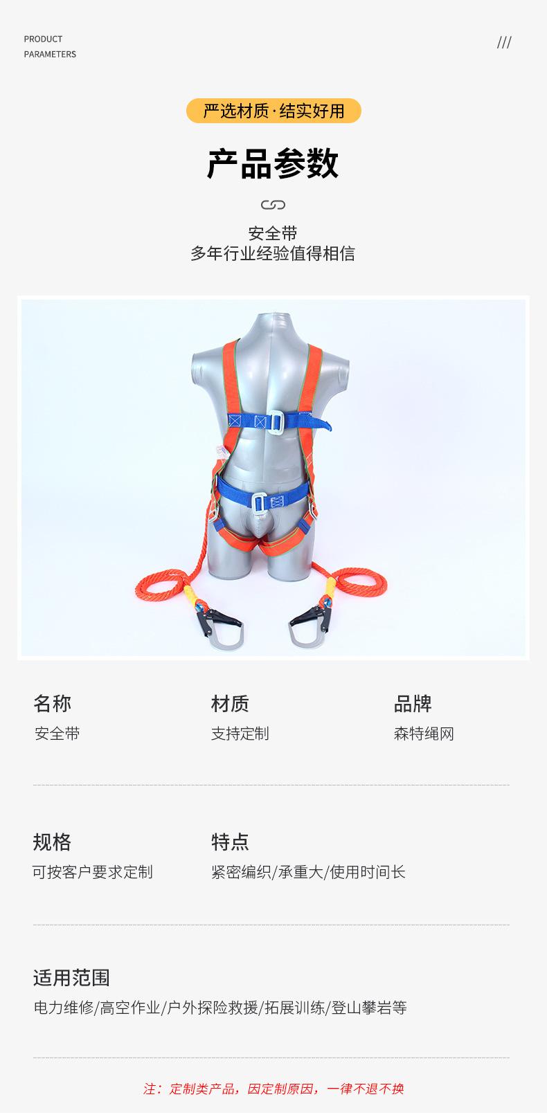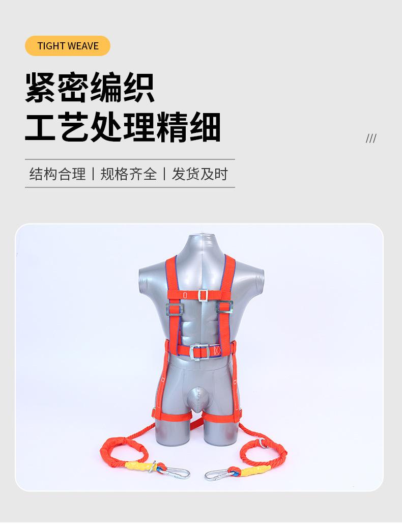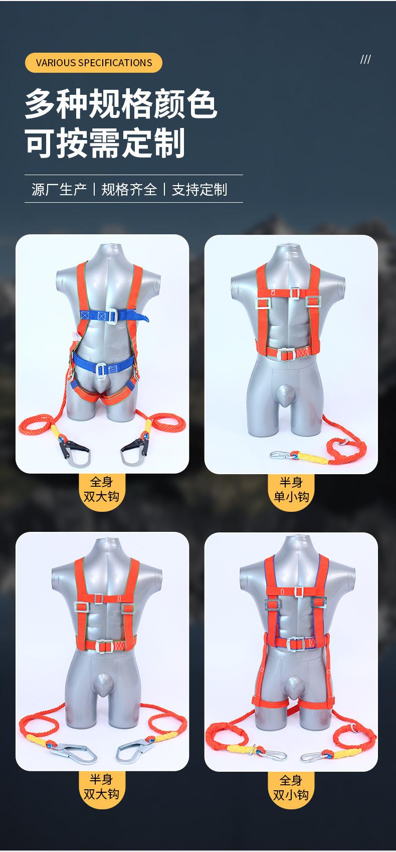 Arnés de cuerpo completo, que le brinda soporte de seguridad para todo el cuerpo, ya no como el tipo de medio cuerpo que se desliza fácilmente: con unoPunto de conexión de suspensión con anillo en D, se puede conectar fácilmente a la cuerda de seguridad; utilizamos cinta de poliéster de alta resistencia de 45 mm de ancho, resistente al solMoler NAIResistente a la intemperie, y también de muy alta resistencia, la pequeña resistencia a la rotura de una sola cinta puede alcanzarAlrededor de 3 toneladas.